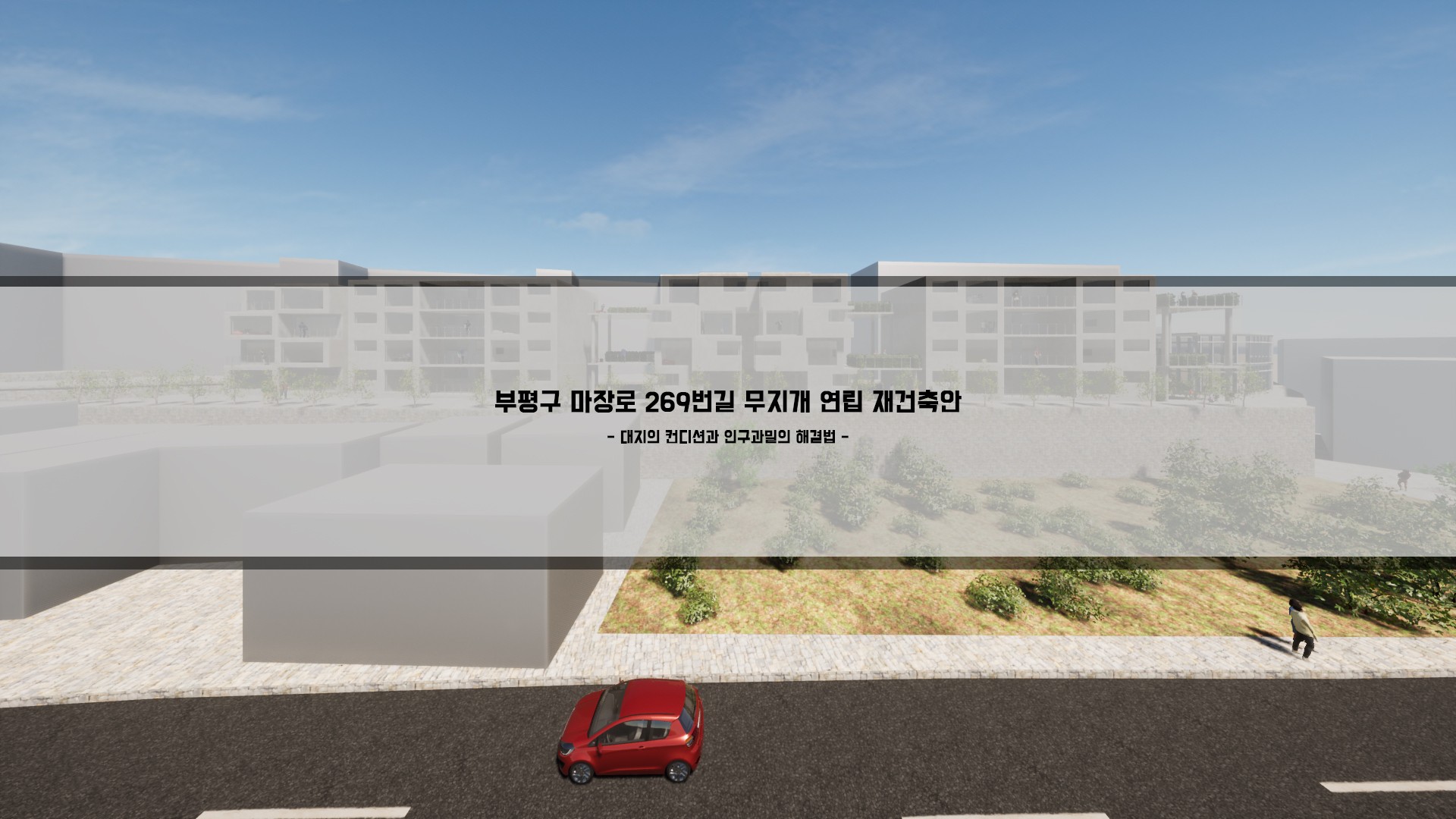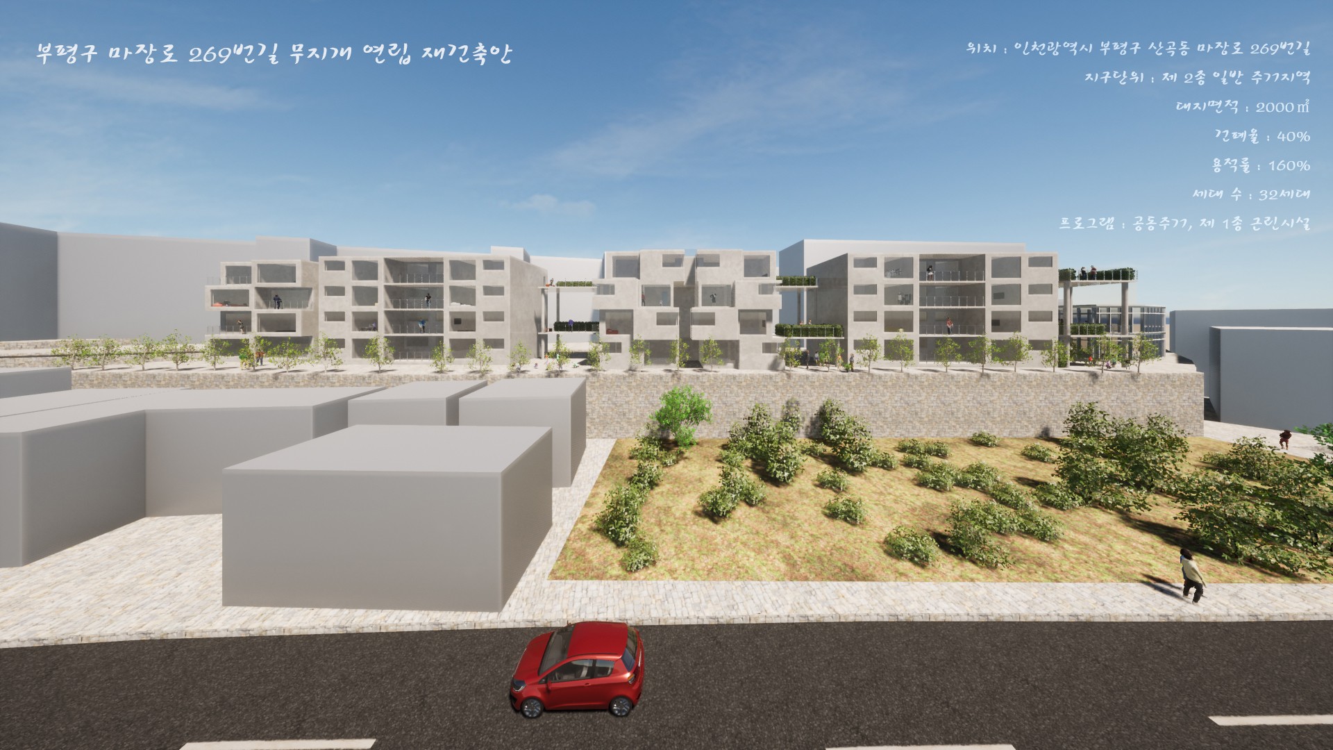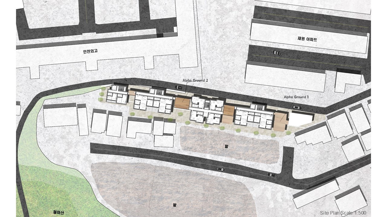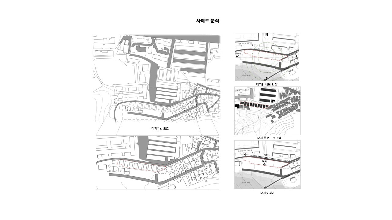 그 중 한 곳인 부평구 마장로 269번길 대지의 가로폭 120m 세로폭 14m로 세장형 형태의 대지를 사이트로 선정 후 재건축안을 진행하였다.