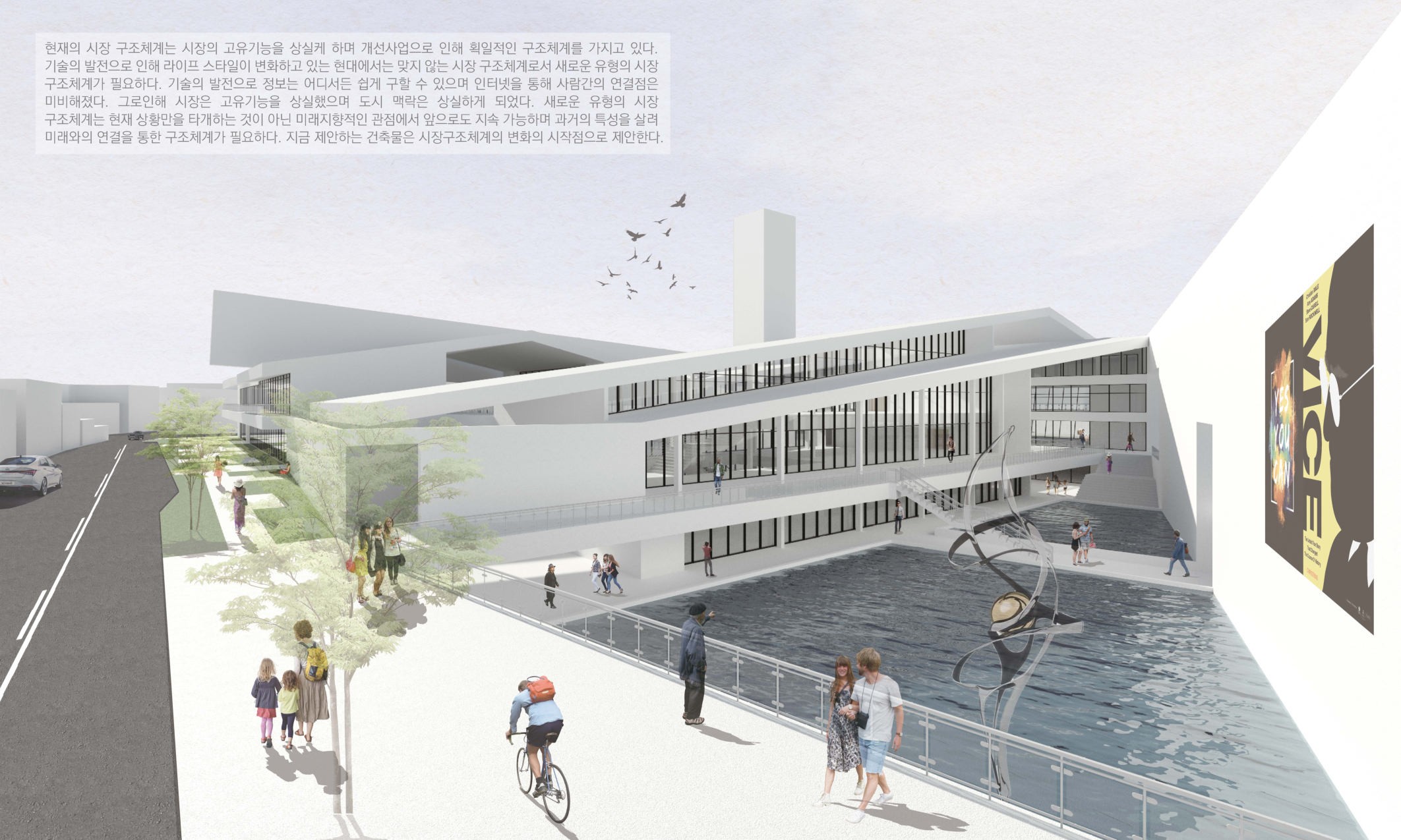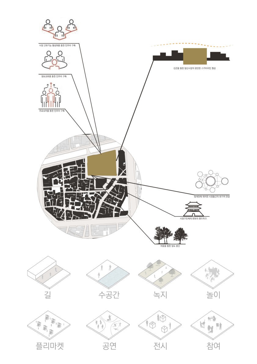 전통시장은 오랫동안 근린의 소매유통 중심지로서 사회문화적 활동과 정보 교류 공간으로서 기능을 담당해왔다. 하지만 현대에 들어서 기술의 발전과 생활양식의 변화로 인해 전통시장은 크게 쇠퇴하였으며 고유기능을 상실하게 되었다. 현재 시장 개선사업은 시장의 특성을 고려하지 않은 획일적인 개선 방안으로 인해 뚜렷한 성과가 없으며 전통시장의 다양성을 고려하지 않은 계획으로 인해 도시의 맥락이 사라졌으며 특색이 사라진 시장으로 변모하고 있다. 청계천에 위치한 시장들 간의 유기적인 연계를 통해 인프라를 구축하며 각 시장의 특성을 활용하여 생산자와 소비자 간의 경계를 허물고 지속가능한 새로운 시장구조체계 유형을 제안하려 한다.