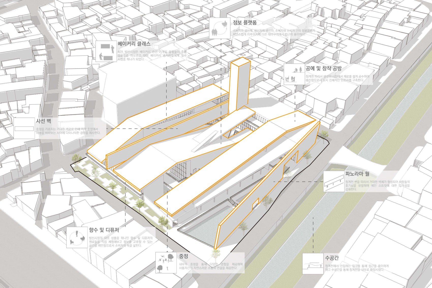 방산시장은 다양한 원자재를 판매하기 때문에 생산자와 소비자가 한정적이다. 방산 플랫폼은 생산자와 소비자 사이에 프로슈머 및 아티스트를 통해 인프라를 구축하여 한정되어 있는 이용자를 늘리며 방산시장의 새로운 구조체계로서 상업 및 정보교류 센터로서 지속적인 영감과 문화적 경험을 제공하는 공간으로 역할을 제공한다.