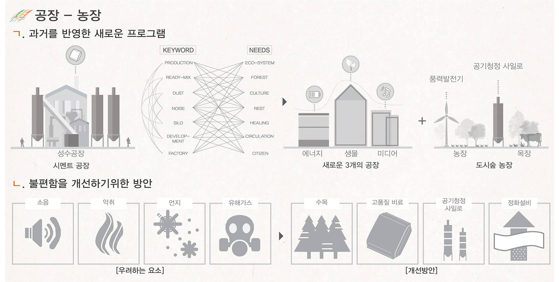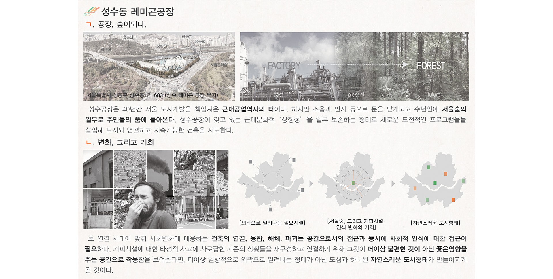 성수공장은 40년간 서울 도시개발을 책임져온 근대공업역사의 터이다. 하지만 소음과 먼지 등으로 문을 닫게되고