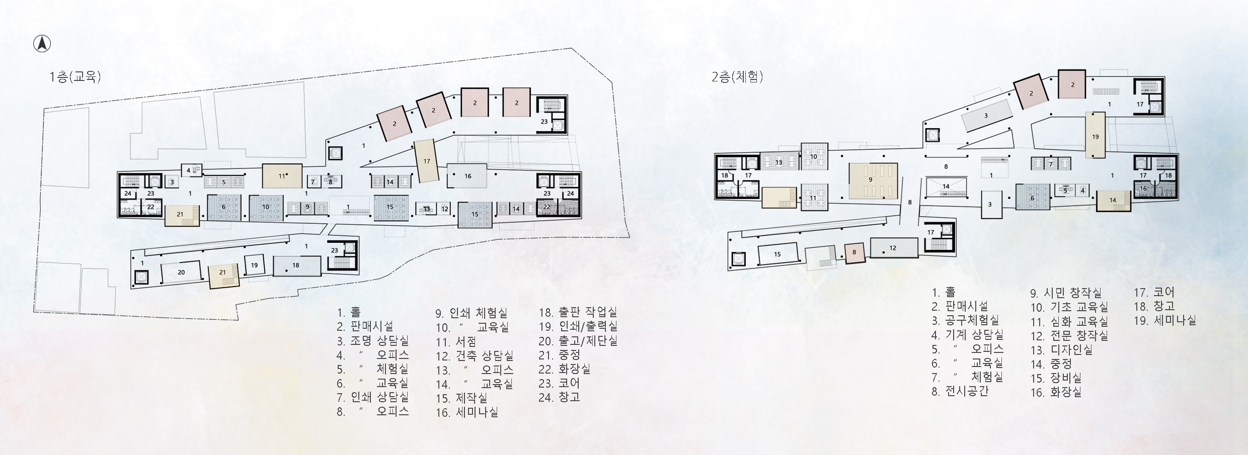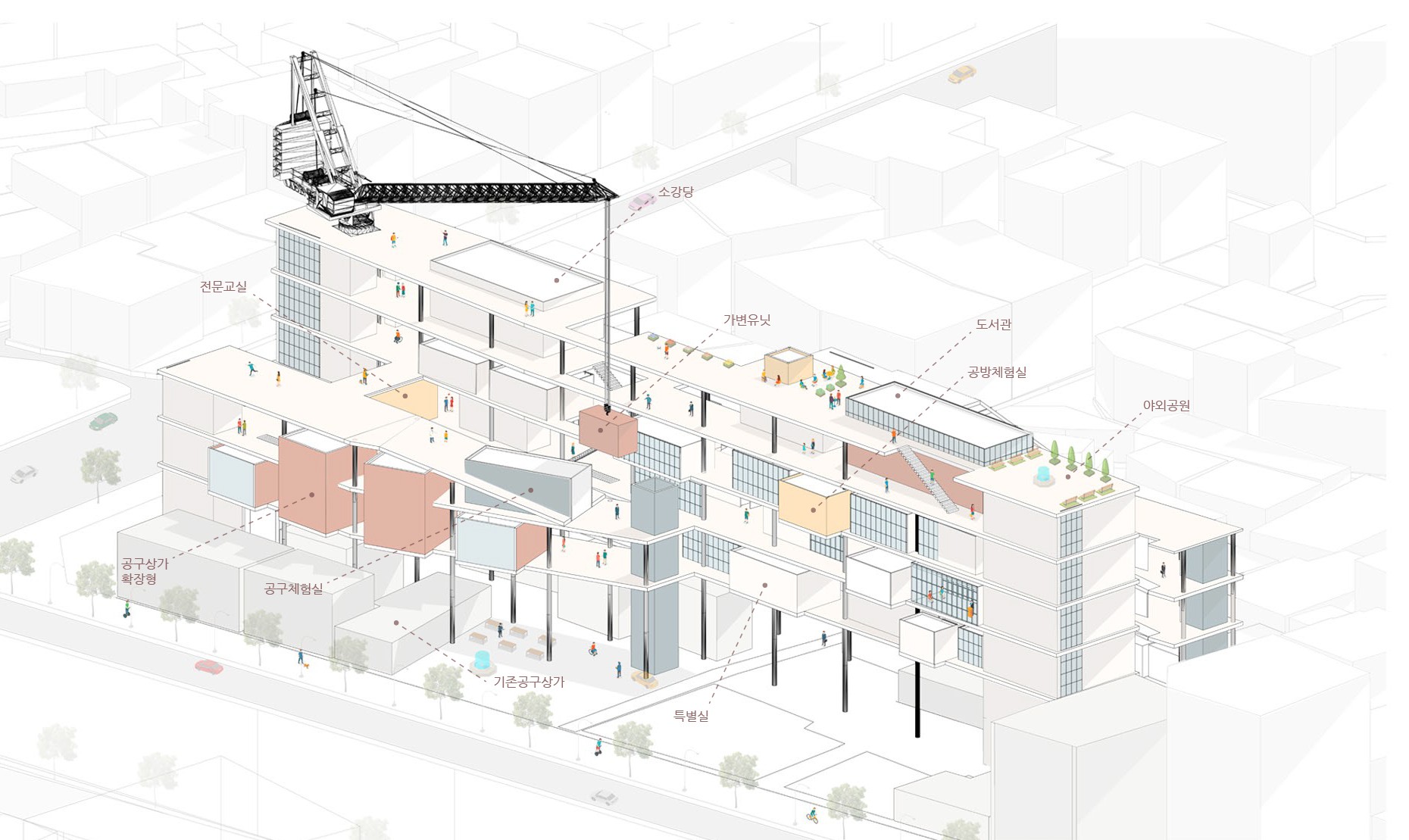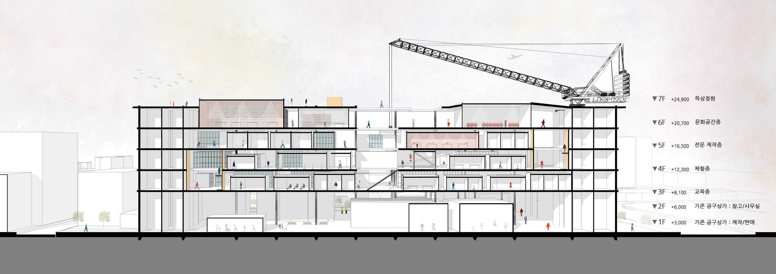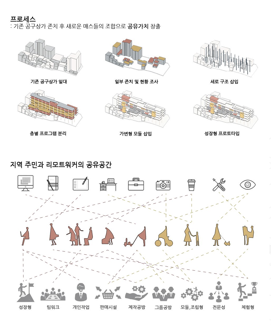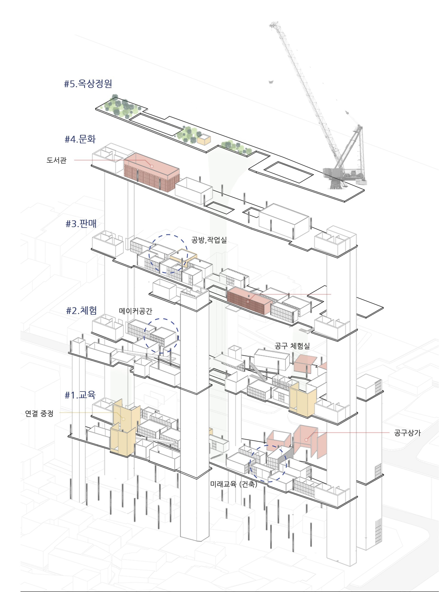 2문단 : 원격 근무와 재택 근무를 통칭하는 '리모트 워커'와 주민들의 교류를 통한 지역 발전 활성하를 위해, 청계공구상가 일대의 제조업 생태계를 문화 및 교육 시설로 활성화 하며, 리모트 워커를 위한 주거 유닛 타입 삽입 하고자 한다.