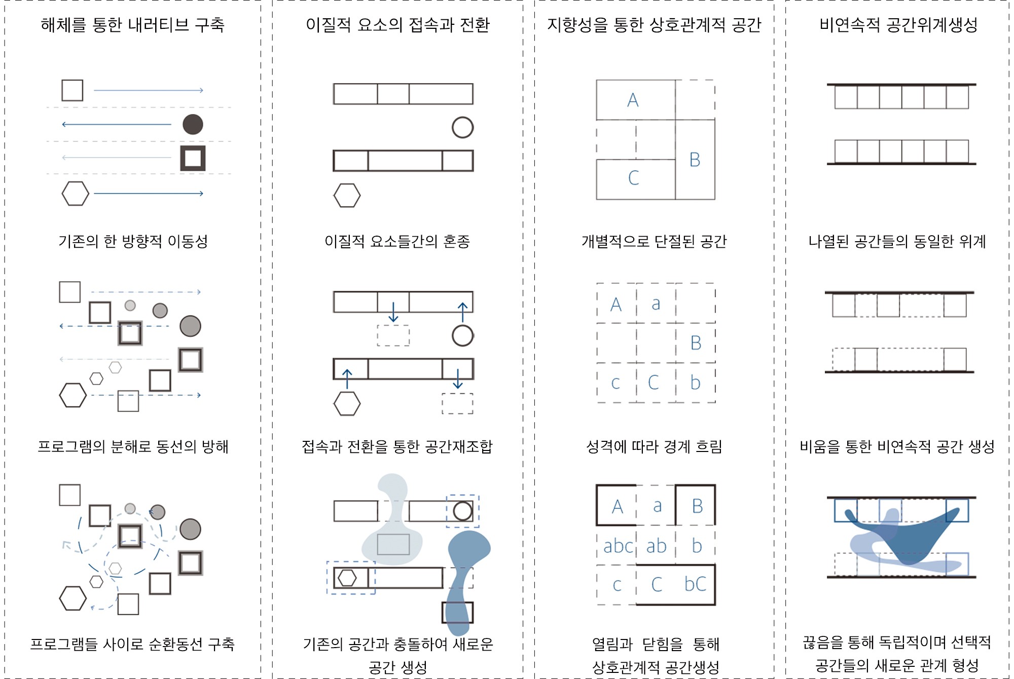 서로 다른 특성을 지닌 공간이 고유한 속성을 유지하며, 다른 공간과 지속적인 관계를 맺고 모여야 한다.