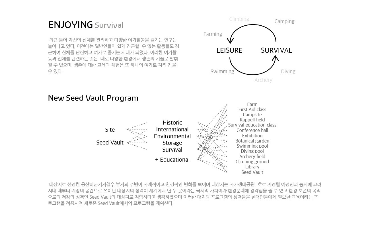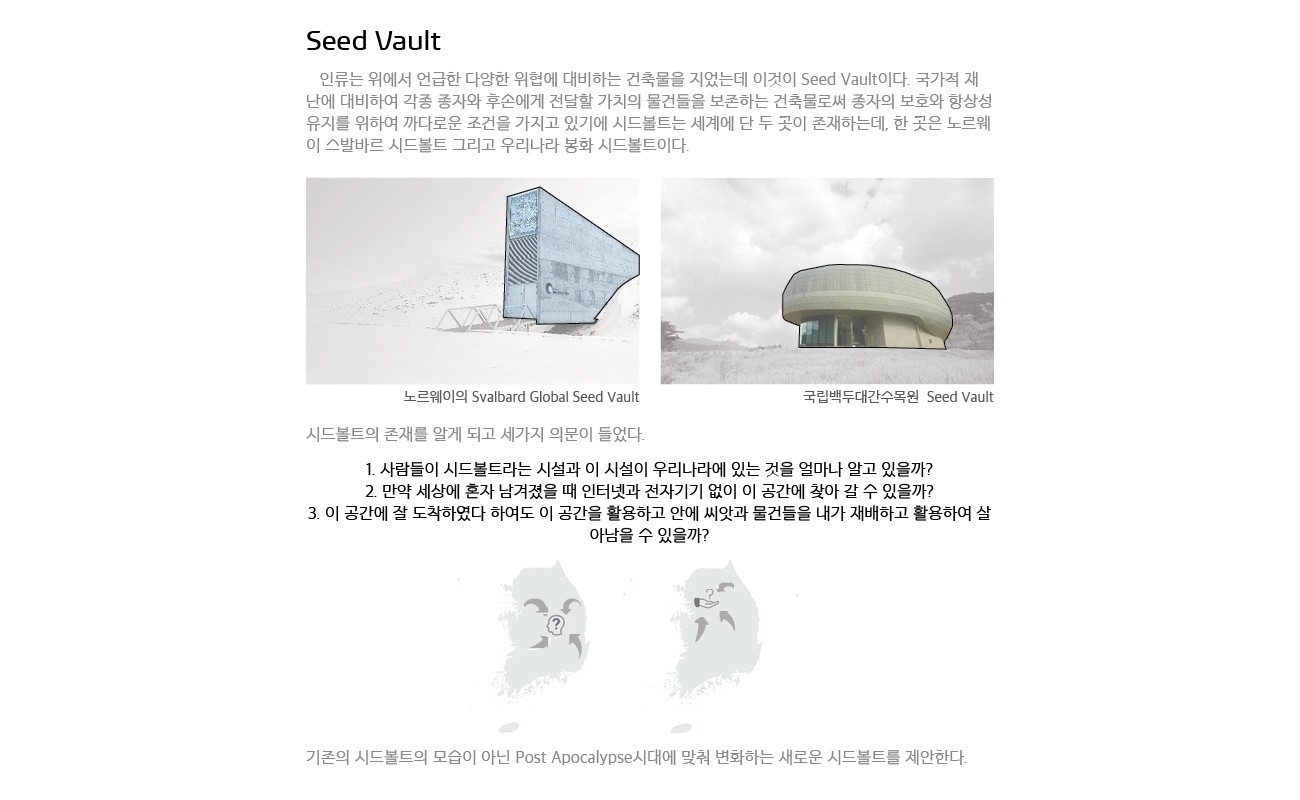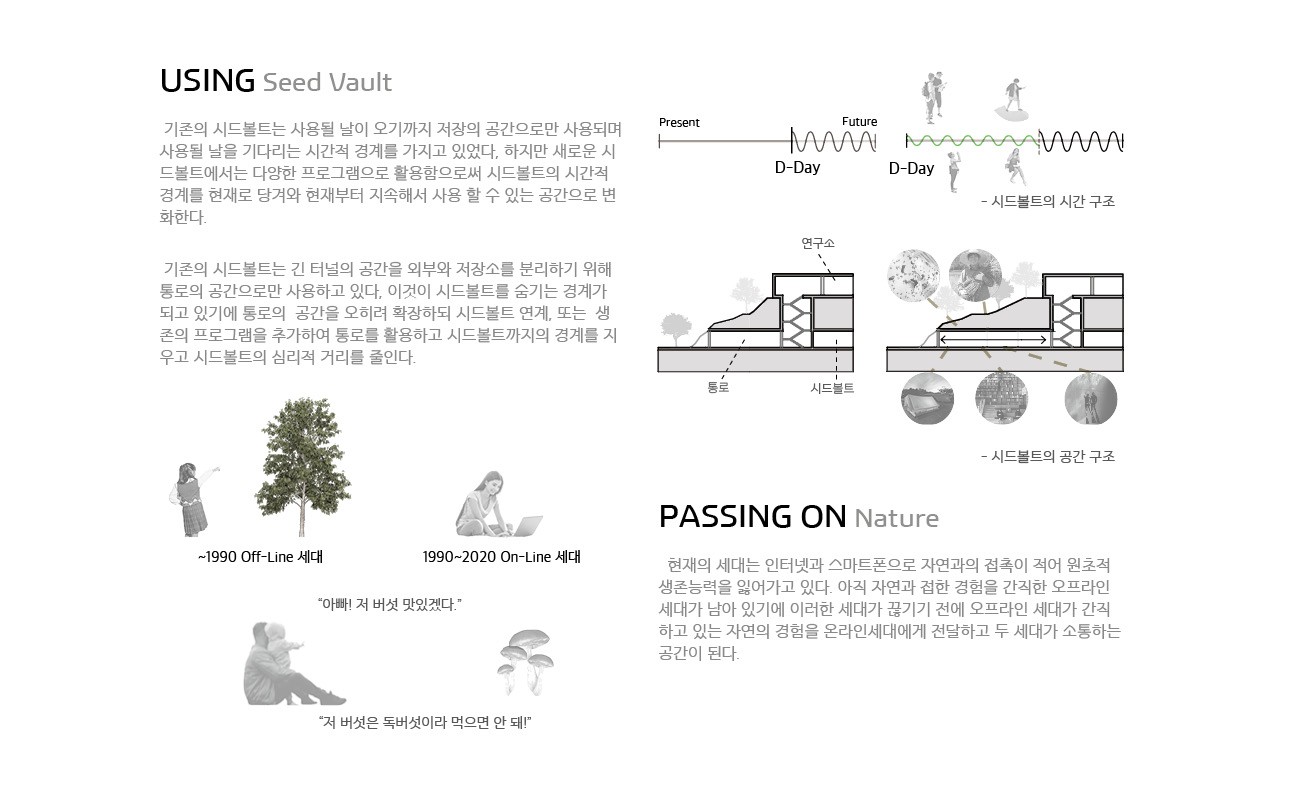 기존의 시드볼트의 모습이 아닌 Post Apocalypse시대에 맞춰 변화하는 새로운 시드볼트를 제안한다.