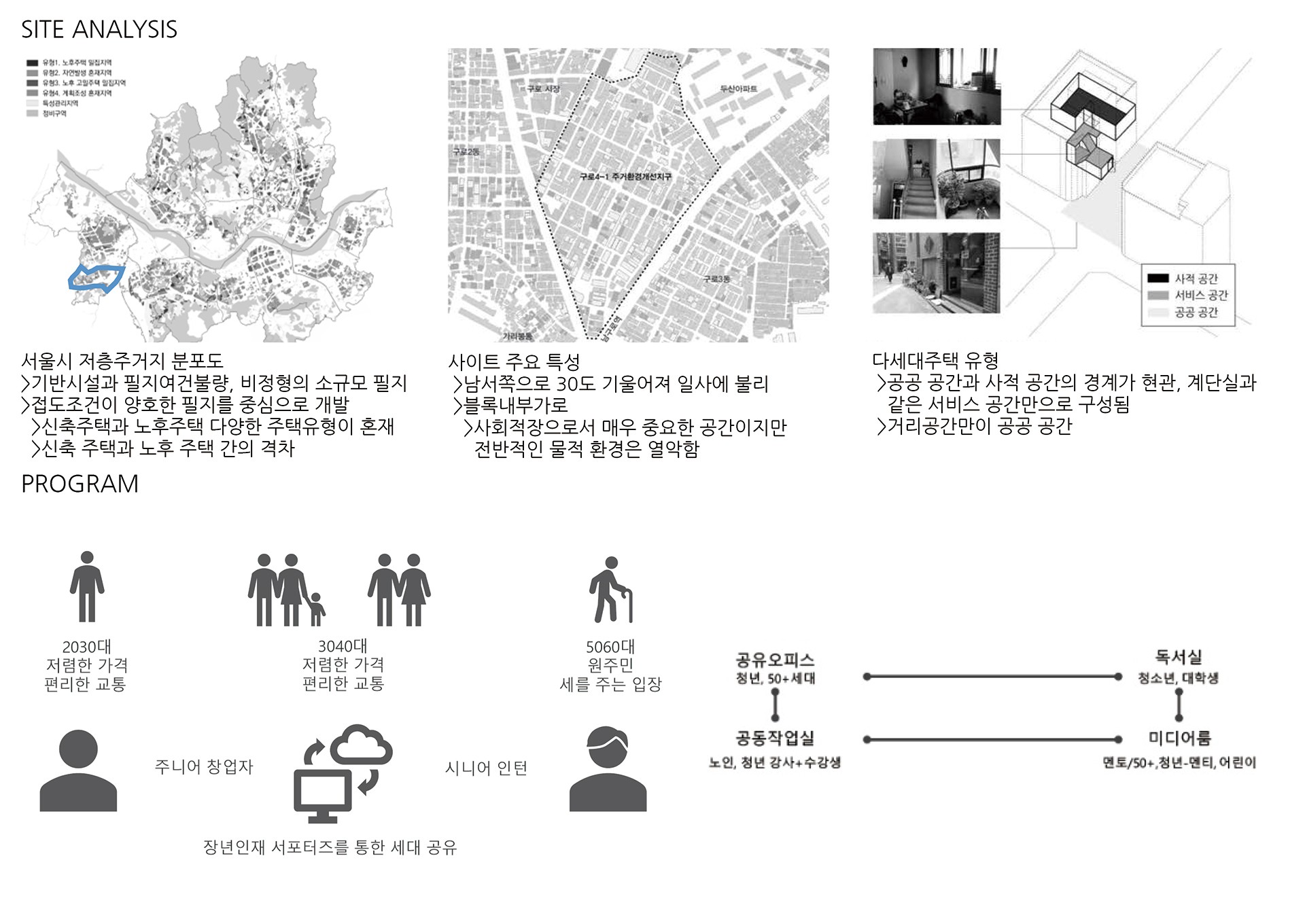 이러한 특징들을 토대로 저층주거지의 환경이 얼마나 열악하고 재개발이 필요한 실정인지를 알 수 있다.