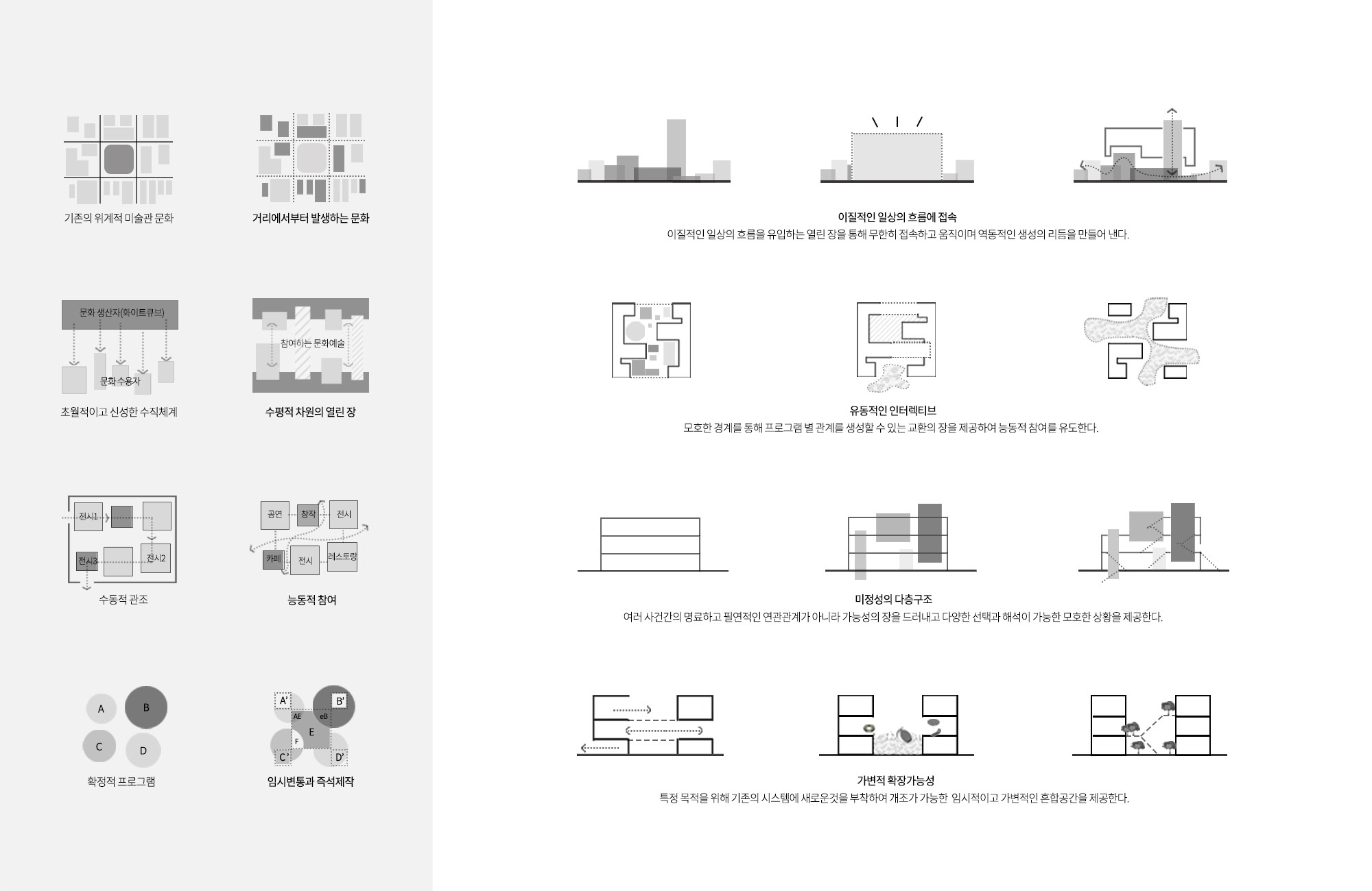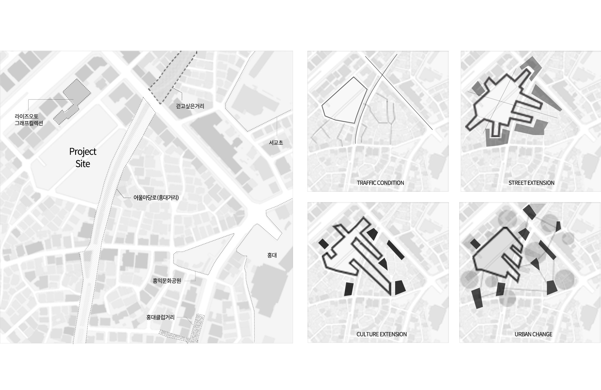 설치, 미디어, 퍼포먼스 등의 다양한 길거리 문화들이 혼재되어 있어, 수용 가능한 것들을 최대한 활용해 새로운 관계를 형성할 수 있는 가능성의 장소인 홍대거리를 대상지로 선정하였다. 도시와의 경계가 허물어진 열린텍스트의 환경 속에서 거리로부터 발생하는 즉시적 문화예술은 관계생성적 교환의장으로써의 미술관과 지속적인 만남이 일어난다. 능동적인 참여로 인해 만들어지는 관객중심 미술관은 개인의 창조적 욕망을 자극하며 새로운 일상의 리듬으로 재구성되어 문화예술이 녹아있는 능동적인 도시 공동체 네트워크를 구축할 것이다.