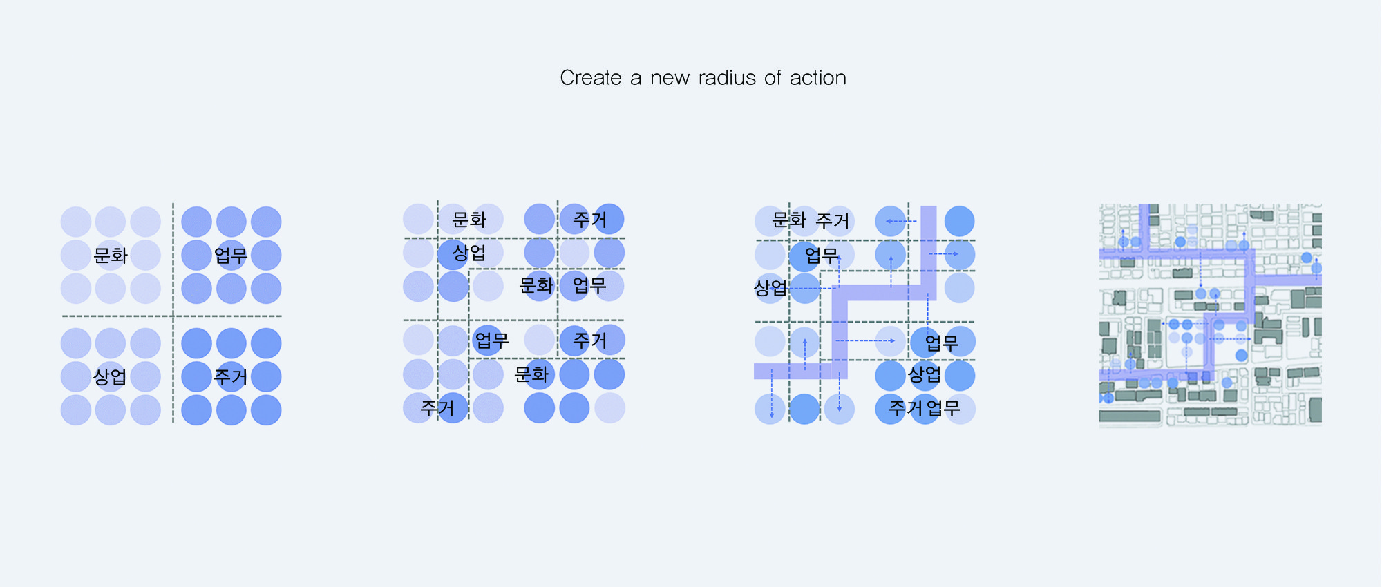 또한 외부는 상업블럭, 주거블럭, 업무블럭 등의 단일한 경계로 구역이 나눠져 있어 사람들은 고착화된 일상을 겪게 된다.