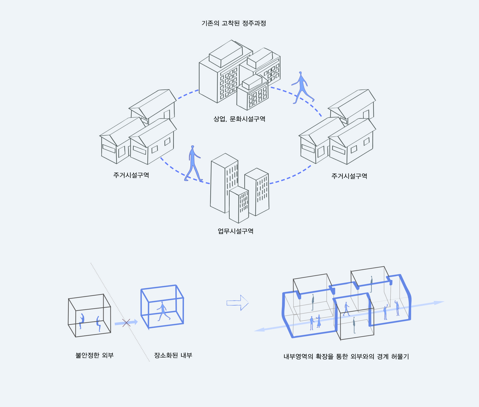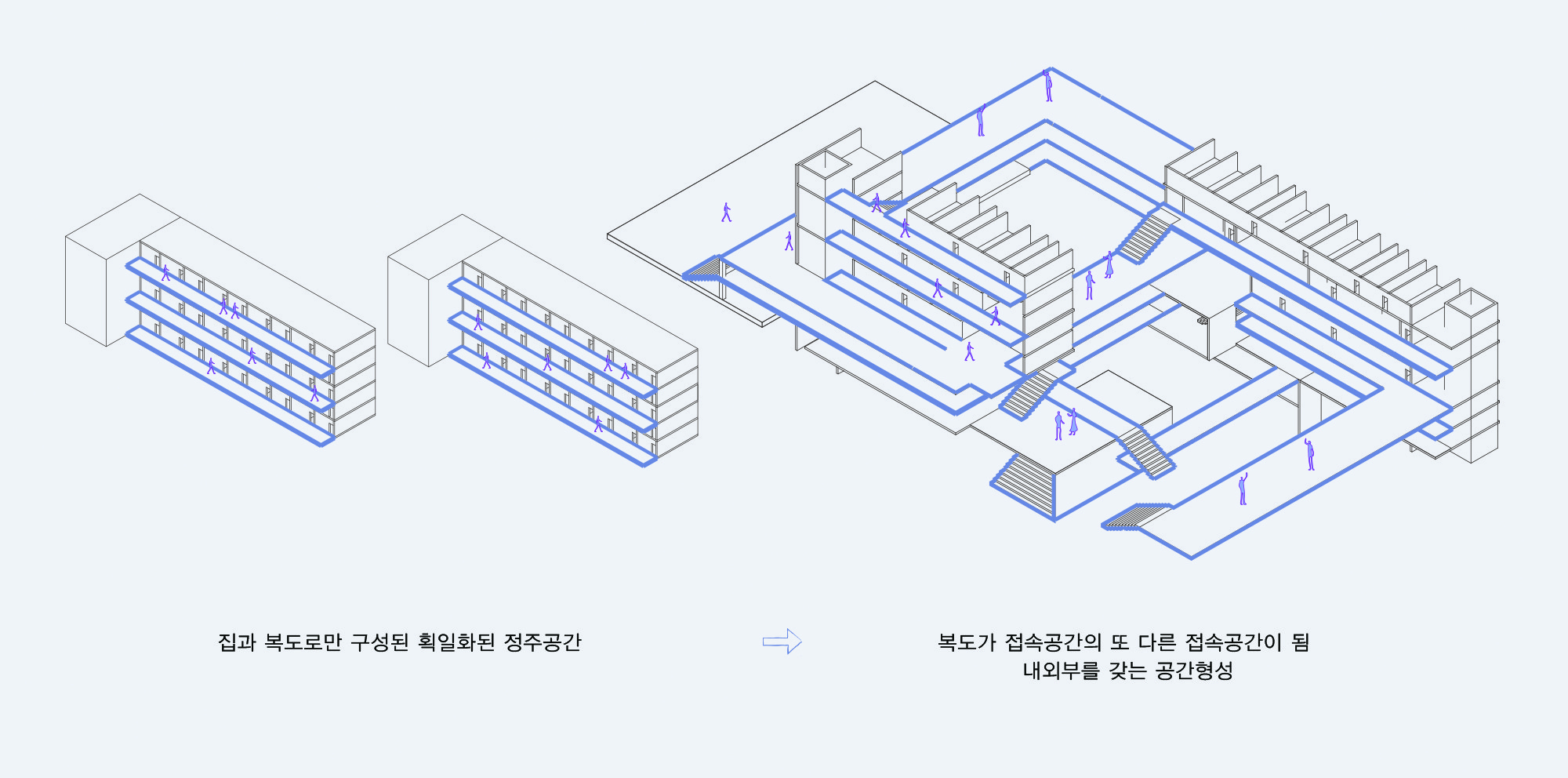기존공간들의 결합은 밀집된 수직체계와 정형화된 활동단계로 소통의 단절과 고립을 초래했다.