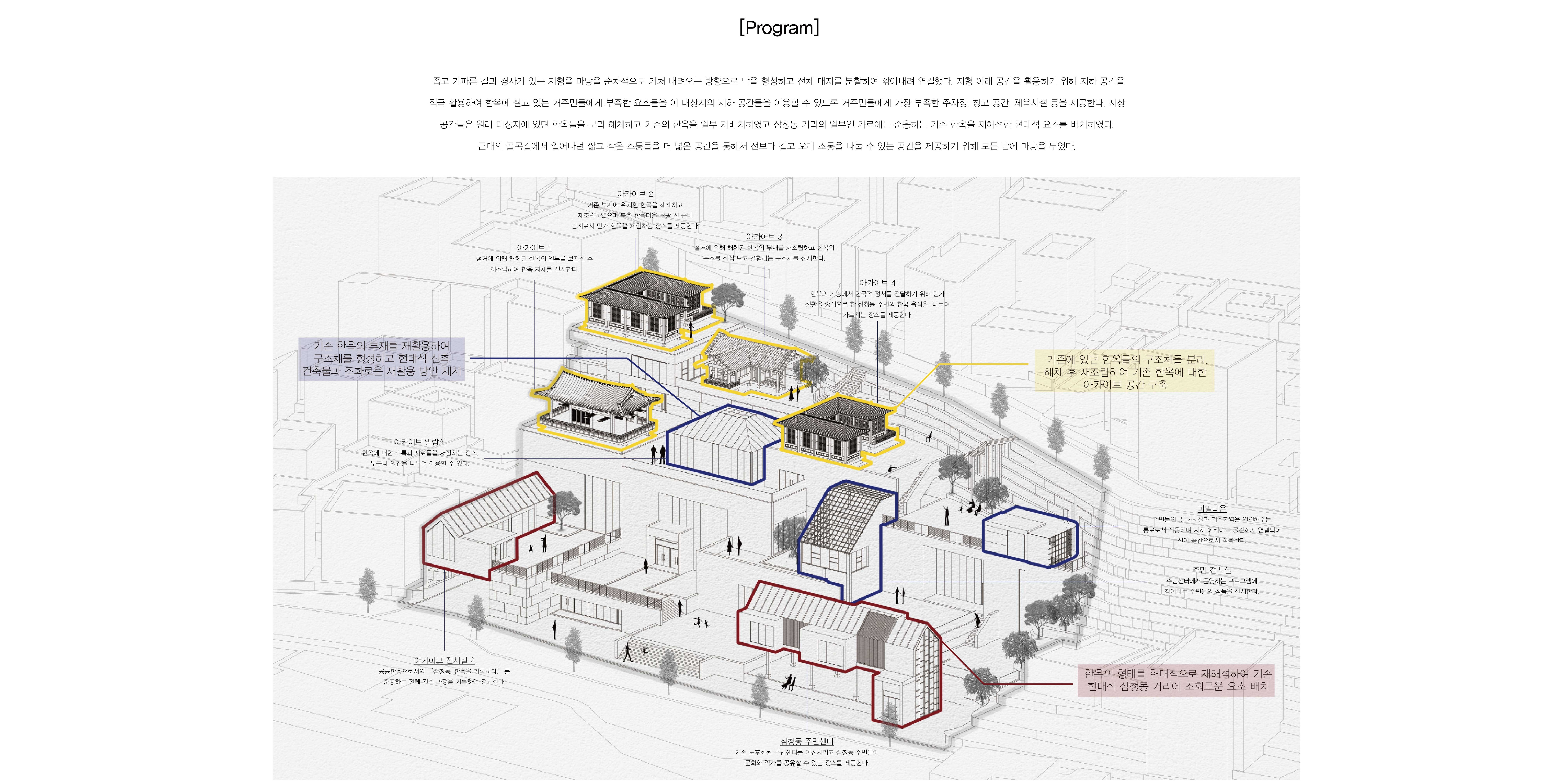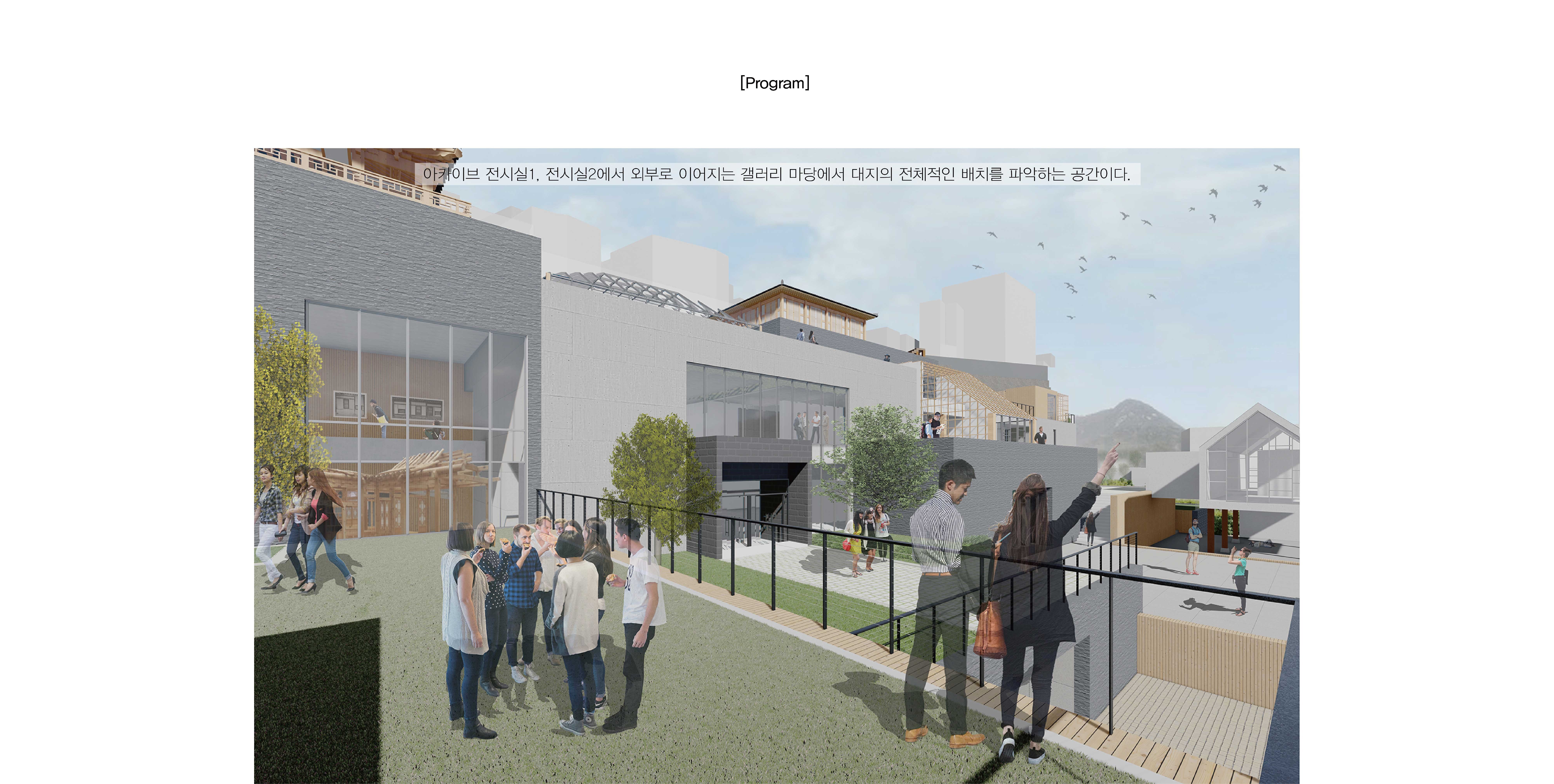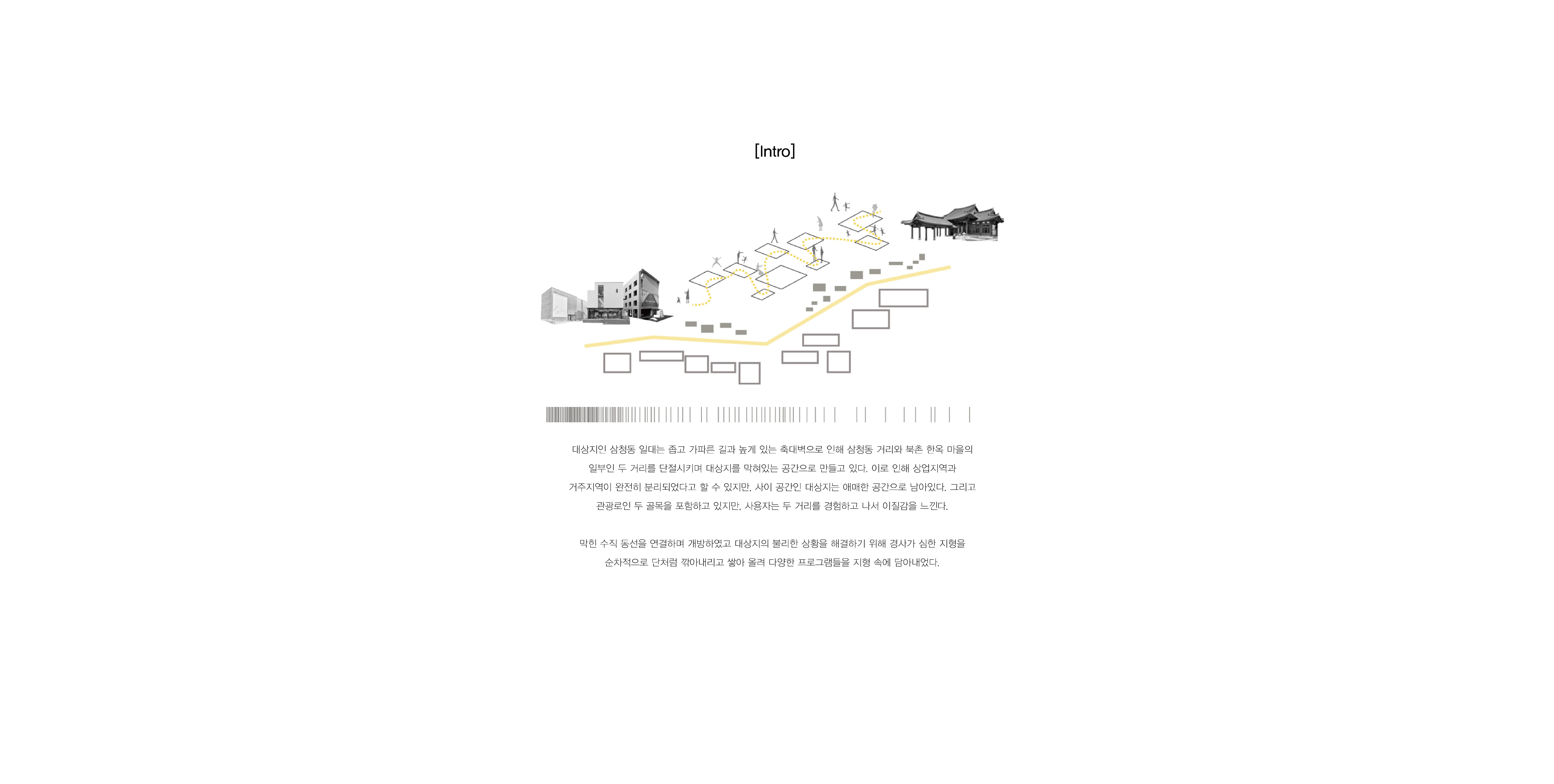 사람들은 산책이라는 요소를 통해 조금은 여유롭게 목적이 없는 공간들을 배회하게 되고, 여유롭게 휴식을 취하며 주변을 둘러볼 수 있다. 삼청동 주민들의 생활 조건을 향상시키고 전시를 만나기 위해 아카이브 존의 필요성, 역사 속에 사는 개념을 제안하고 주민들은 여가를 교환하고 여러 개의 단을 설정하고 연결하여 주민들과 관광객이 자유롭게 느끼도록 기억력, 지역 주민들의 생활 여건를 향상시키고 아카이브 존의 필요성을 충족시키기 위해 역사 속의 일상 생활의 개념을 제안한다. 지역 주민들이 소통하고 놀기 좋은 장소가 될 수 있는 공간을 기대한다.