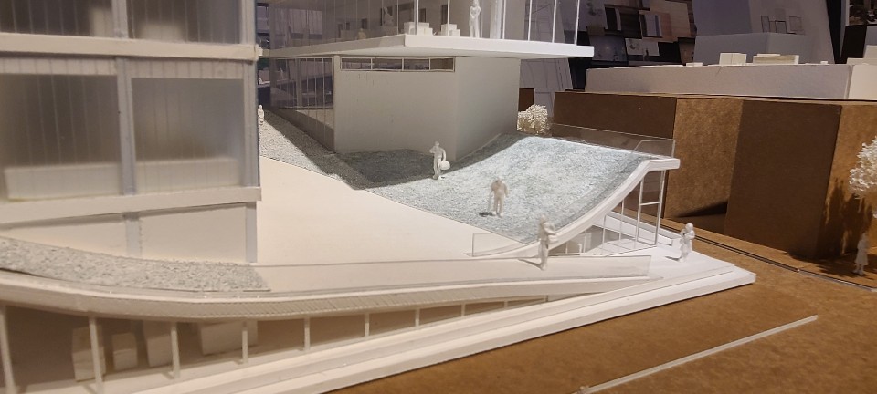 방안에서 신축건물과 구 건물을 이어주는 경사녹지 지붕의 형태가 나왔으며 이 지붕으로 인하여 사람들은