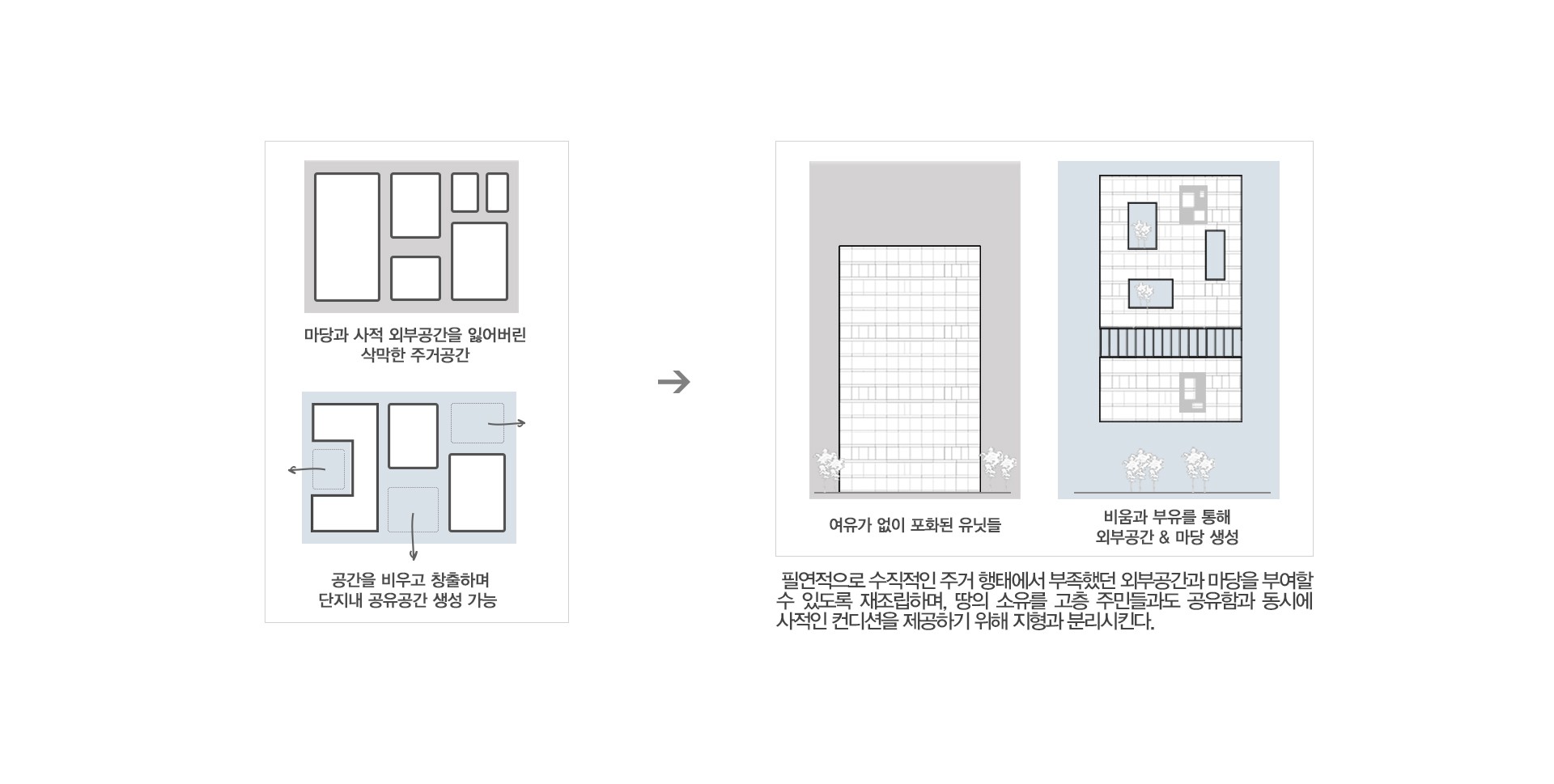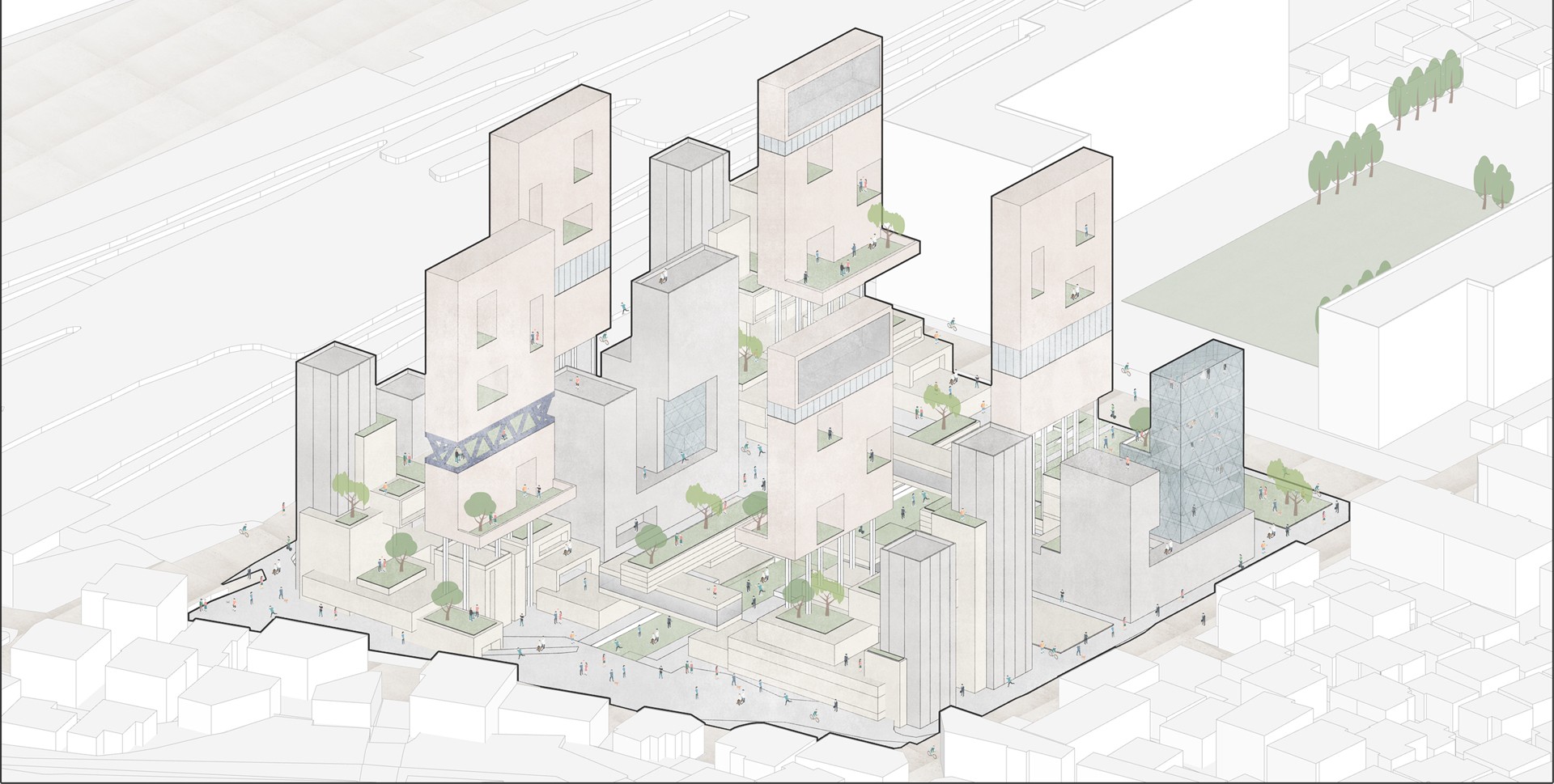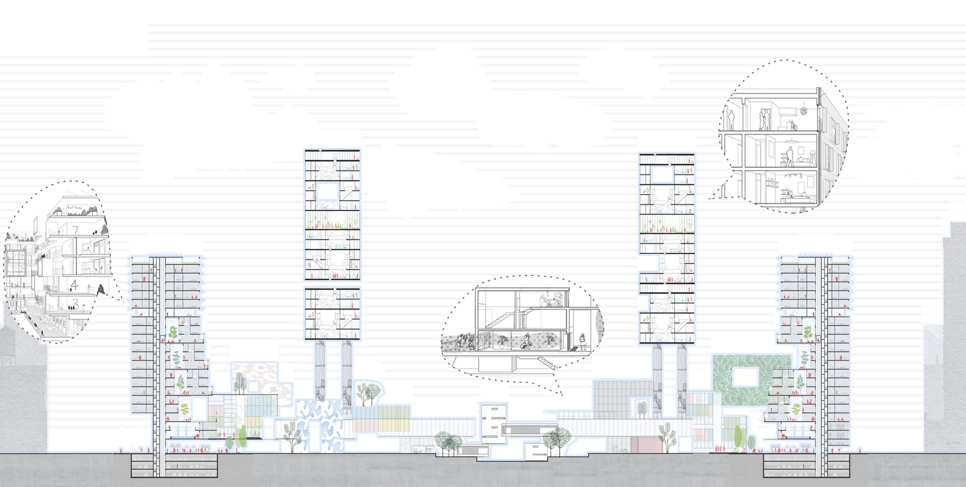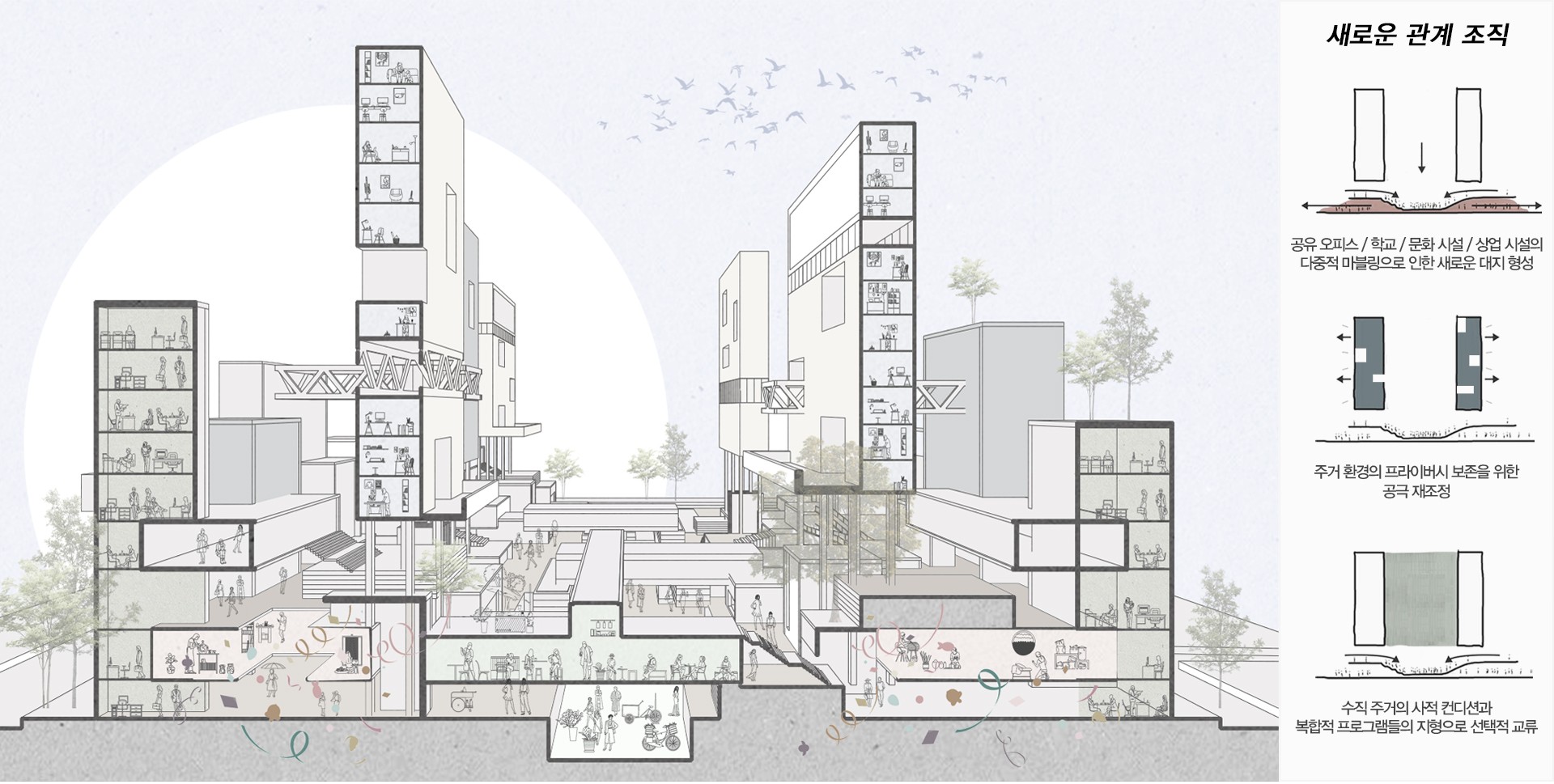 바뀐 라이프스타일에 맞게, 이제는 업무, 문화, 교육 등 다양한 일상적 공간들과 세트가 된 큰 범주의 새로운 주거의 틀이 요구된다. 그 안에서 공존하면서도, 기능적으로 구분되어 주거의 사적인 컨디션을 보호해야 할 것이다. 즉, 위계적 으로 혼종된 새로운 복합 주거 구조가 필요하다. 이렇게 하나된 시스템은 새로운 형식의 셀을 구축하며, 코로나 시대에 생활의 중심 거점이 될 것이다.