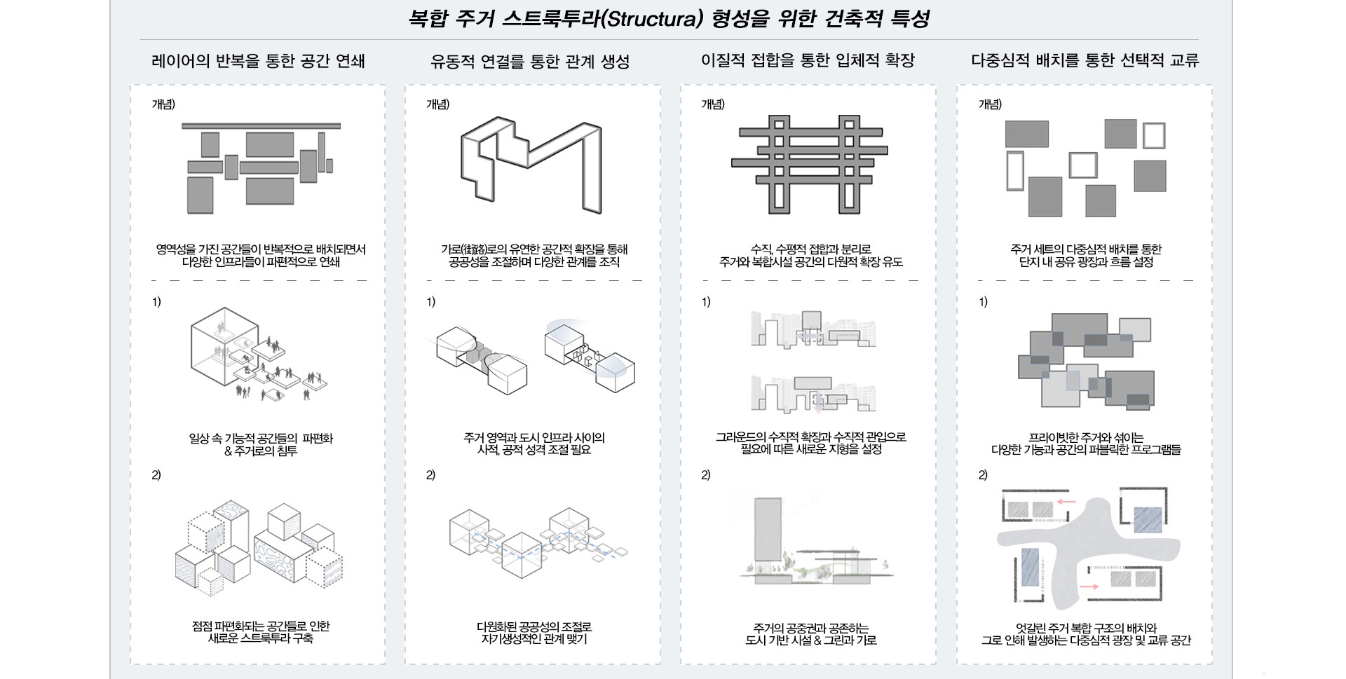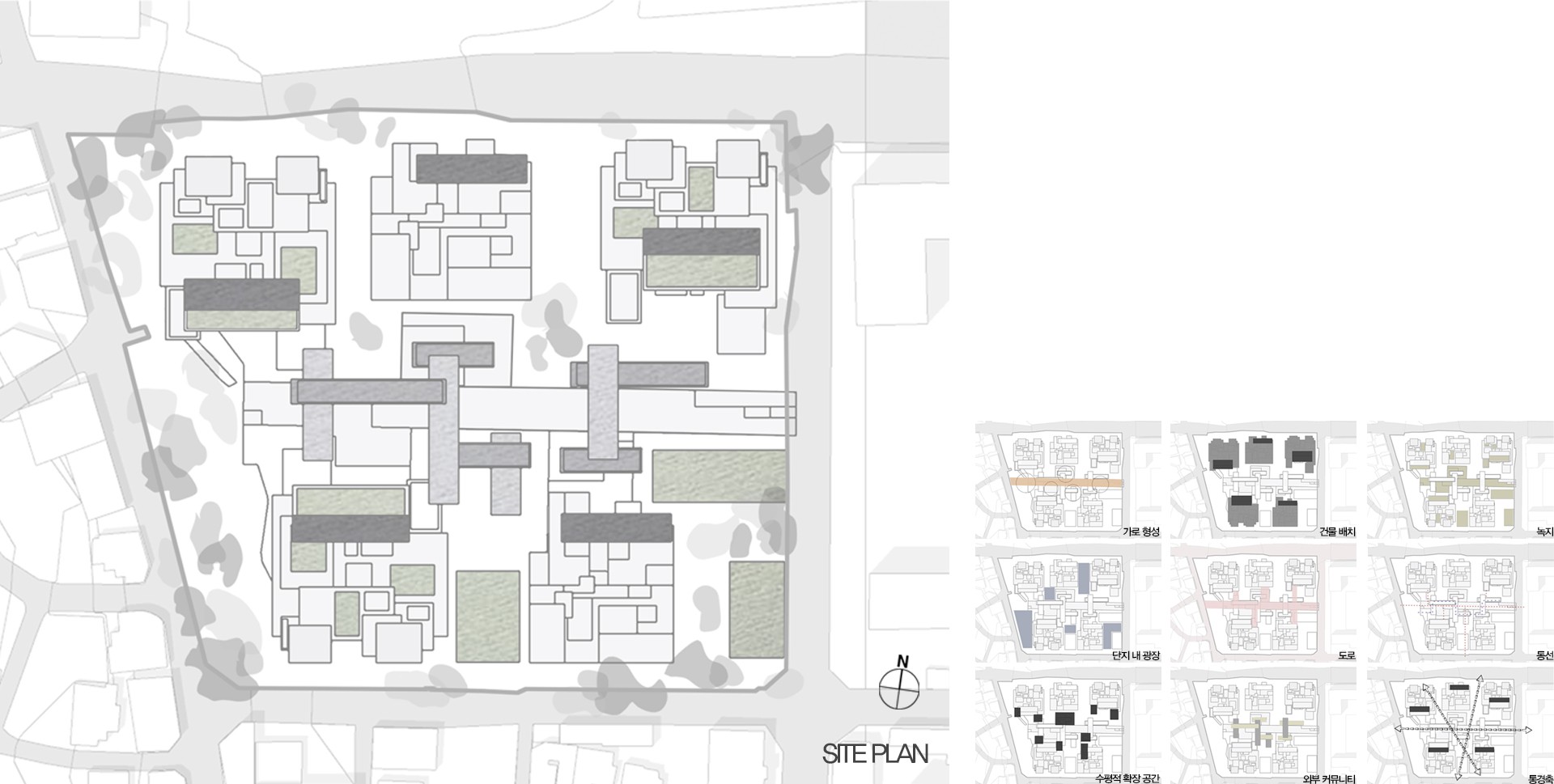 주거 근처로 기능과 공간이 모여 만들어진 하나의 셀은, 도시에서 다양한 방식으로 배치된다. 셀끼리 마주보며 그 사이에 공적인 마당과 오픈 스페이스를 형성하고, 셀들이 연속되며 마을의 가로를 형성하고, 셀들이 조합되고 자리잡는 방식으로 새로운 도시 패턴을 만들 것이다. 단지마다의 자생적 환경을 구축하며, 도시적 체계를 제공하는 새로운 주거 형식을 제안한다.