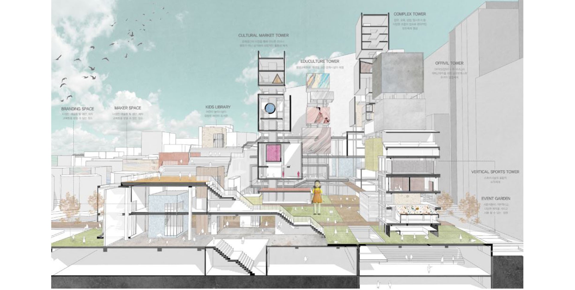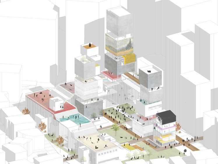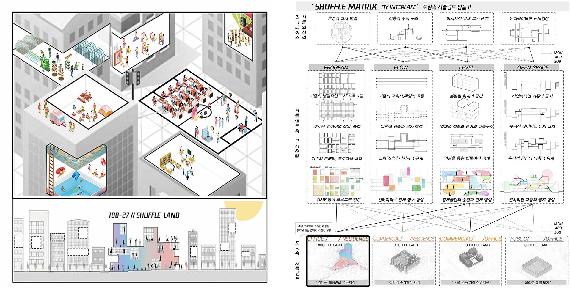 서로를 마주보면서 교류하는 이전의 방식이 아닌 현 시점에서 필요한 새로운 소통방식이 필요하다. 현대의 도시에서 밀도의 조율을 이루어 낼 건축적 장치를 통해 이질적이고 다양한 공간속의 사람들과 필요에 의한 공간들을 더하고 덜어내면서 , 하드웨어적으로 한계가 있는 고착된 도시공간속의 유연함을 불어넣어, 도시는 공간의 물리적인 밀도 뿐만 아니라, 사람들의 활동영역과 새로운 공간으로 채워진다.