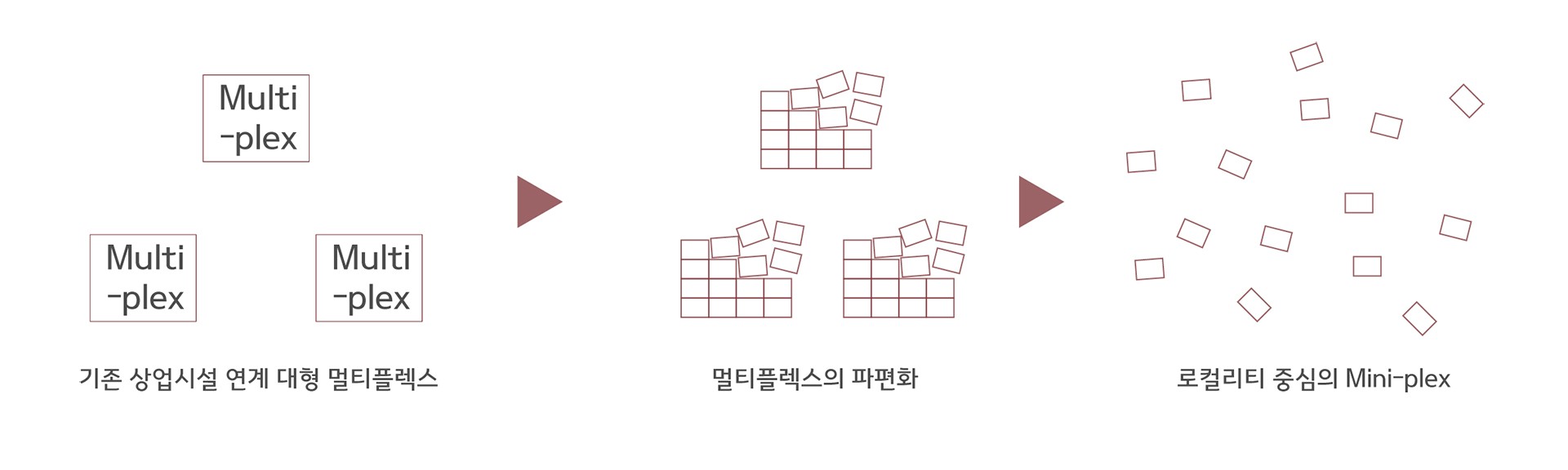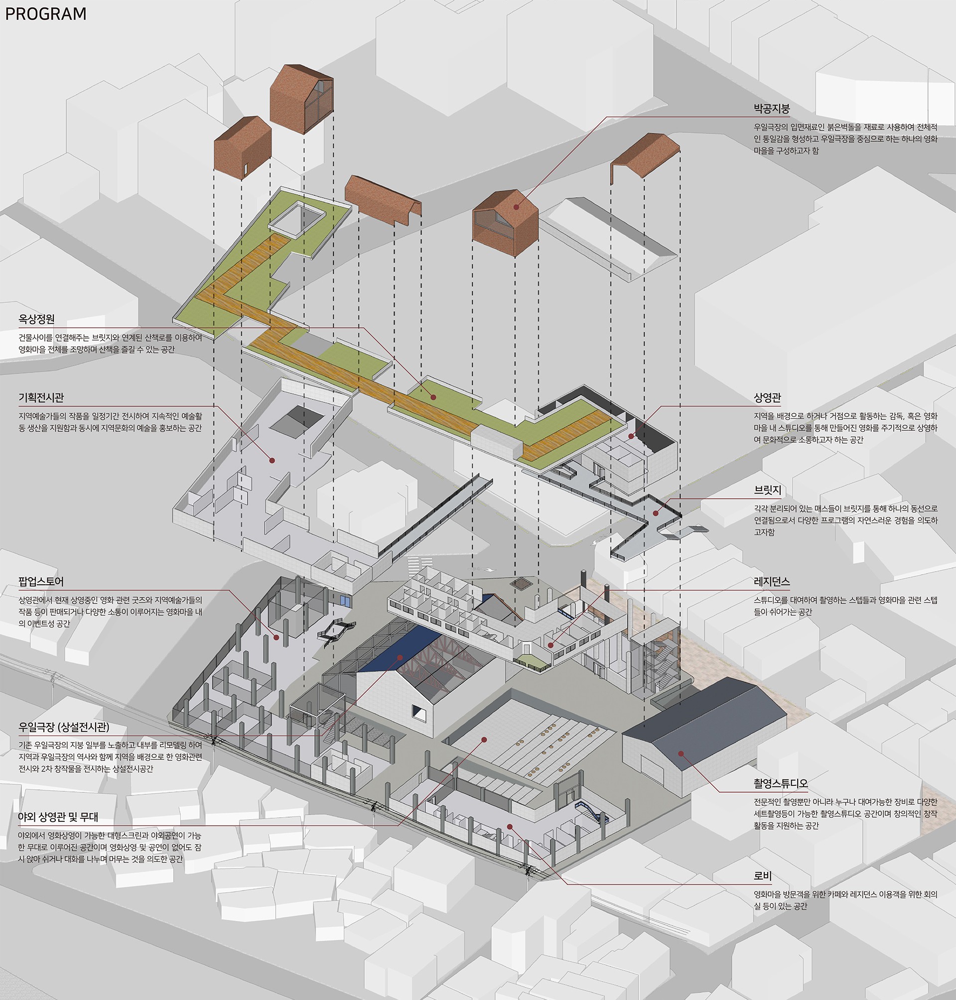 사람들은 대부분의 문화시설을 즐기기 위해 모든 상업, 문화시설이 모여있는 '멀티플렉스'로 향한다. 하지만 코로나로 인해 대규모의 사람들이 모이는 것이 껄끄러워진 지금, 각 지역이 가진 장소성을 이용하여 도시의 멀티플렉스를 각 동네의 '미니플렉스'로 퍼트리는 새로운 방식의 문화 공간을 제안한다.