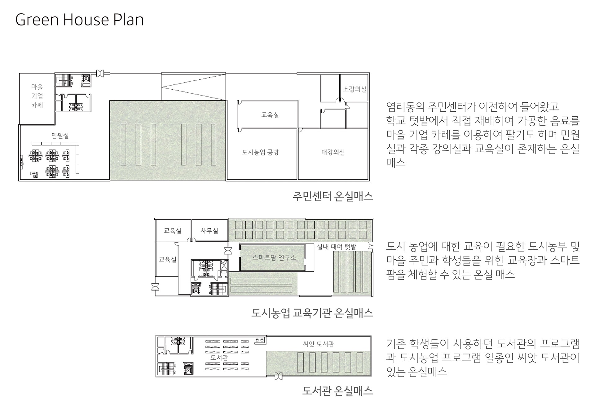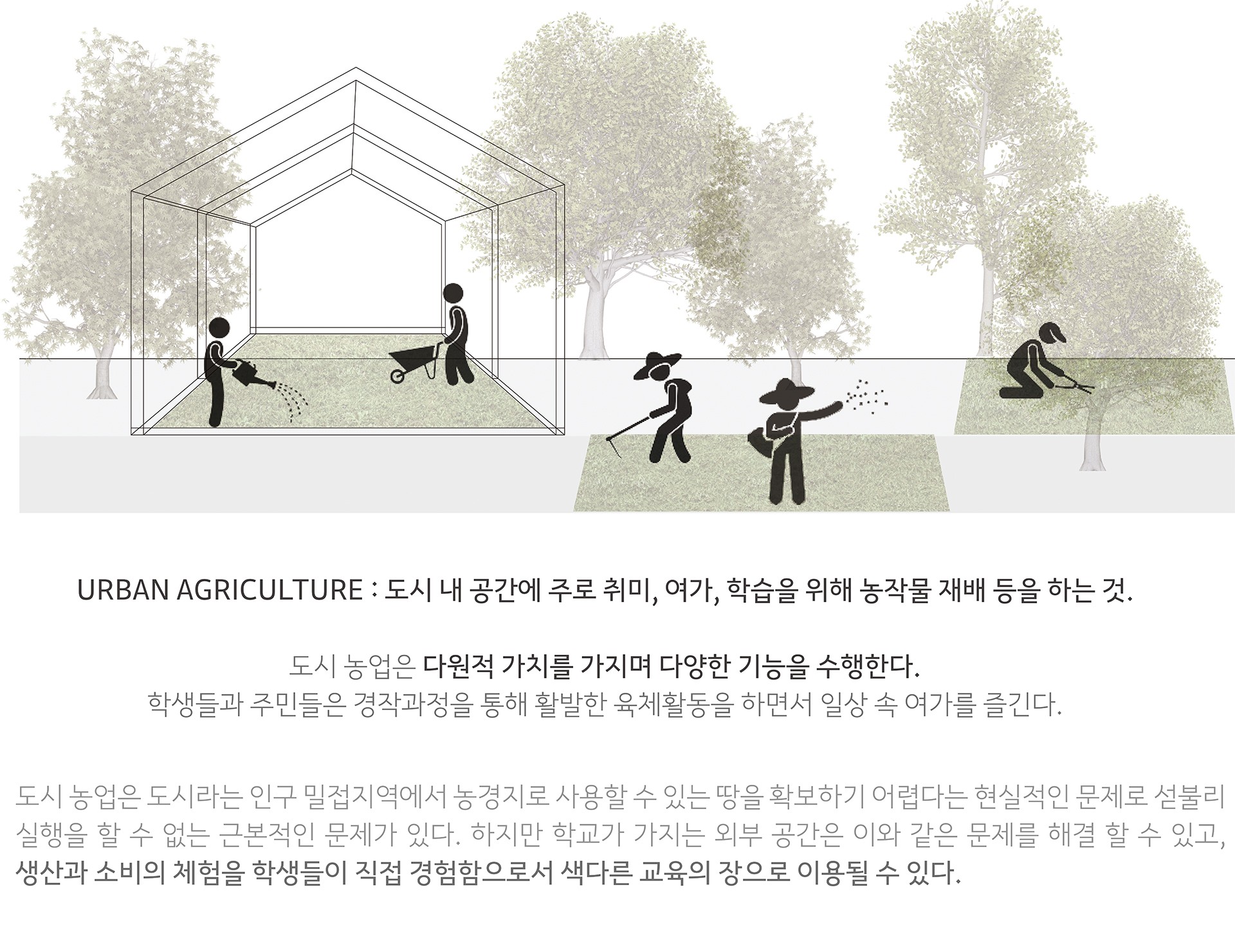 URBAN AGRICULTURE(도시 농업) “도시 내 공간에 주로 취미, 여가, 학습을 위해 농작물 재배 등을 하는 것.”도시 농업은 다원적 가치를 가지며 다양한 기능을 수행한다. 학생들과 주민들은 경작과정을 통해 활발한 육체활동을 하면서 일상 속 여가를 즐긴다. 도시 농업은 도시라는 인구 밀접지역에서 농경지로 사용할 수 있는 땅을 확보하기 어렵다는 현실적인 문제로 섣불리 실행을 할 수 없는 근본적인 문제가 있다. 하지만 학교가 가지는 외부 공간은 이와 같은 문제를 해결 할 수 있고, 생산과 소비의 체험을 학생들이 직접 경험함으로서 색다른 교육의 장으로 이용될 수 있다.