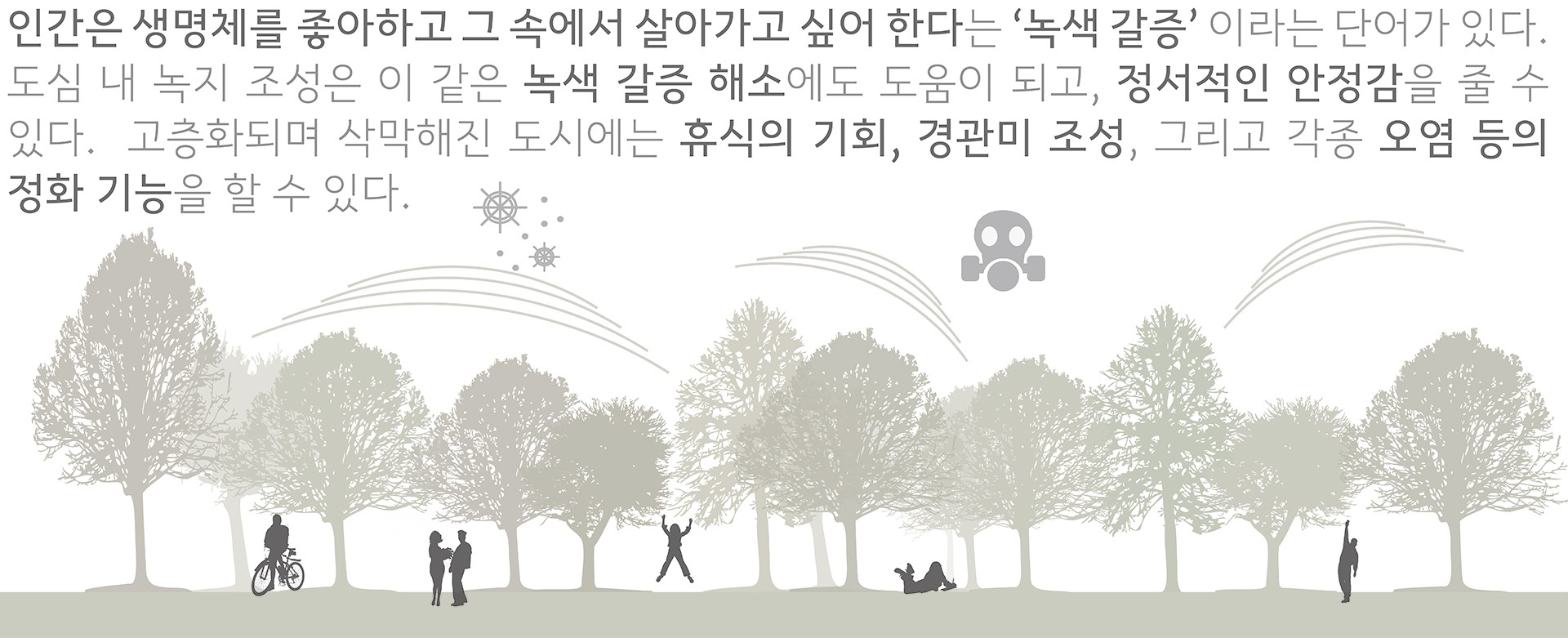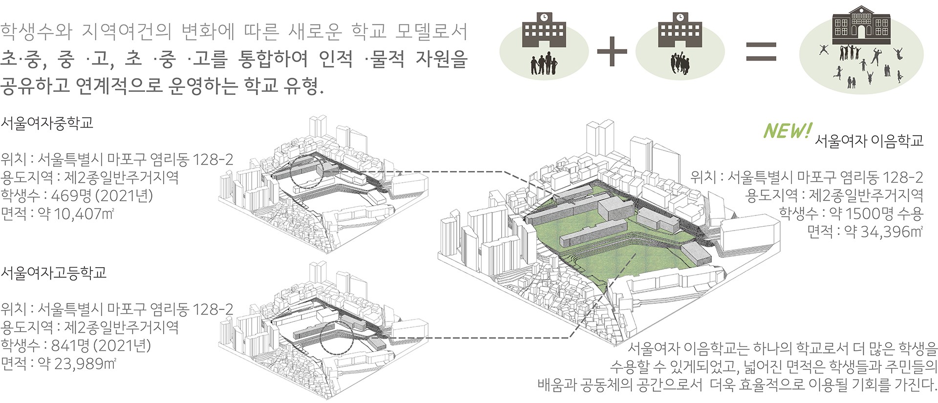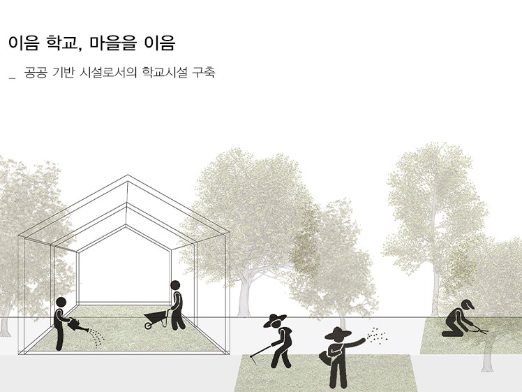 인간은 생명체를 좋아하고 그 속에서 살아가고 싶어 한다는 ‘녹색 갈증’ 이라는 단어가 있다. 도심 내 녹지 조성은 이 같은 녹색 갈증 해소에도 도움이 되고, 정서적인 안정감을 줄 수 있다. 고층화되며 삭막해진 도시에는 휴식의 기회, 경관미 조성, 그리고 각종 오염 등의 정화 기능을 할 수 있다. 학교는 마을에서 하나의 거대한 녹지공간과 공동체 공간으로서 작동할 수 있는 잠재력을 가진다. 밀집된 주택가에 있는 유일한 빈 공간인 학교 운동장. 학교의 빈 공간은 마을 사람들에게 큰 열린 공간과 공동체 공간으로 제공될 수 있는 공공 기반 시설로서의 가능성을 품고 있다.
