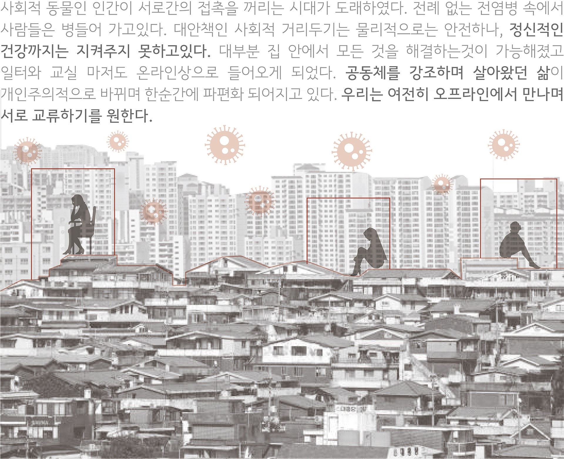 사회적 동물인 인간이 서로간의 접촉을 꺼리는 시대가 도래하였다. 전례 없는 전염병 속에서 사람들은 병들어 가고있다. 대안책인 사회적 거리두기는 물리적으로는 안전하나, 정신적인 건강까지는 지켜주지 못하고있다. 대부분 집 안에서 모든 것을 해결하는것이 가능해졌고 일터와 교실 마저도 온라인상으로 들어오게 되었다. 공동체를 강조하며 살아왔던 삶이 개인주의적으로 바뀌며 한순간에 파편화 되어지고 있다. 우리는 여전히 오프라인에서 만나며 서로 교류하기를 원한다.