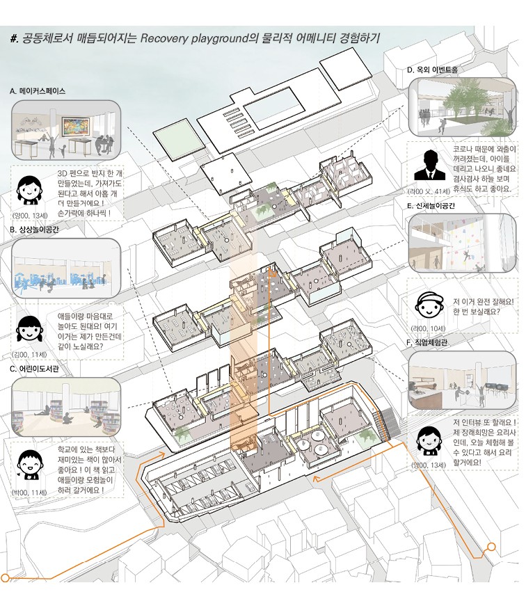 교육놀이공간을 생성하여 서로가 서로의 공동체로서 매듭지어질 수 있는 공간을 제안한다.