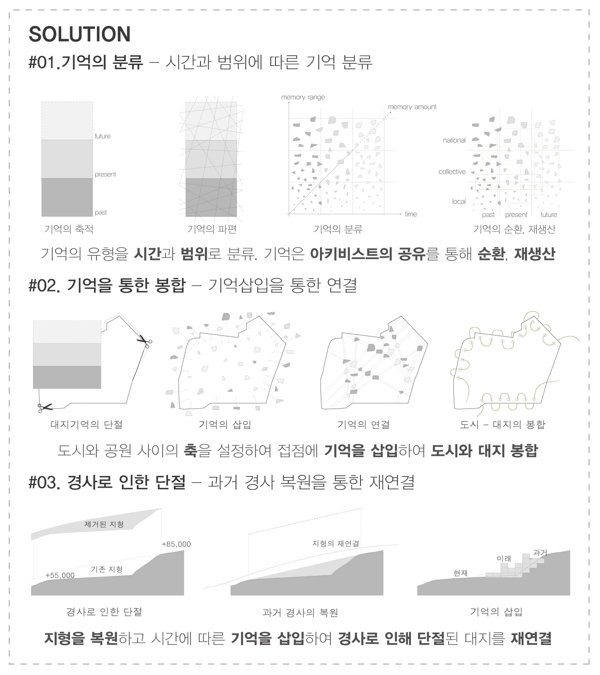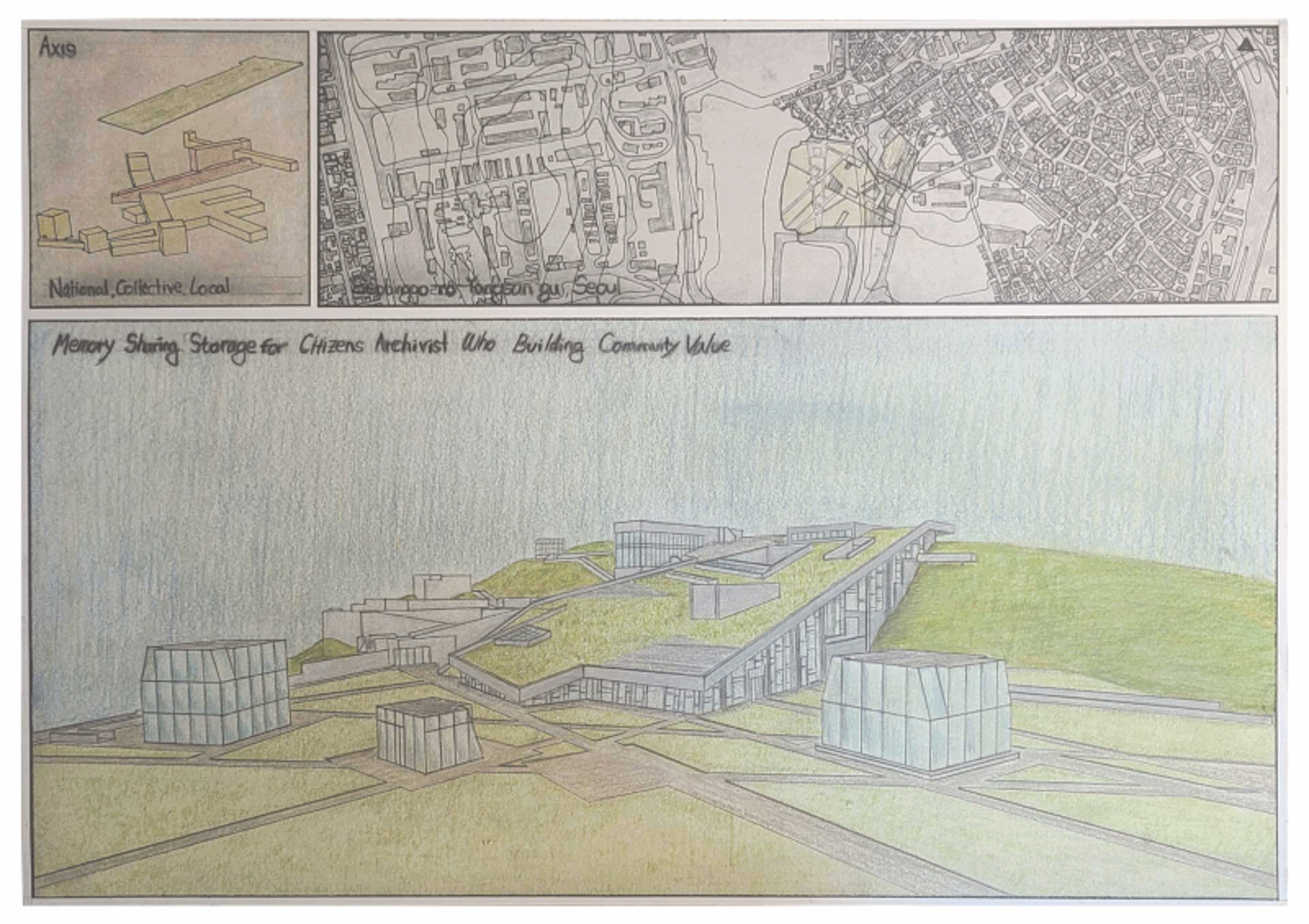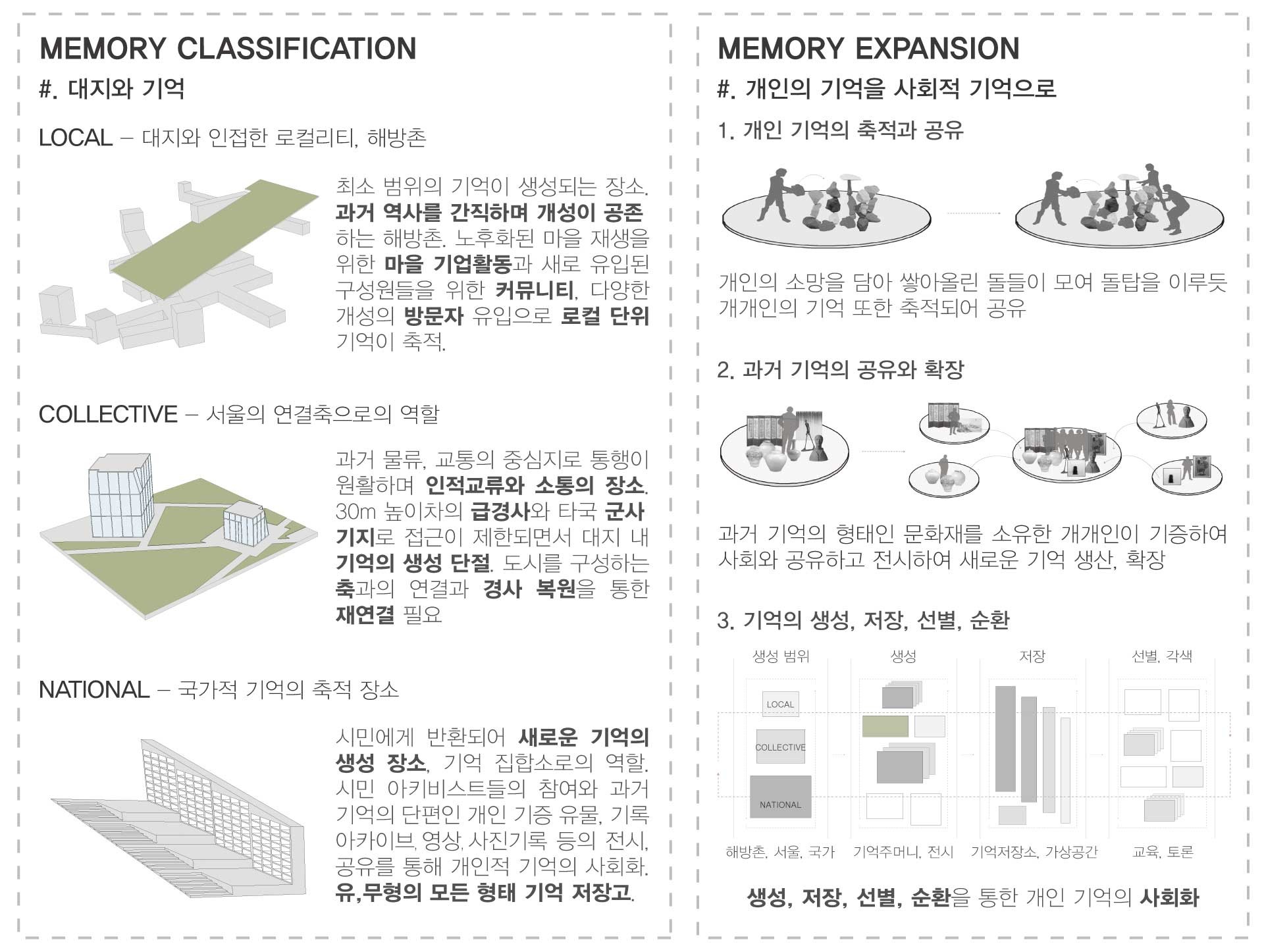 과거 물류의 중심지에서 외국 군대의 주둔지로 금단의 땅이 된 옛 방사청과 용산시지는 시민이 단절되어 있다. ‘기억공유 저장소’를 통하여 단절된 기억을 다시금 연결한다. 또한 개인과 전시물 간 일방향의 공유가 이루어지는 기존의 전시 공간에서 개개인의 시민 아키비스트들의 협력활동을 통해 양방향의 공유가 발생하여 공동체 가치가 생성되는 장소를 제안한다.