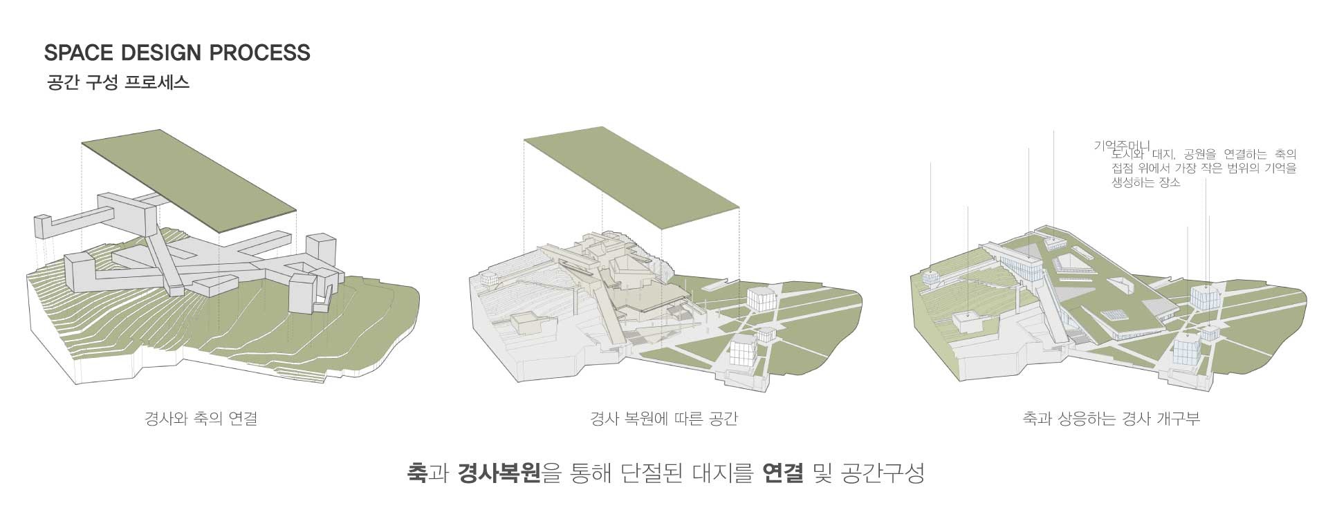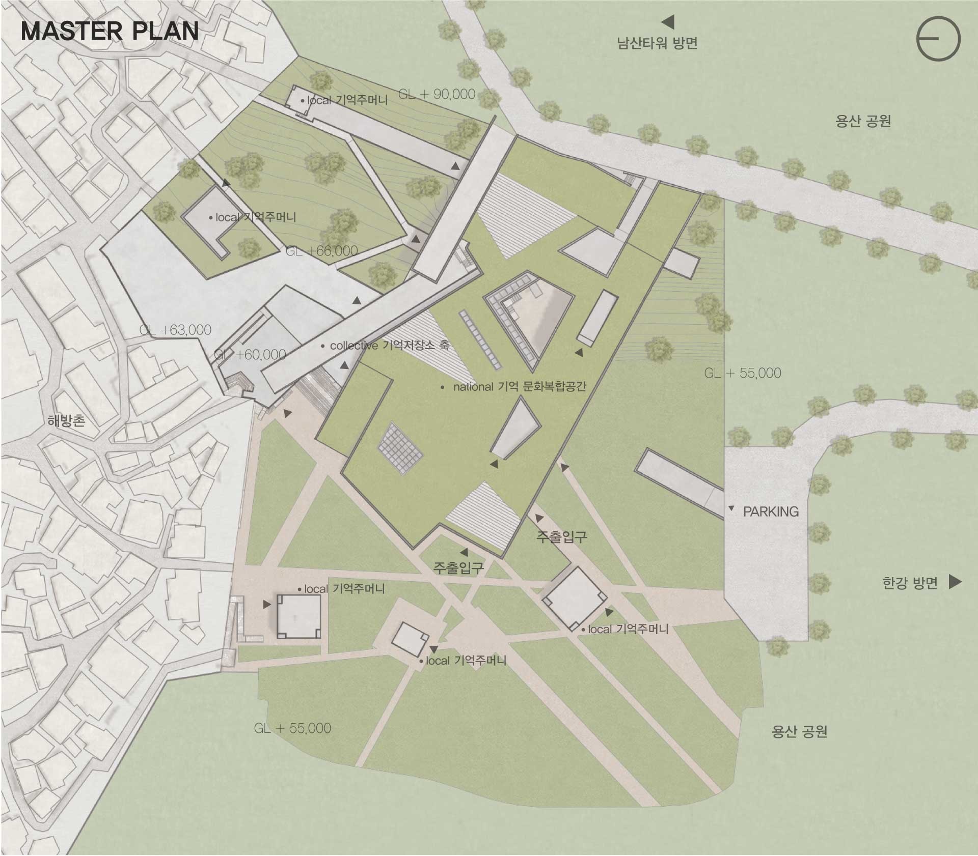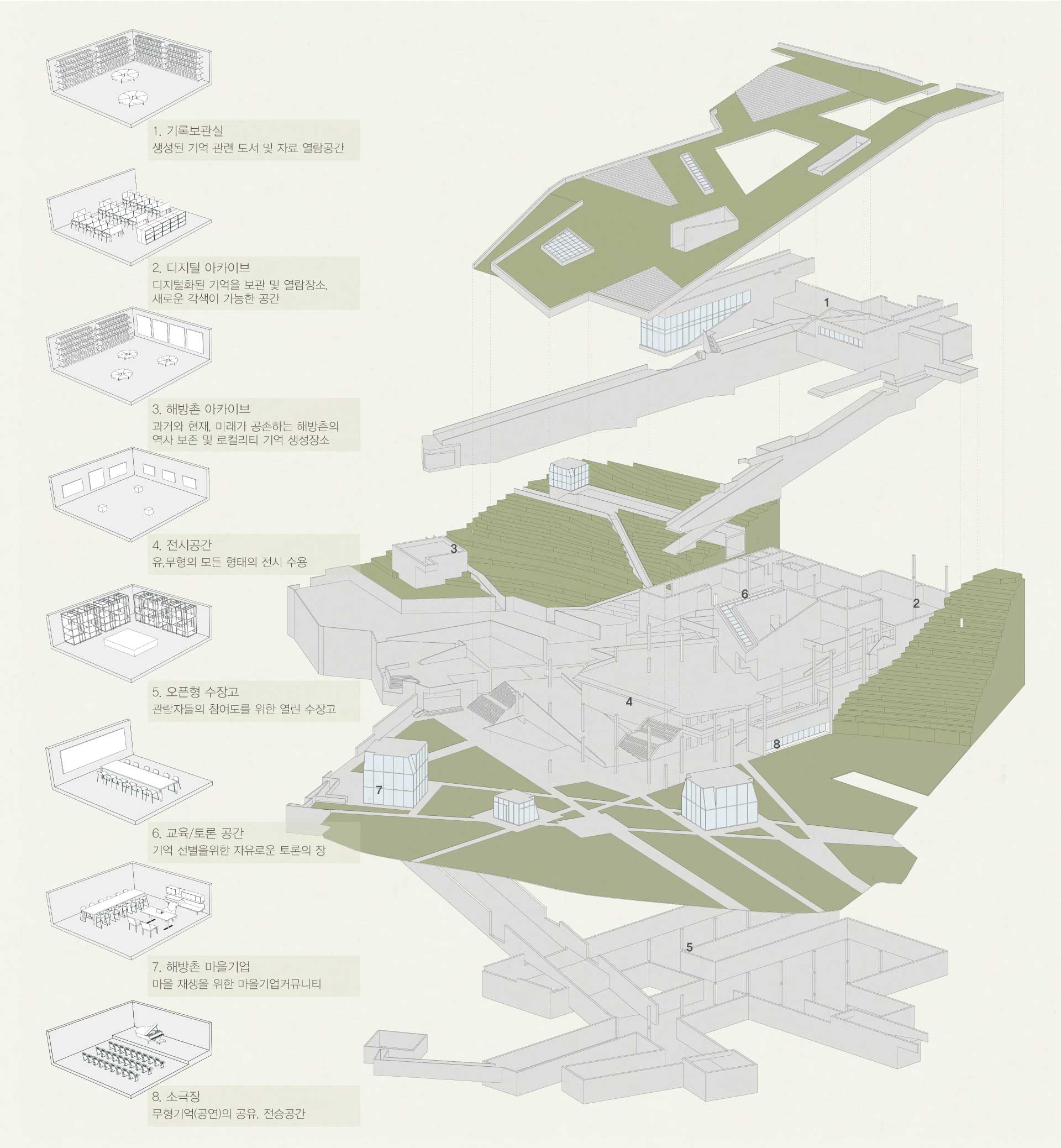 과거 물류의 중심지에서 외국 군대의 주둔지로 금단의 땅이 된 옛 방사청과 용산시지는 시민이 단절되어 있다. ‘기억공유 저장소’를 통하여 단절된 기억을 다시금 연결한다. 또한 개인과 전시물 간 일방향의 공유가 이루어지는 기존의 전시 공간에서 개개인의 시민 아키비스트들의 협력활동을 통해 양방향의 공유가 발생하여 공동체 가치가 생성되는 장소를 제안한다.