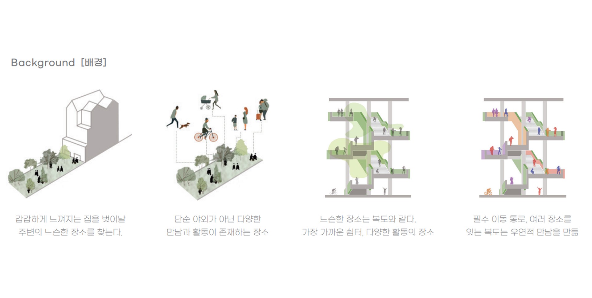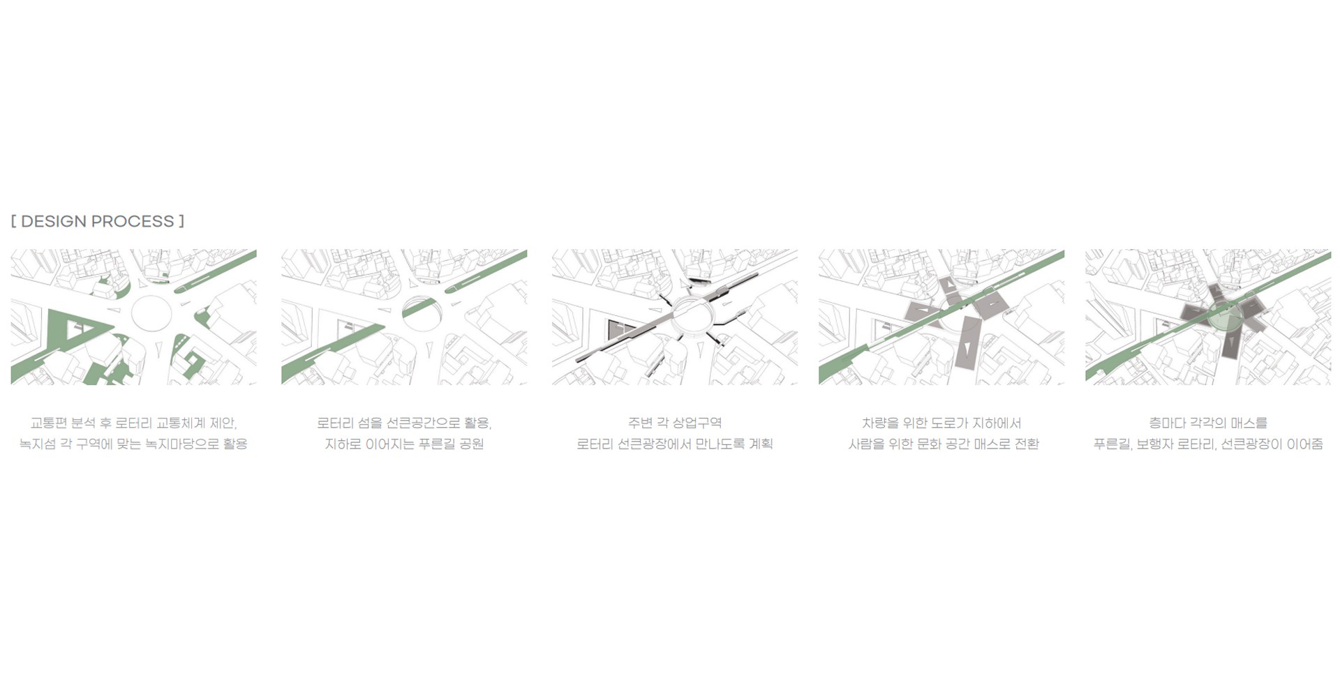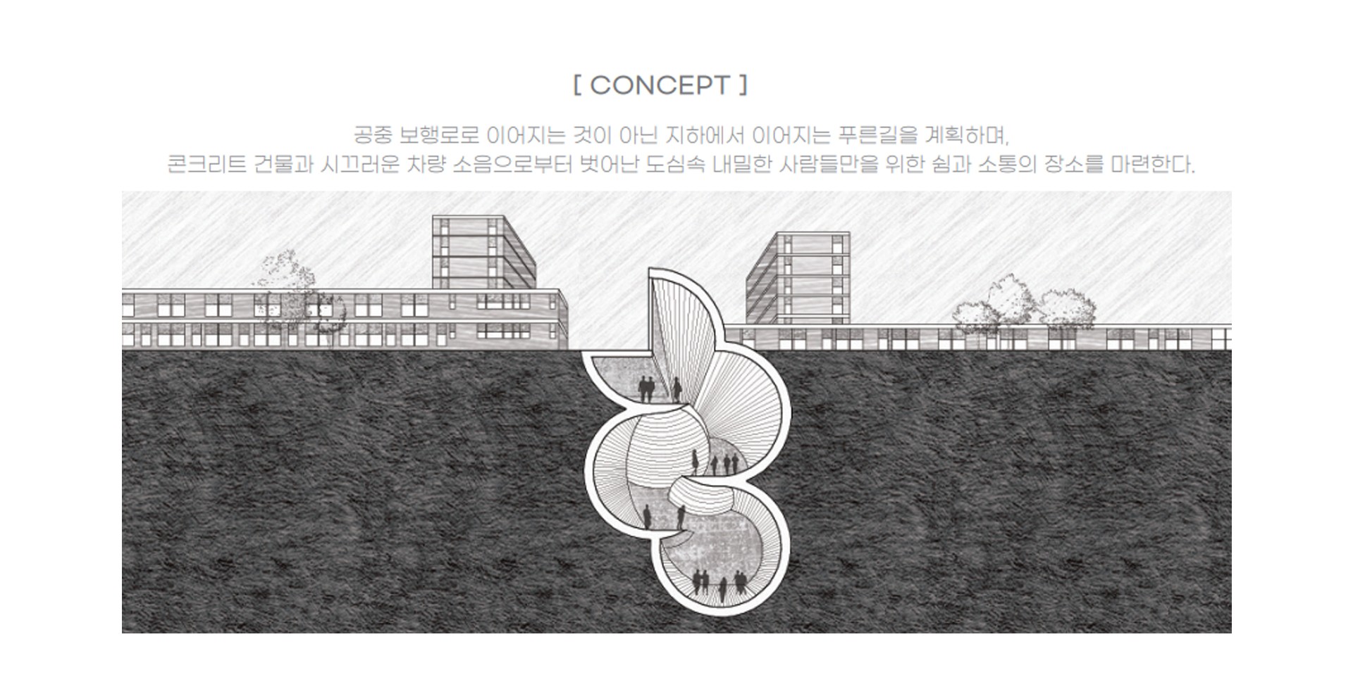 차량과 건물에게 주체를 빼앗긴 도로와 지상은 지하에서 사람들을 위한 내밀한 커뮤니티 공간과 다양한 쉼이 존재하는 정원으로 분위기가 전환된다.