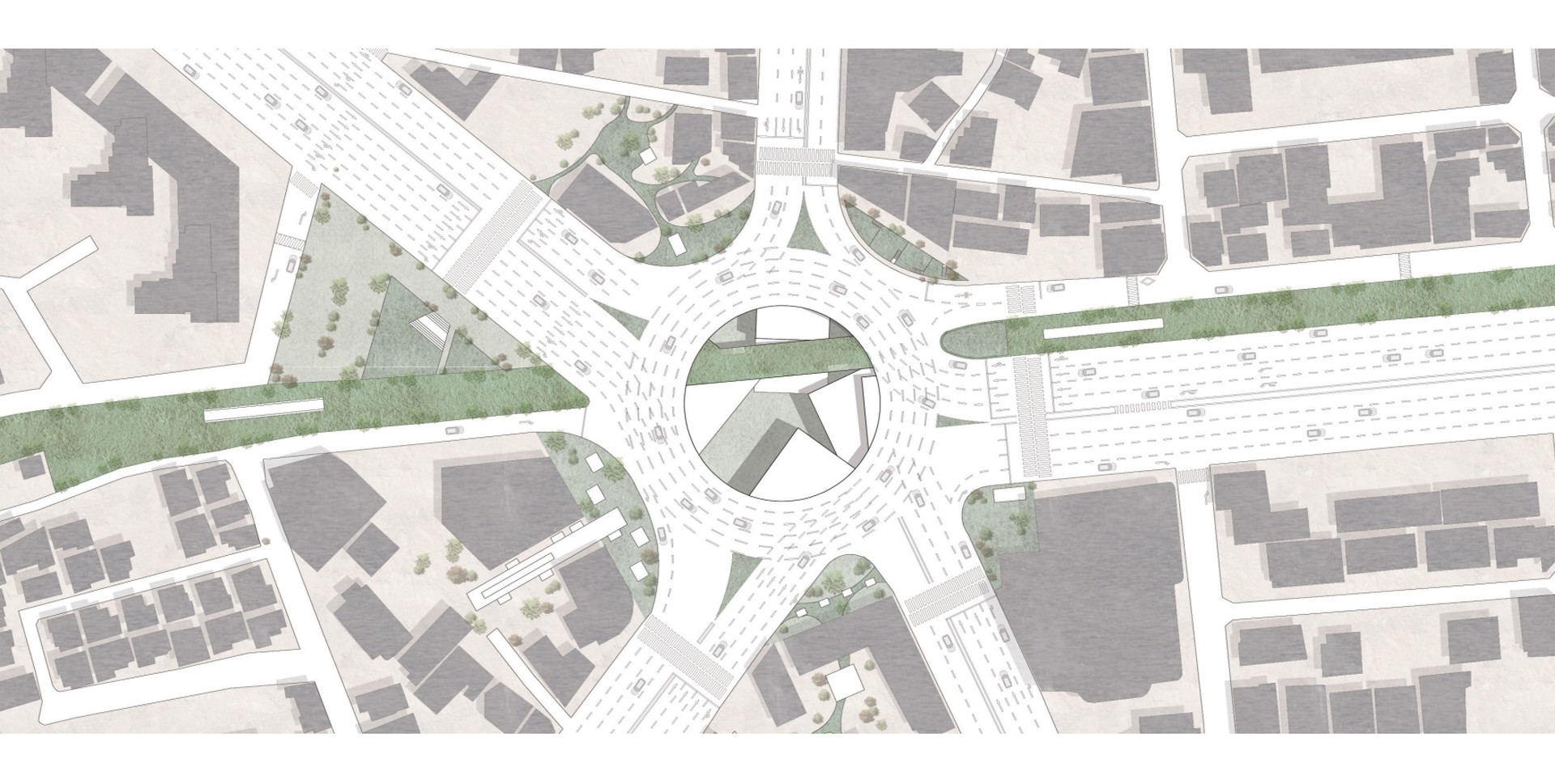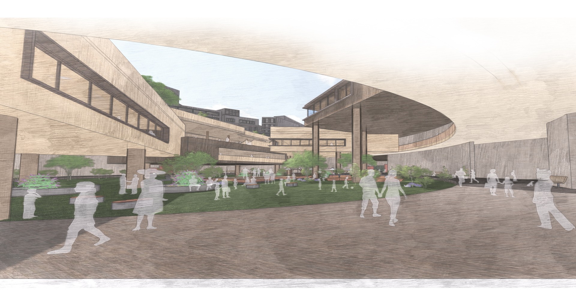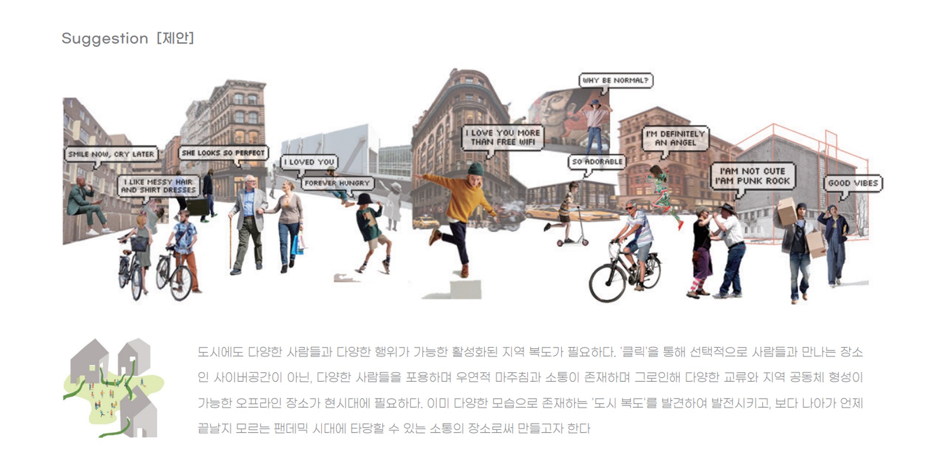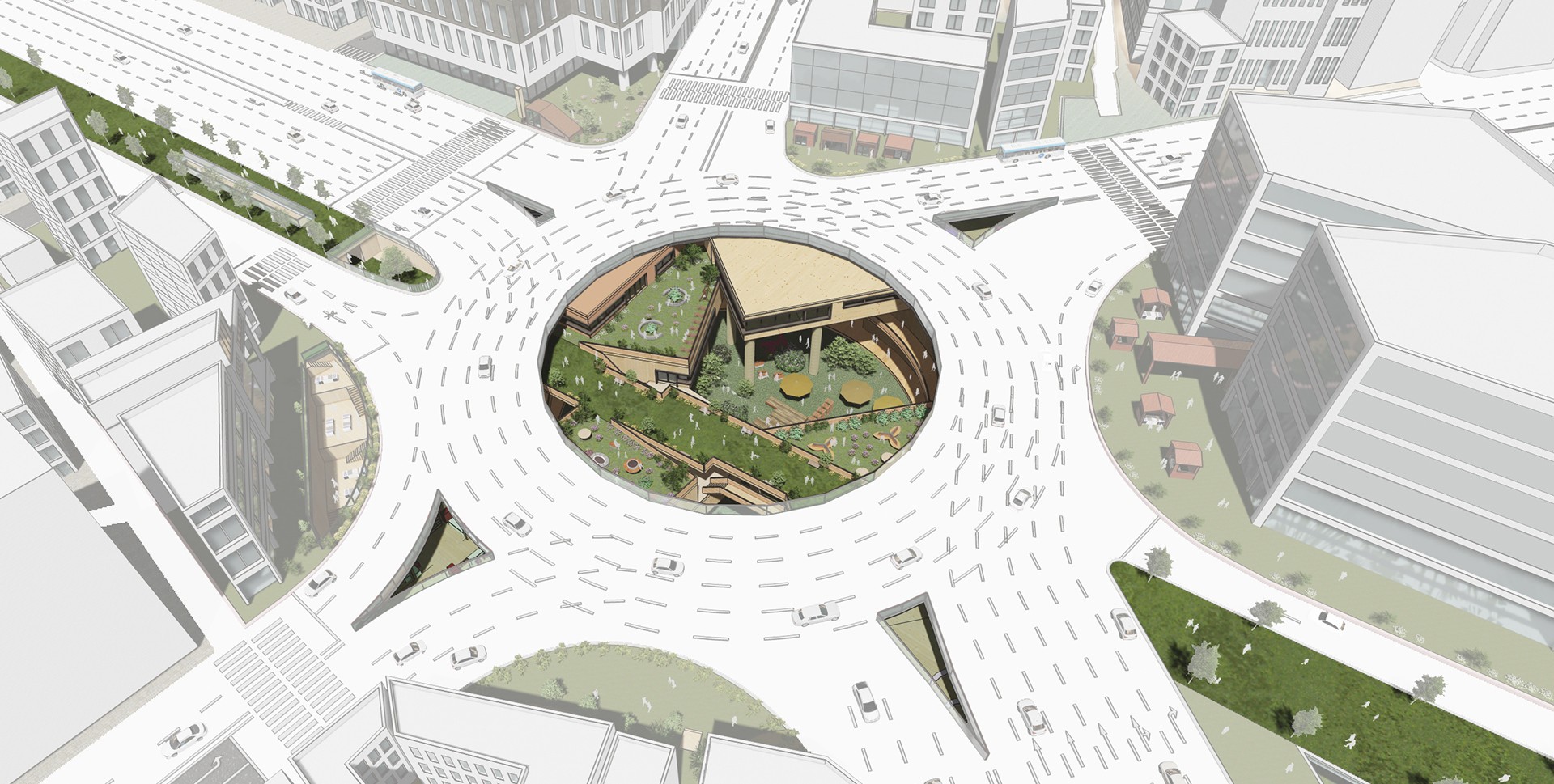 차량과 건물에게 주체를 빼앗긴 도로와 지상은 지하에서 사람들을 위한 내밀한 커뮤니티 공간과 다양한 쉼이 존재하는 정원으로 분위기가 전환된다.