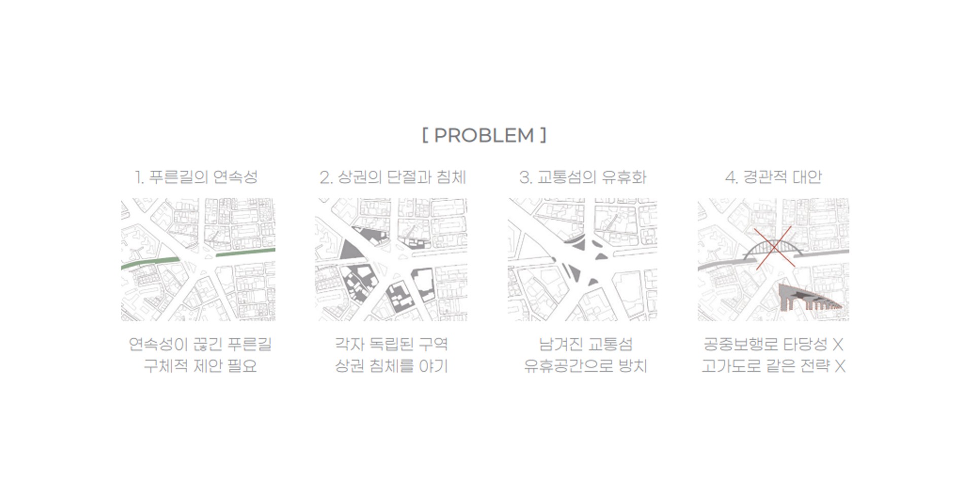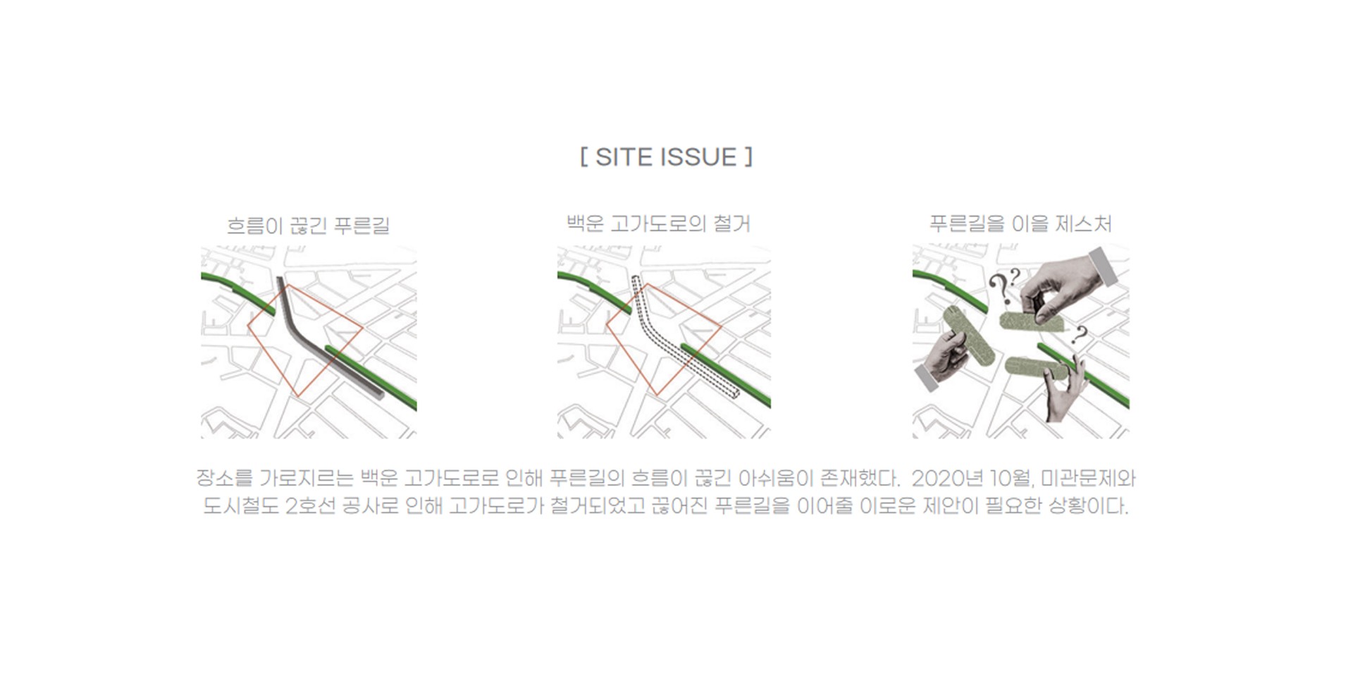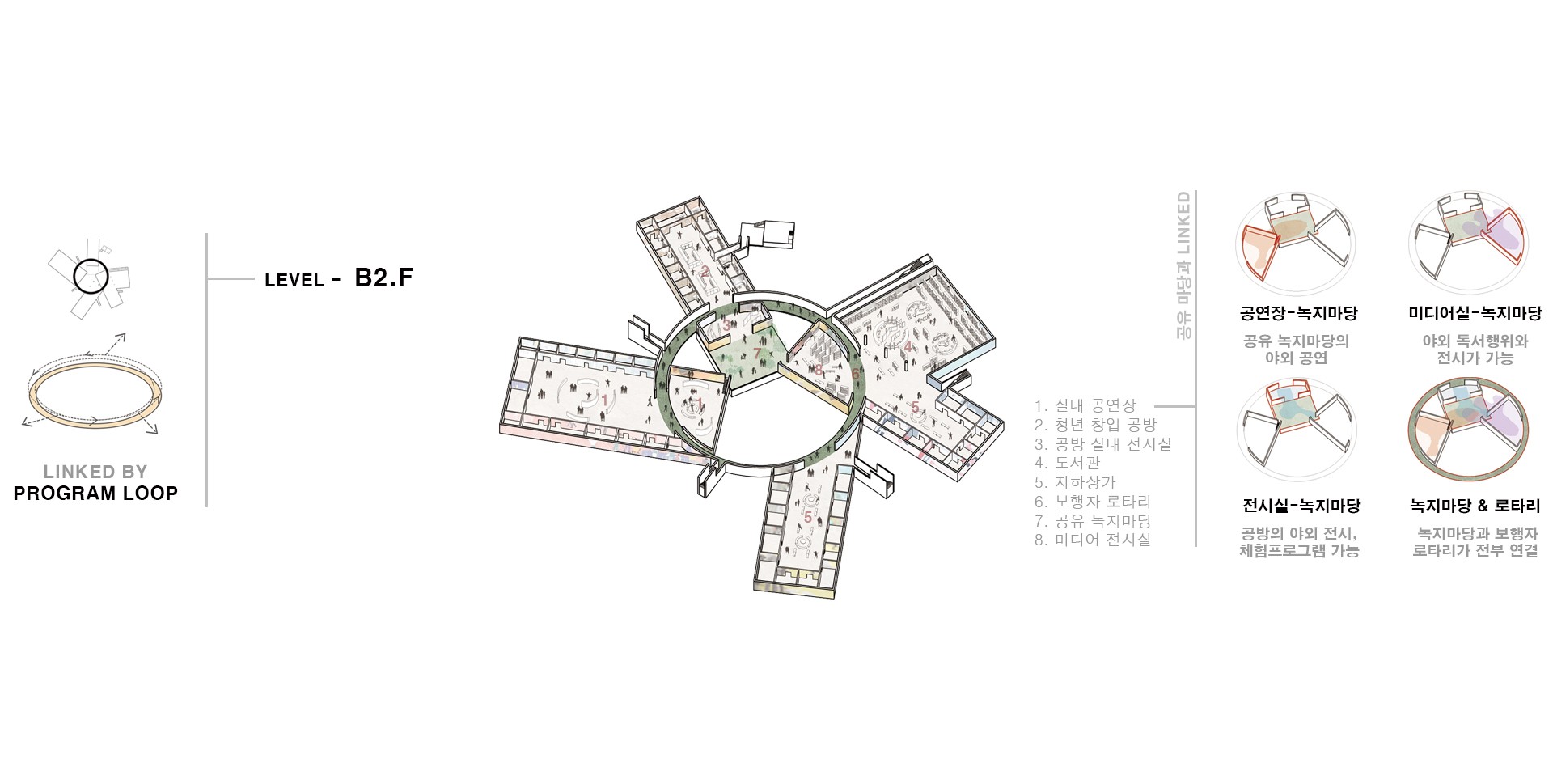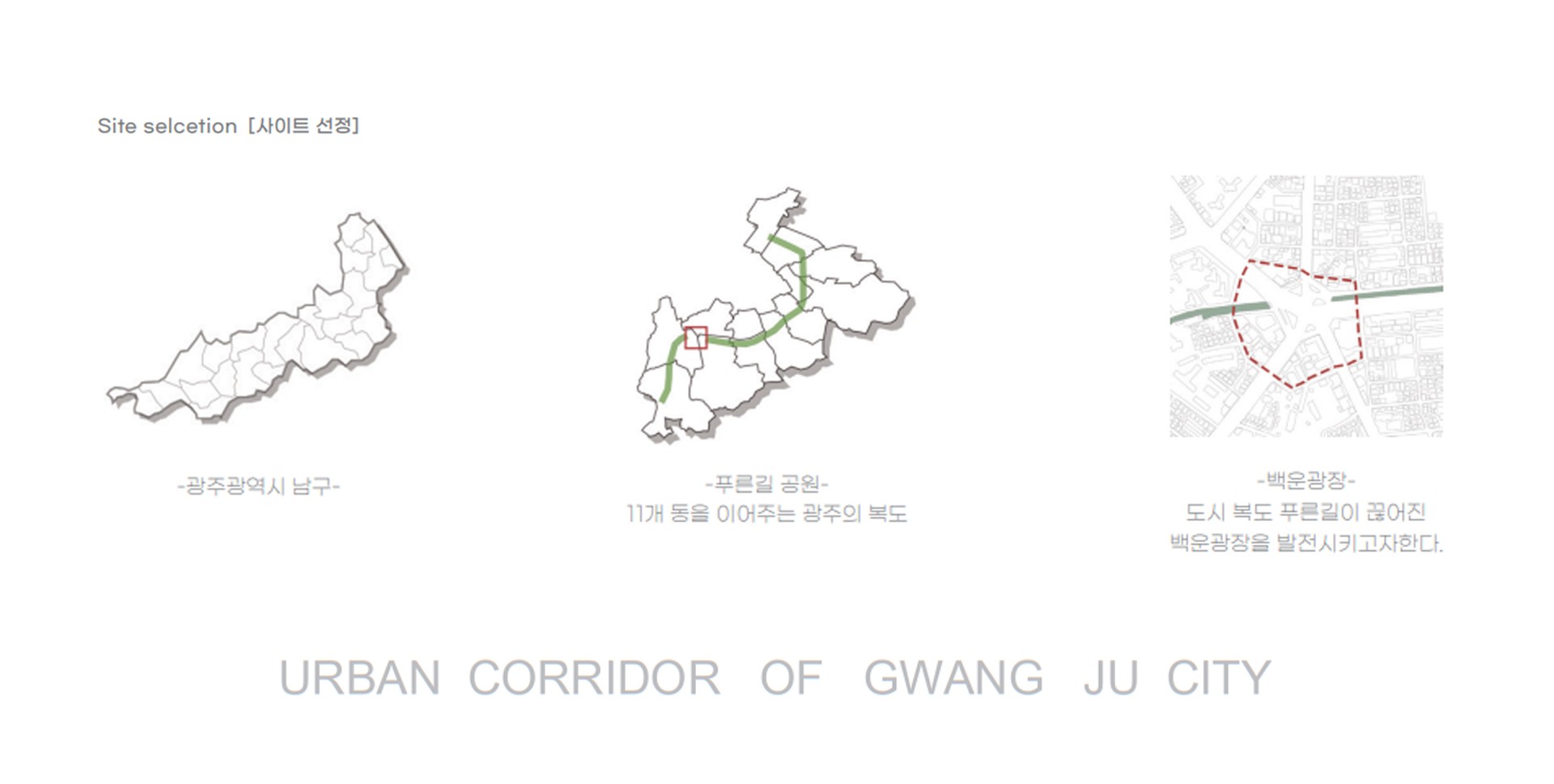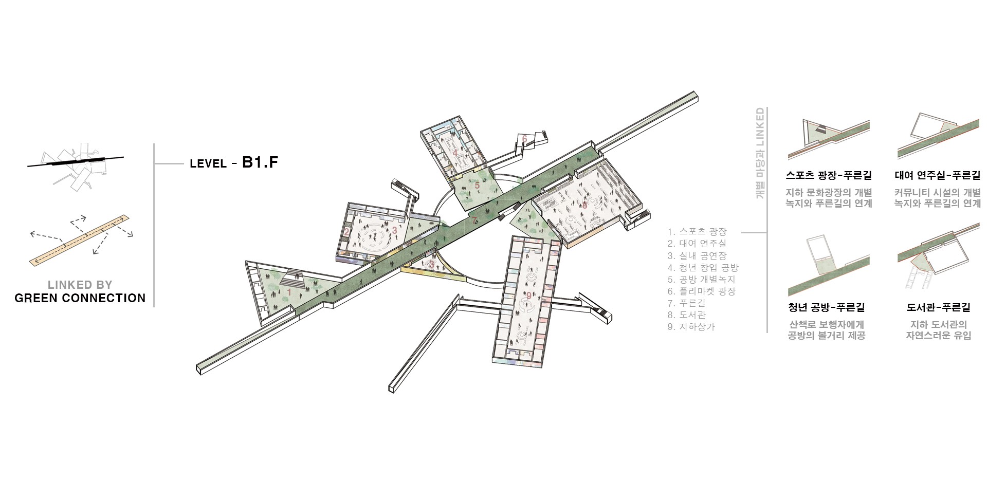 광주의 복도 역할을 하는 '푸른길'이 끊긴 장소를 이어줌과 동시에 분리된 상권을 하나로 잇는 도심 속 내밀한 지하 커뮤니티 정원을 계획하였다.