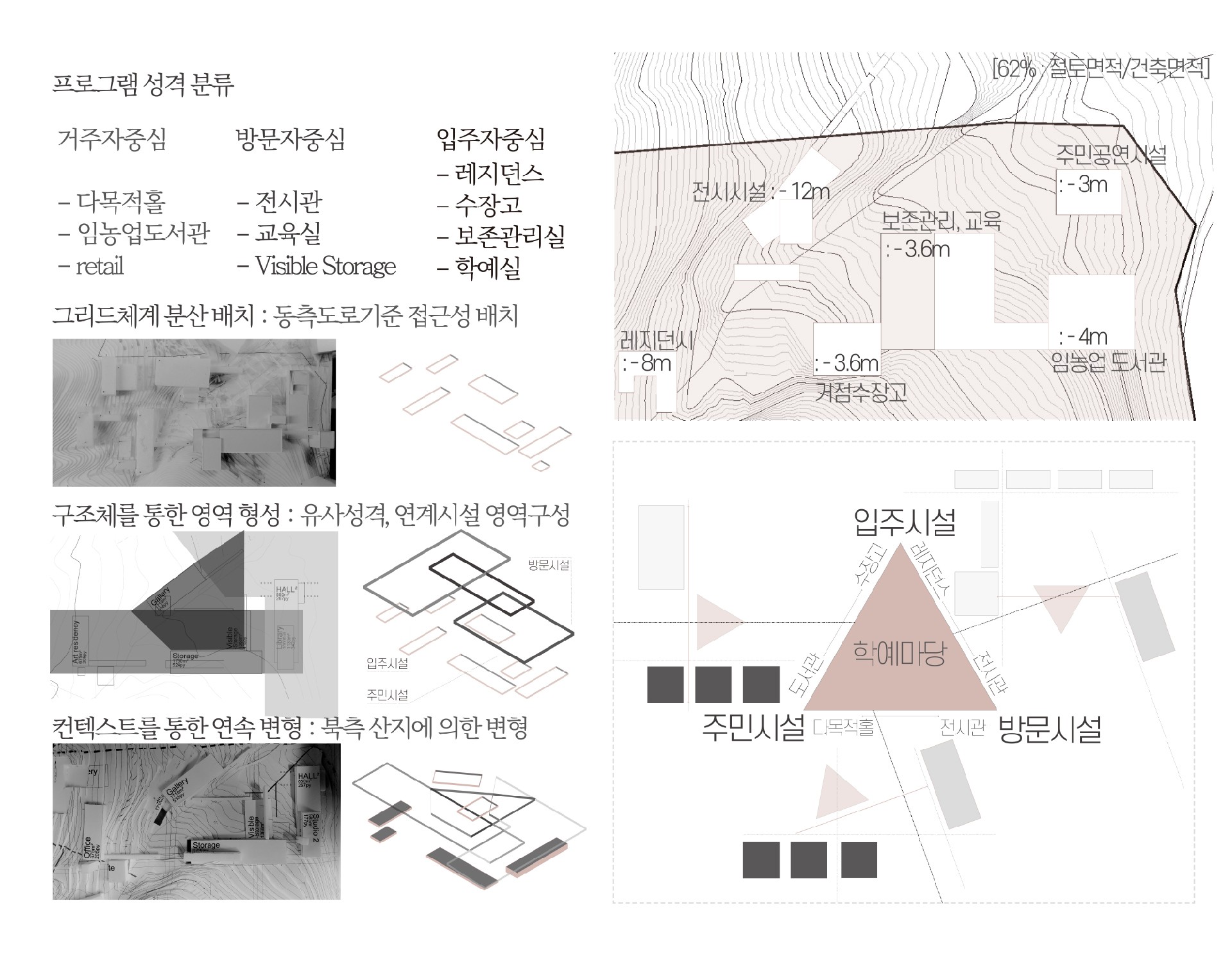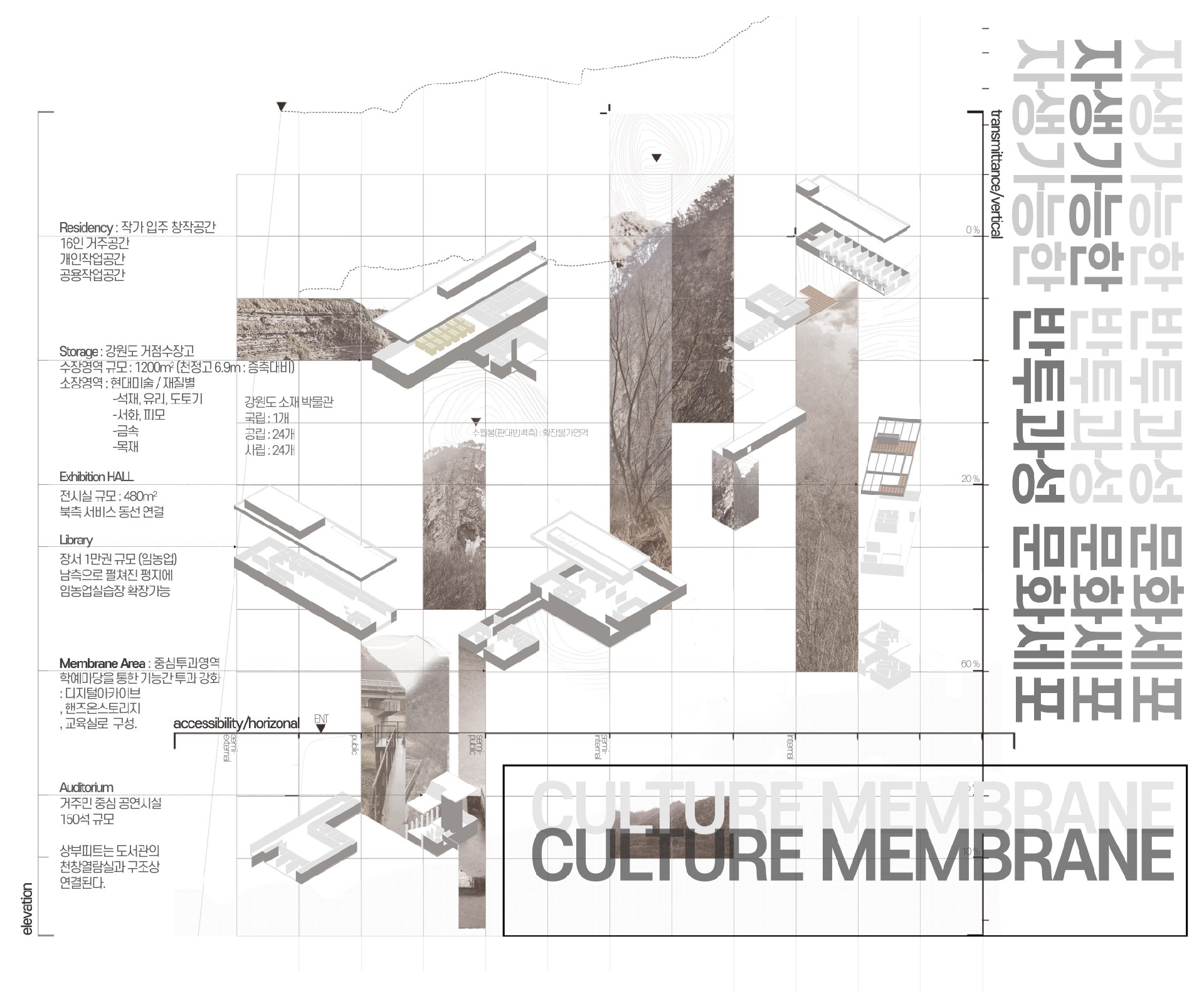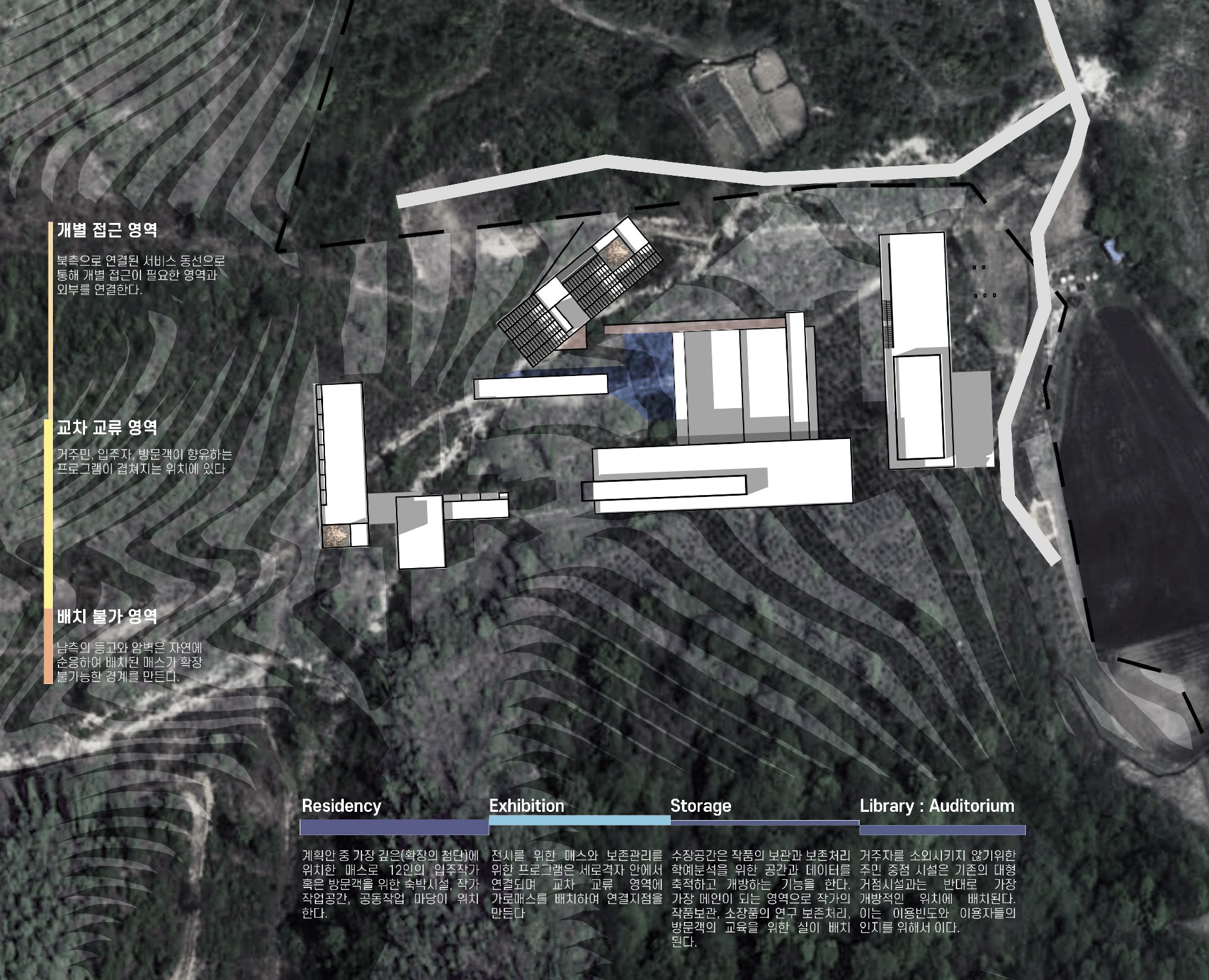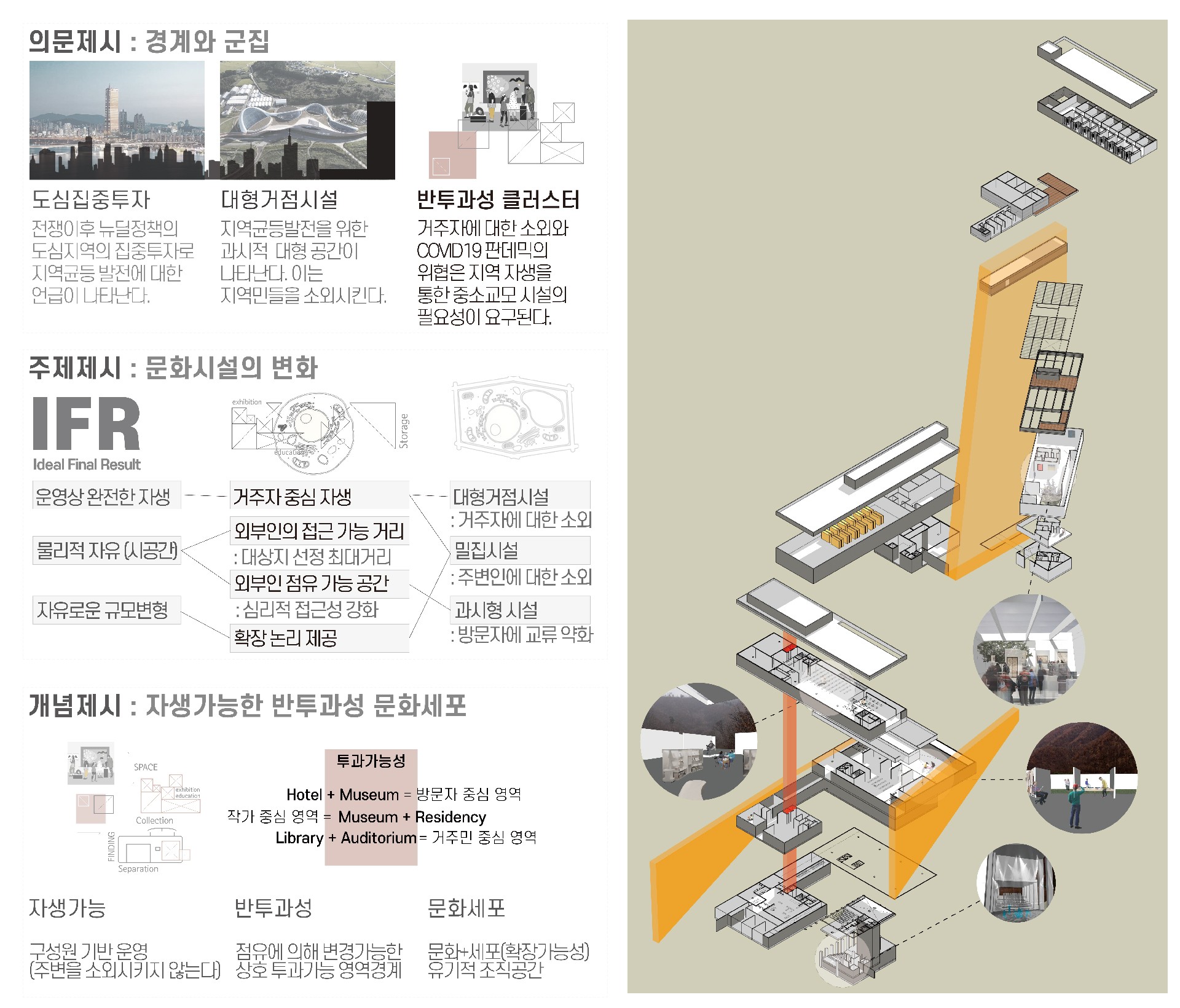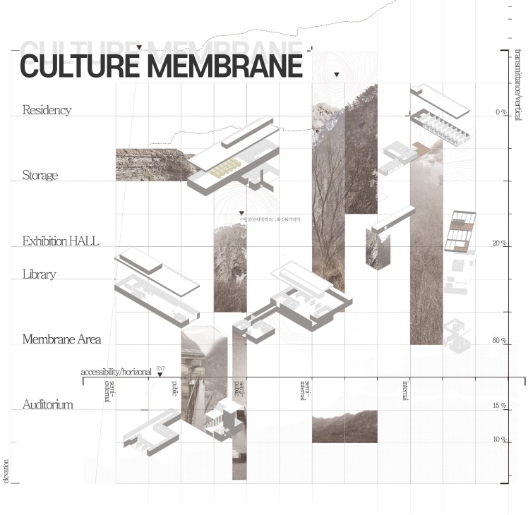 ‘지역의 점유를 하고있는 구성원(원주민)’의 자율적인 시설점유를 통한 운영과 소외되지 않은 프로그램으로 자생가능하며 공간구성을 클러스터 형으로 배치함에따라 각 영역들과 사이공간의 형성을통해 투과불가능한 세포벽형태의 건축에서 상호간에 반투과성 세포막 형태를 목표로 삼는다. 문화세포라는 개념을 통해앞서 설명한 자생가능과 반투과성이 이루어질 수 있도록 하나의 대지에 확장가능한 저밀도의 영역을 만들어 유리된 기념비적 공간이 아닌 유기적 조직공간을 계획한다.