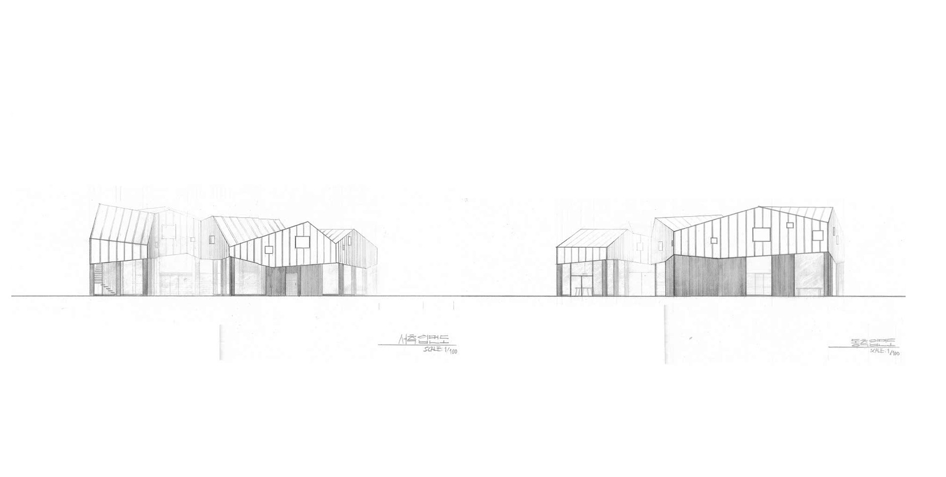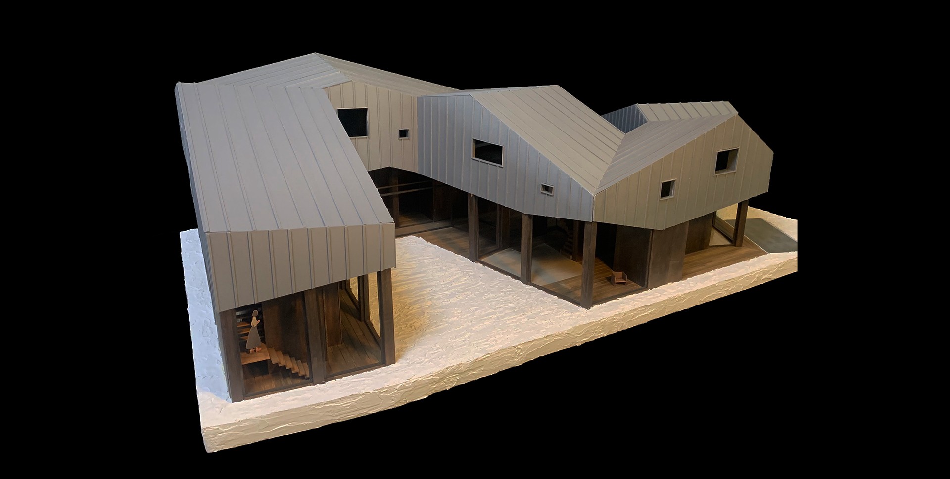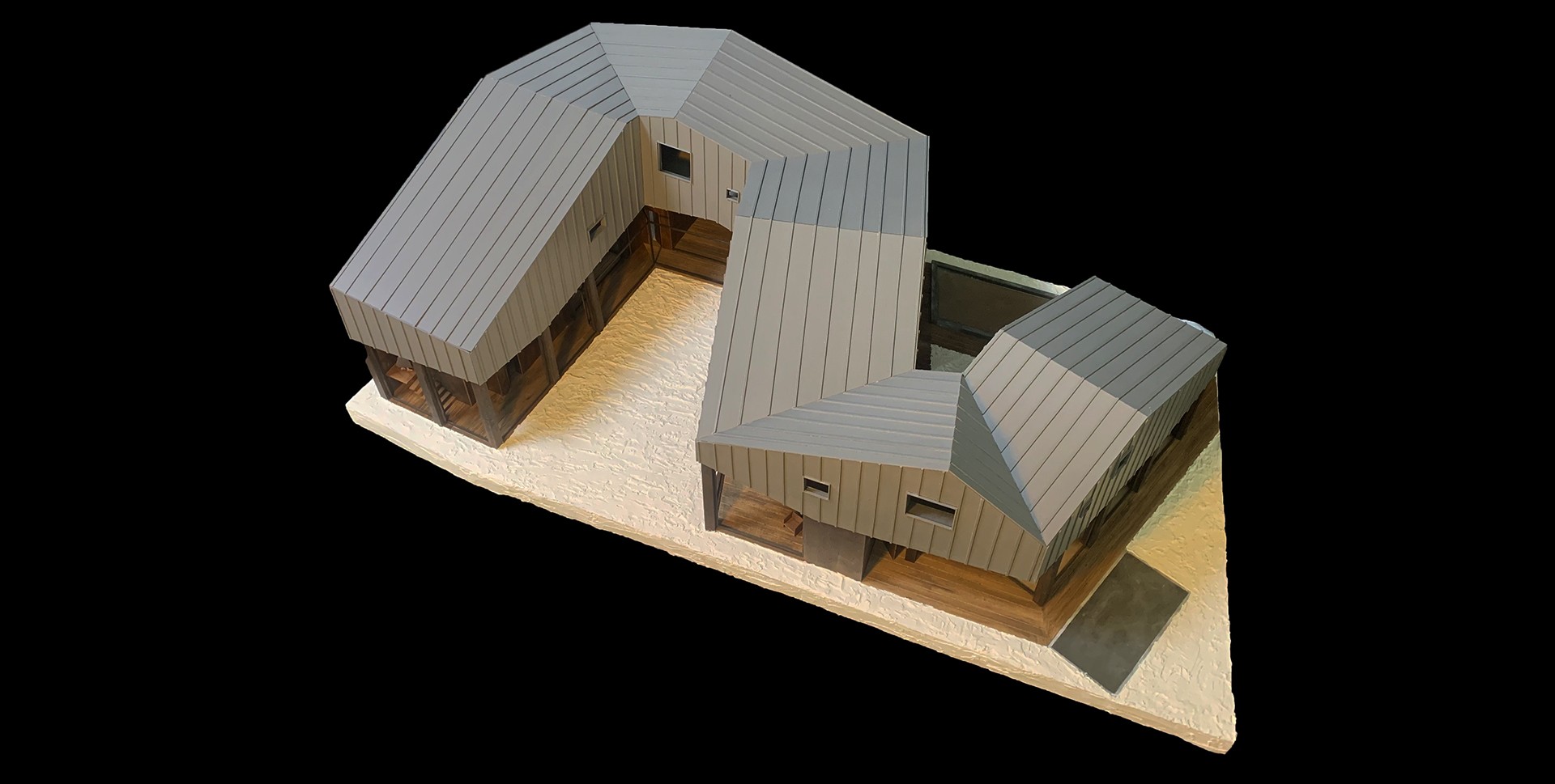 뒷산의 원경을 가로막지 않고 등고선을 이어가며 집 내부에는 둘러싸인 분위기를 주고 싶었다. 지붕매스는 산과 동화되기도 하고, 멀리 있는 봉우리를 받쳐주기도 한다.