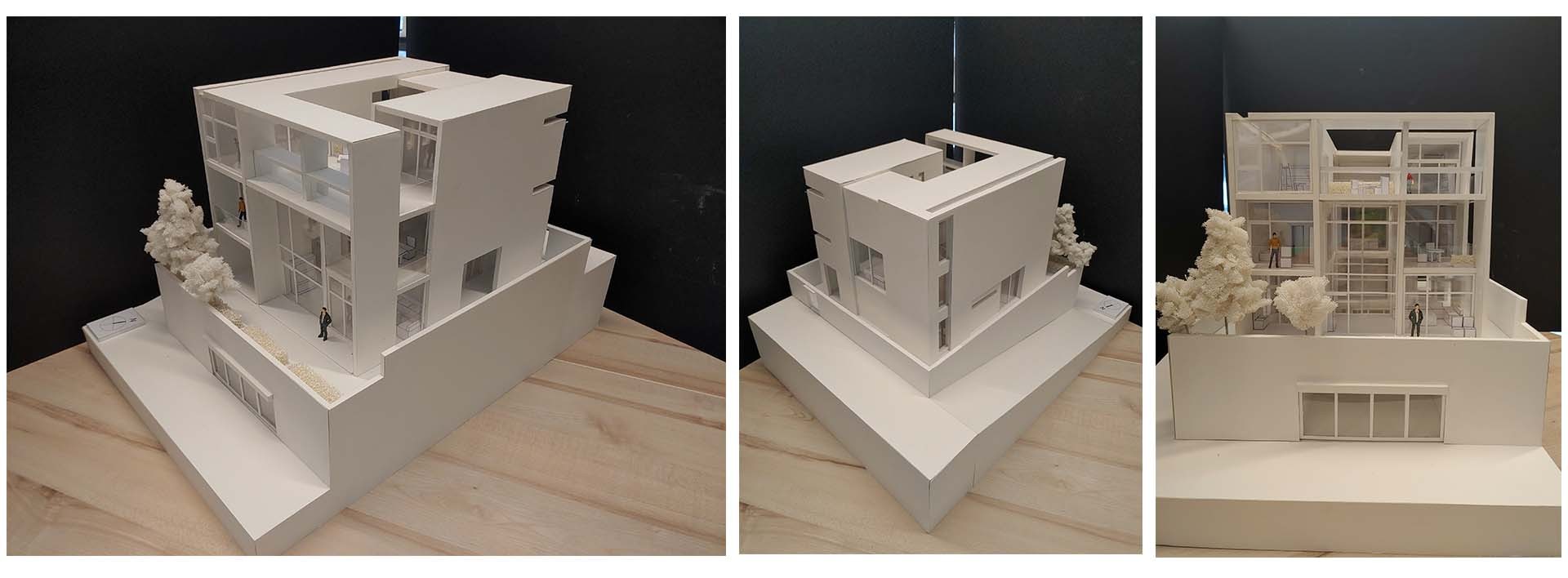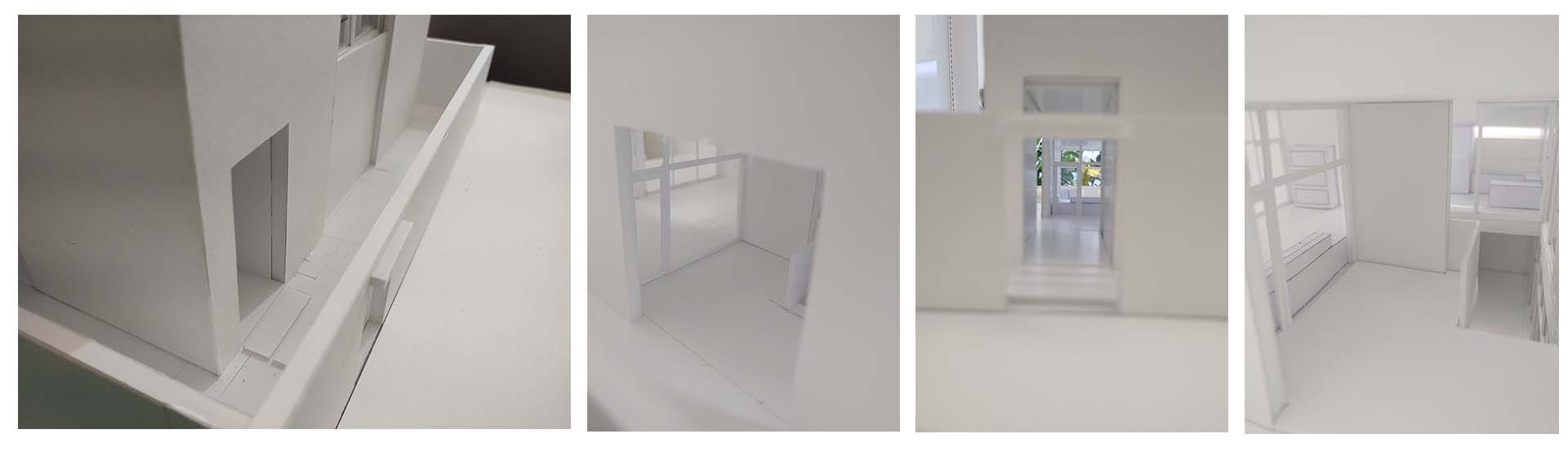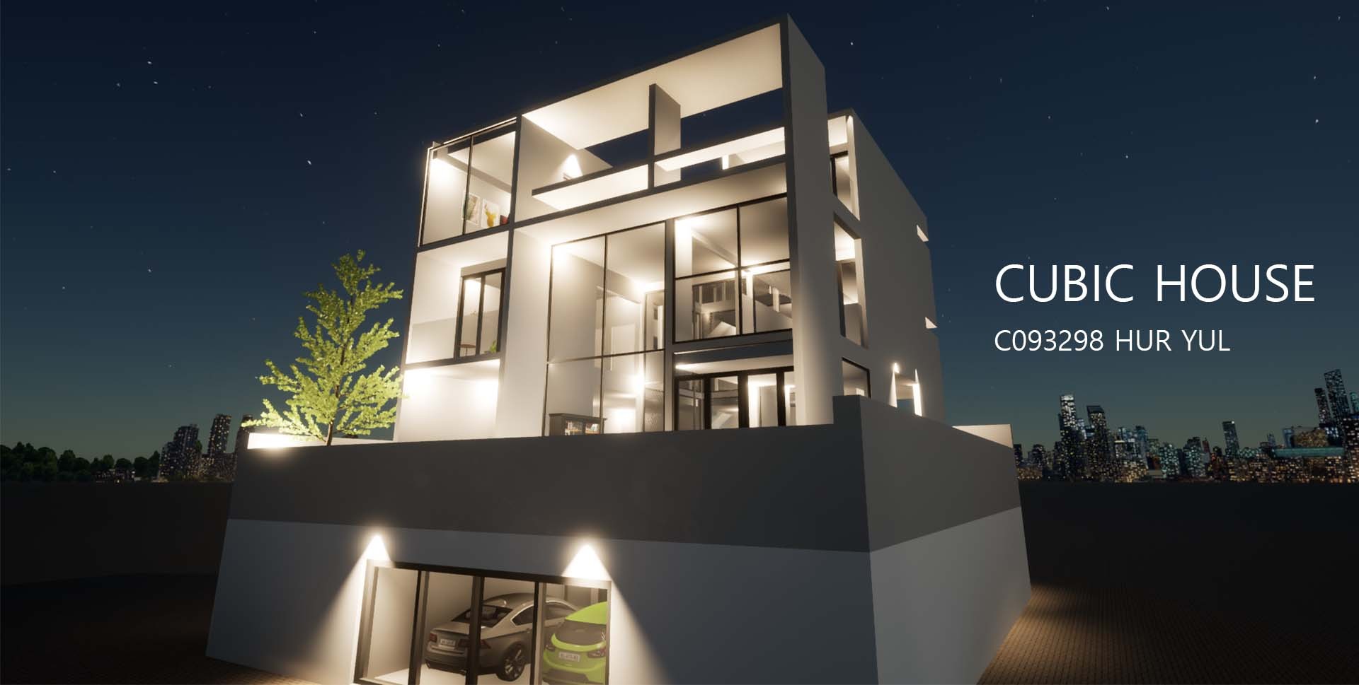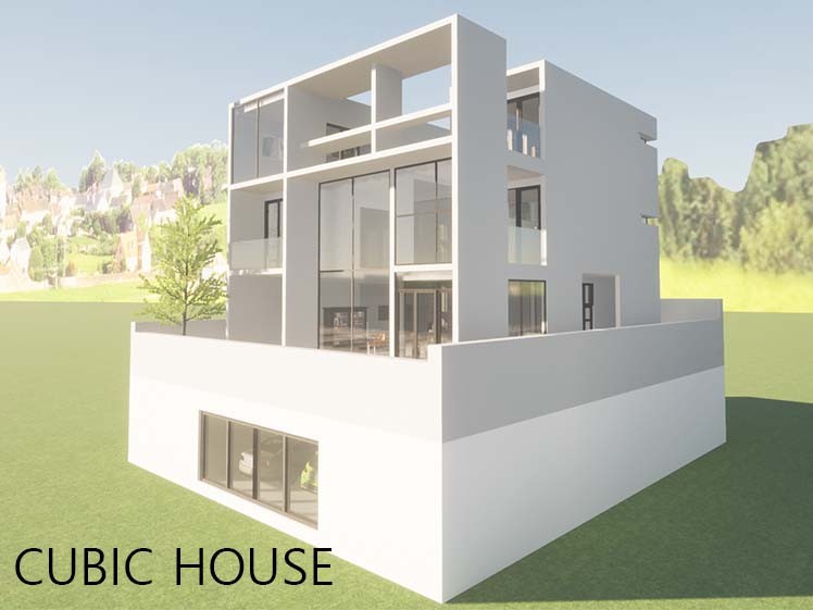 주택의 전체적인 형상은 육면체를 기반으로 깎아내기, 돌출, 절단 등의 다양한 조작을 통해 만들어졌으며, 육면체의 안정감은 유지되도록 하였다.