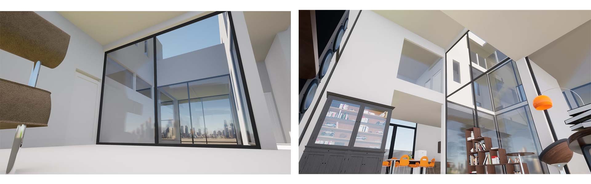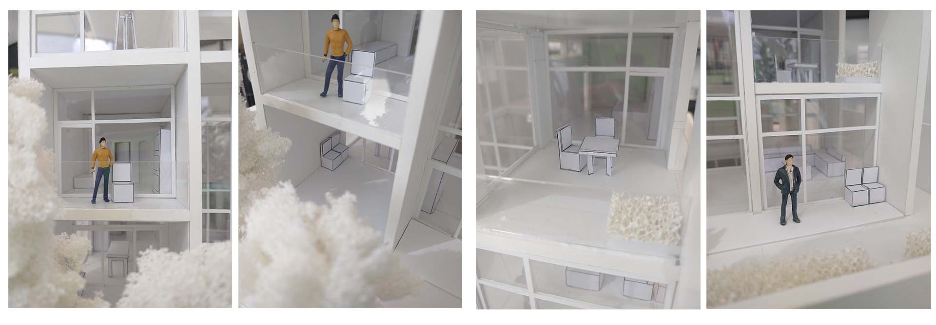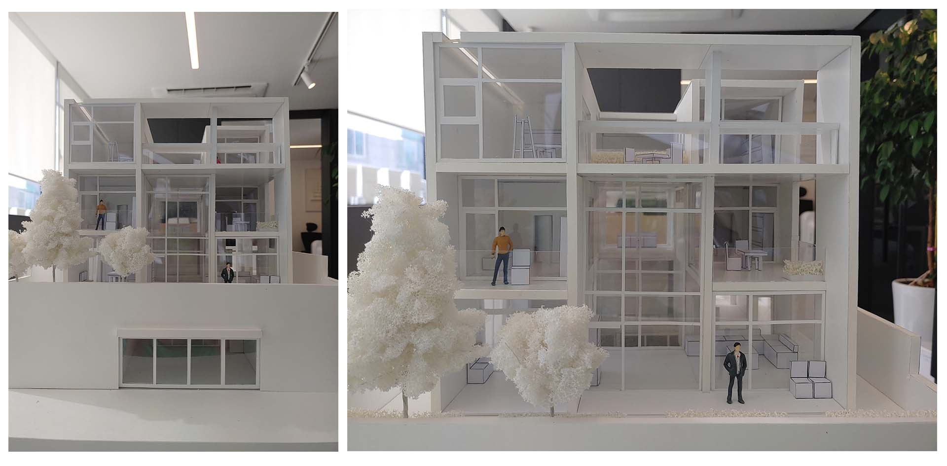 주택의 전체적인 형상은 육면체를 기반으로 깎아내기, 돌출, 절단 등의 다양한 조작을 통해 만들어졌으며, 육면체의 안정감은 유지되도록 하였다.
