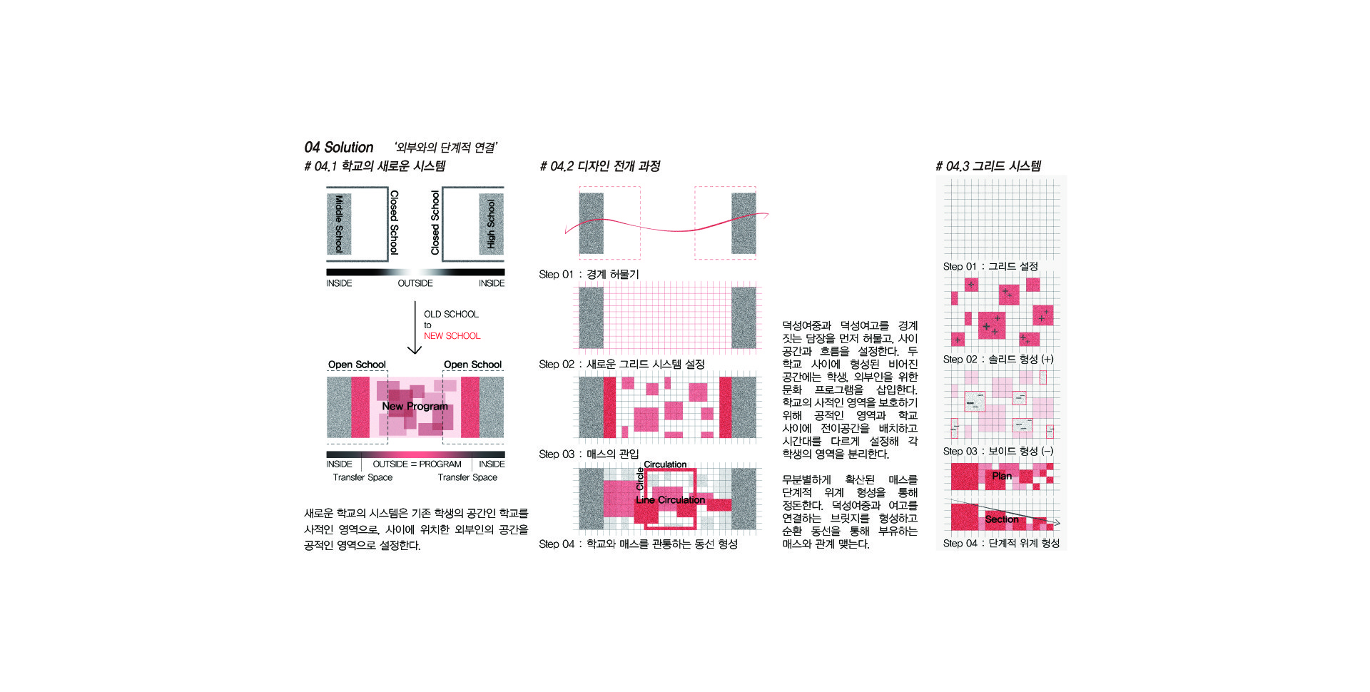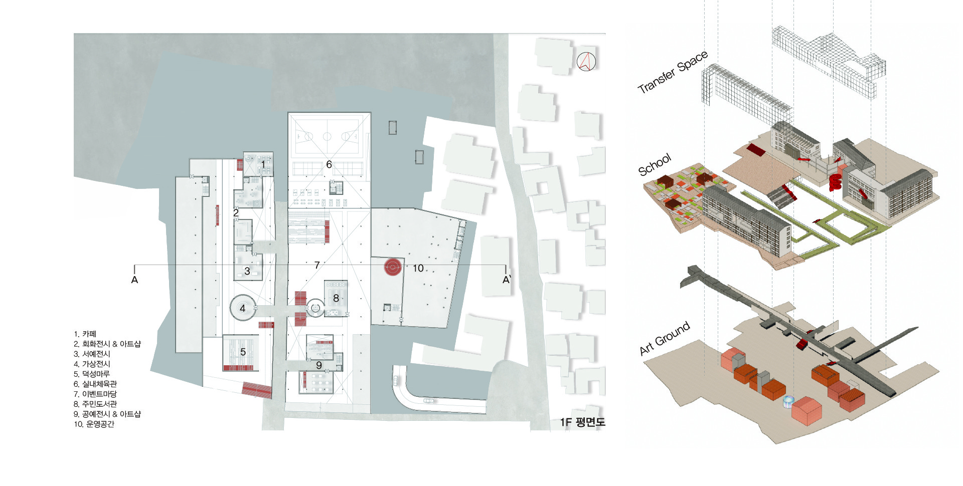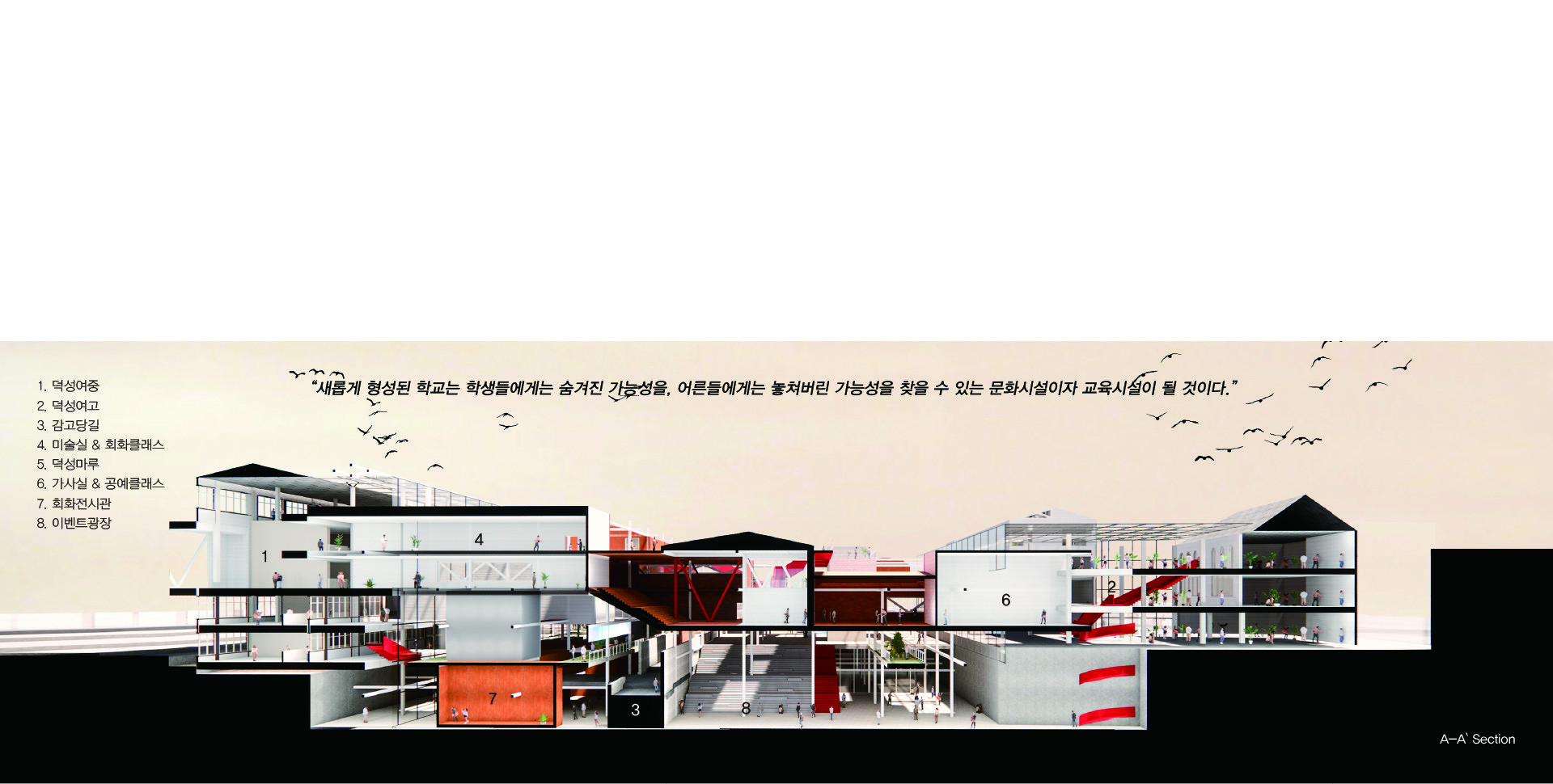 공공의 성격을 부여하고자 한다. 내어짐으로 인해 학교는 주변과 관계함으로서 새로운 교류의 가능성을 형성할 것이다. 또한 빠져나간