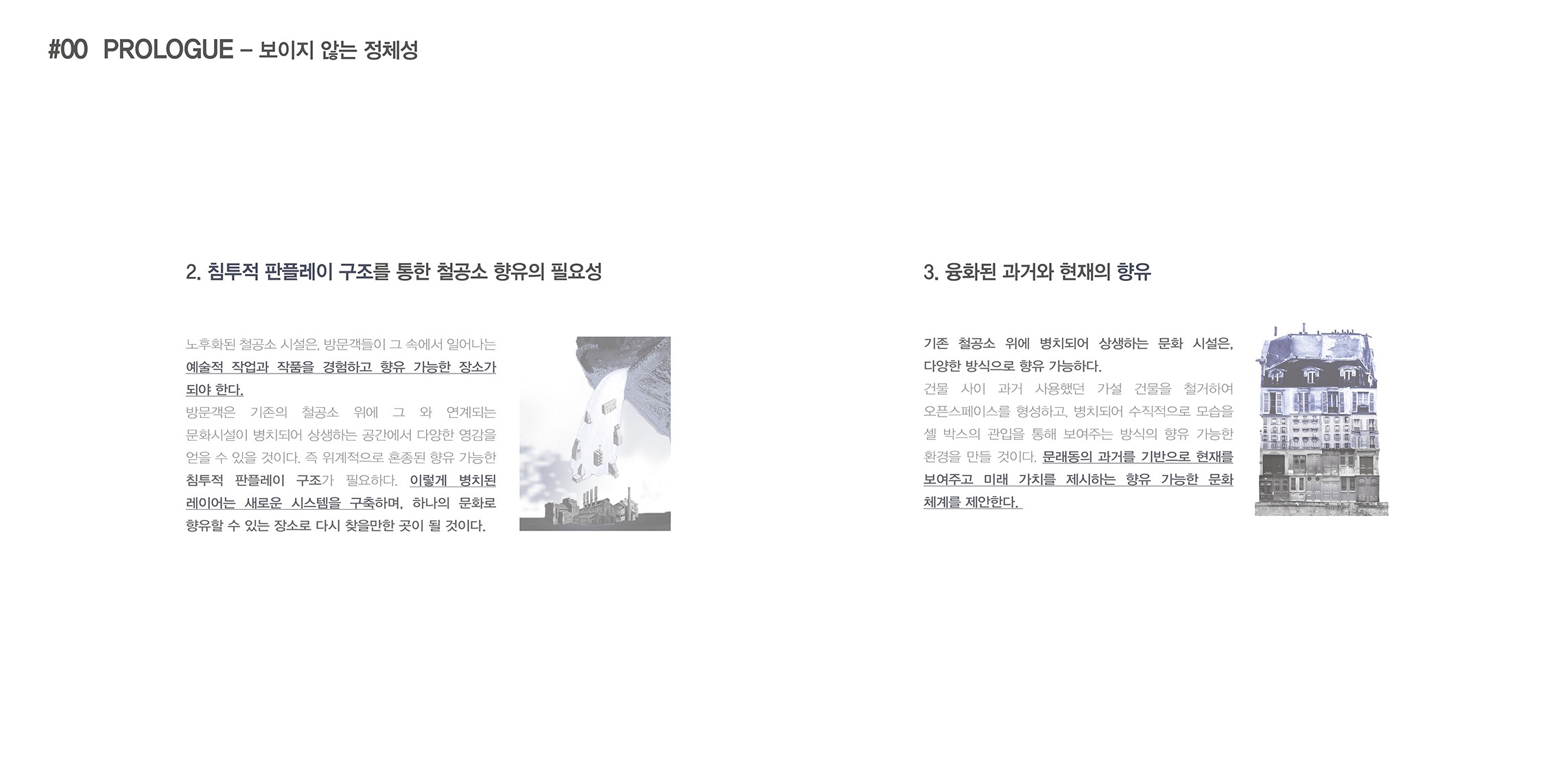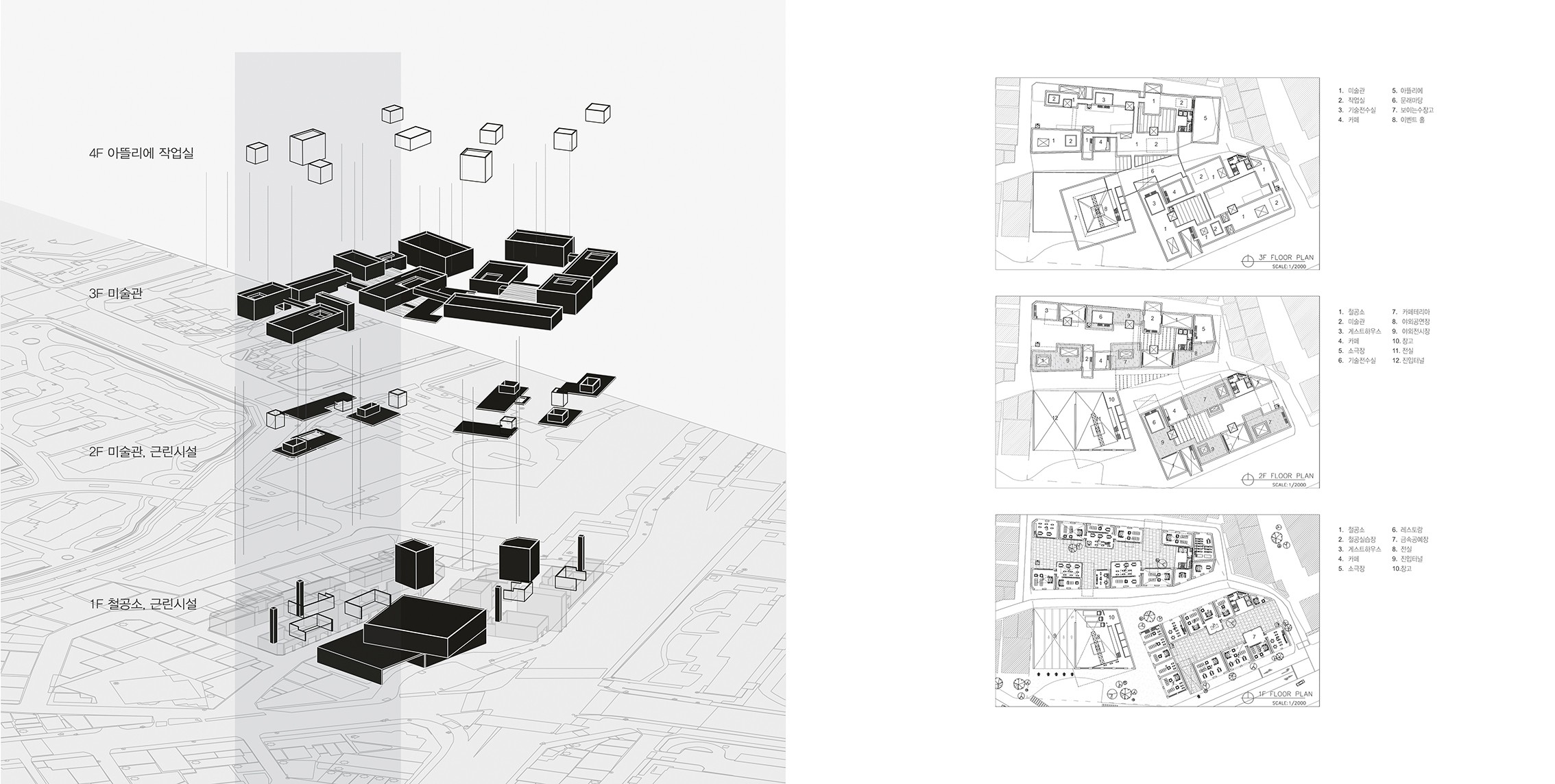 기존의 아뜰리에 그리고 미술관이 새롭게 병치되어 과거를 기반으로 현재와 미래를 보여줄 수 있는“문래 아이언티티”를 만든다.