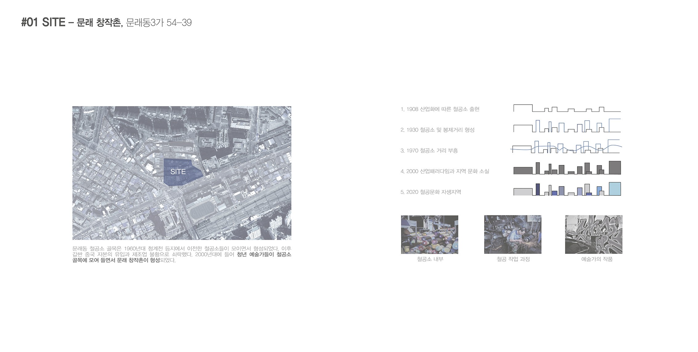 노후화 산업시설 중 하나인 ‘문래동 창작촌’은 철공 활동이 가지는 예술적 가능성과 예술가들이 모여 형성된 창조적인 분위기를 정체성으로 가지는 장소이다.