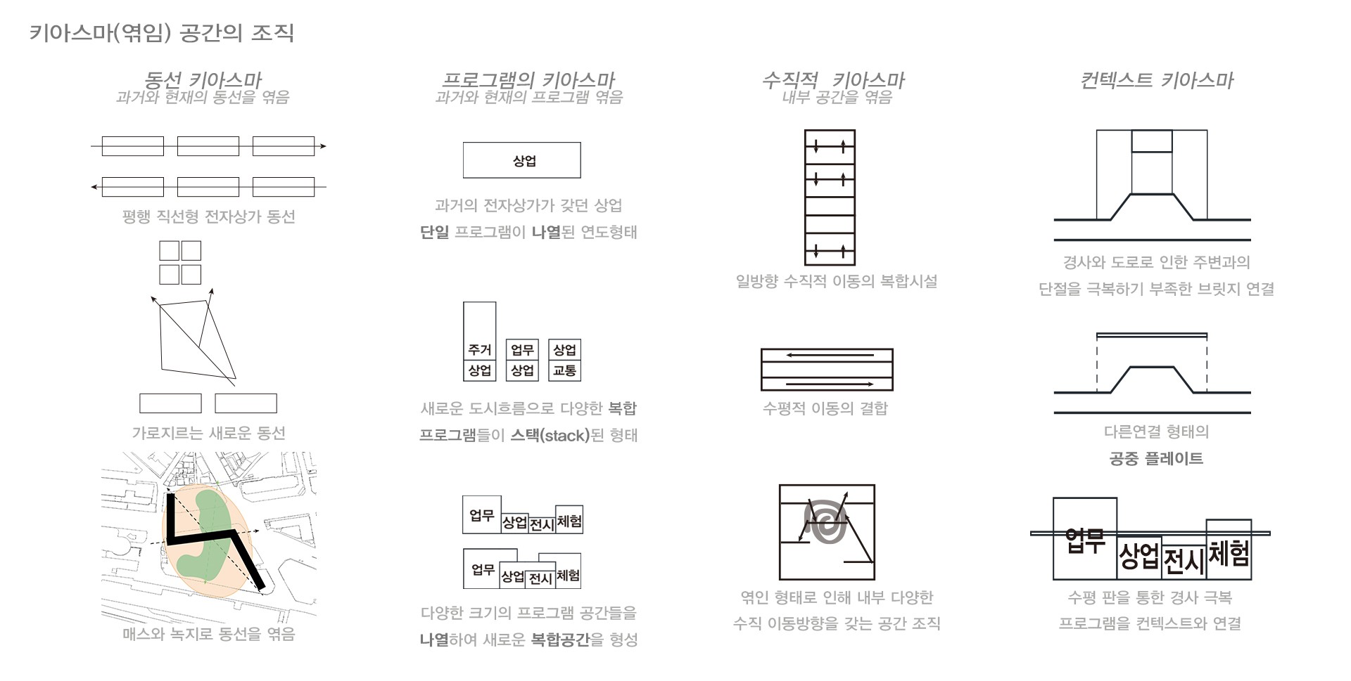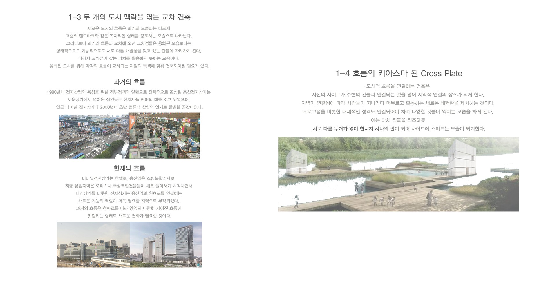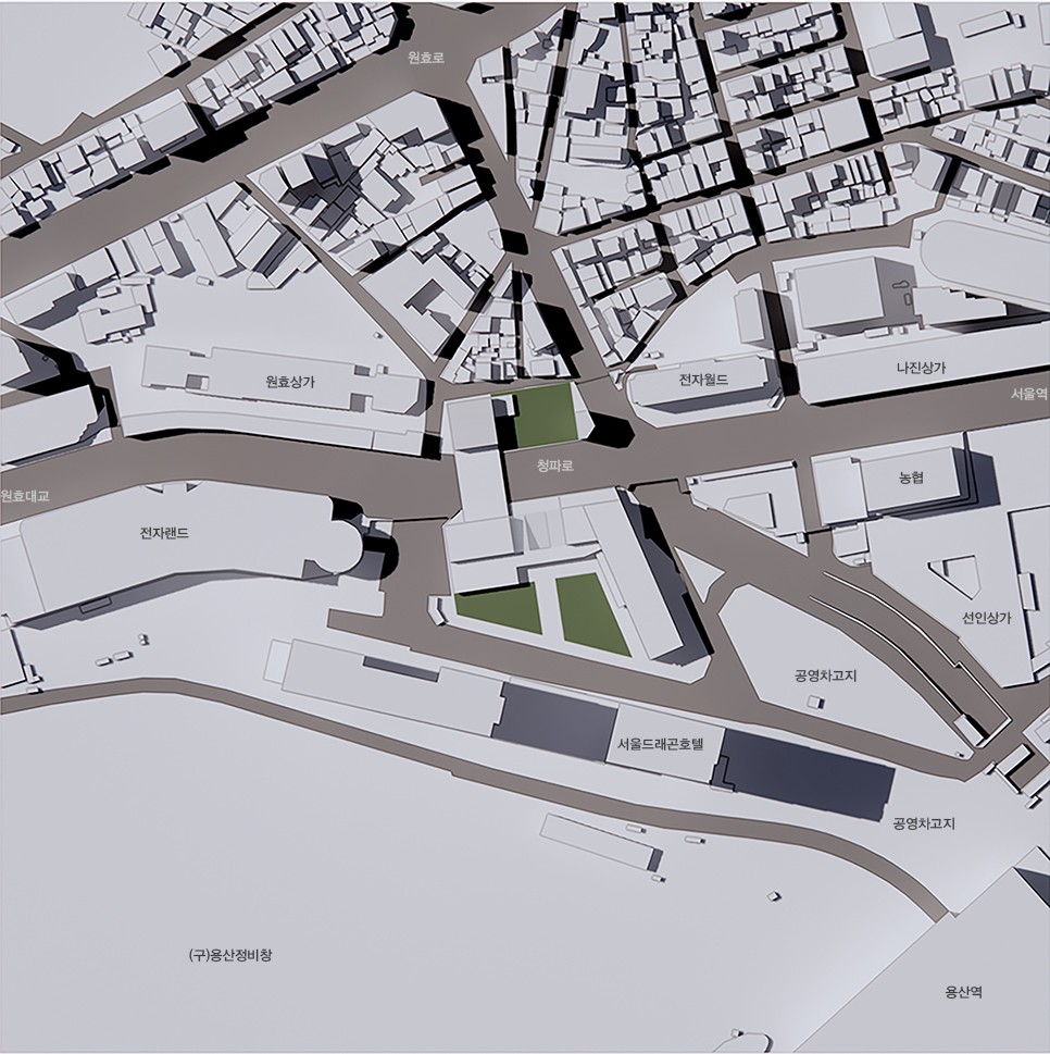 따라서 '흐름의 엮음'을 통해 조직된 ‘Cross Plate’는 이 지역의 키아스마가 되어 사이트를 기준으로 나뉜 양쪽의 다른 모습을 엮으며, 도시 흐름의 교차점으로 조성한다.