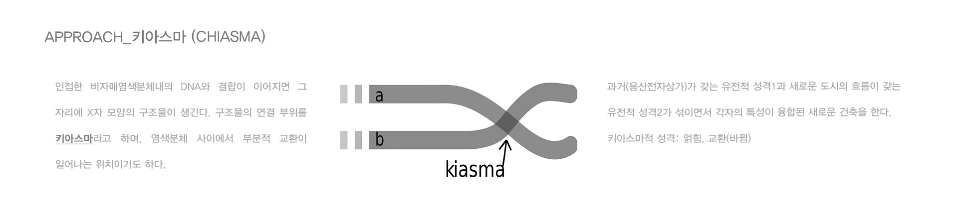 염색체가 접합되며 X자 모양을 만들고, 교차가 일어난 연결부위를 '키아스마'라 한다.