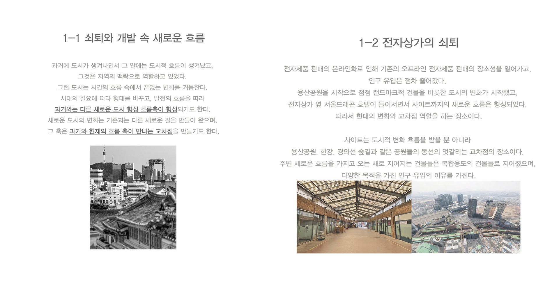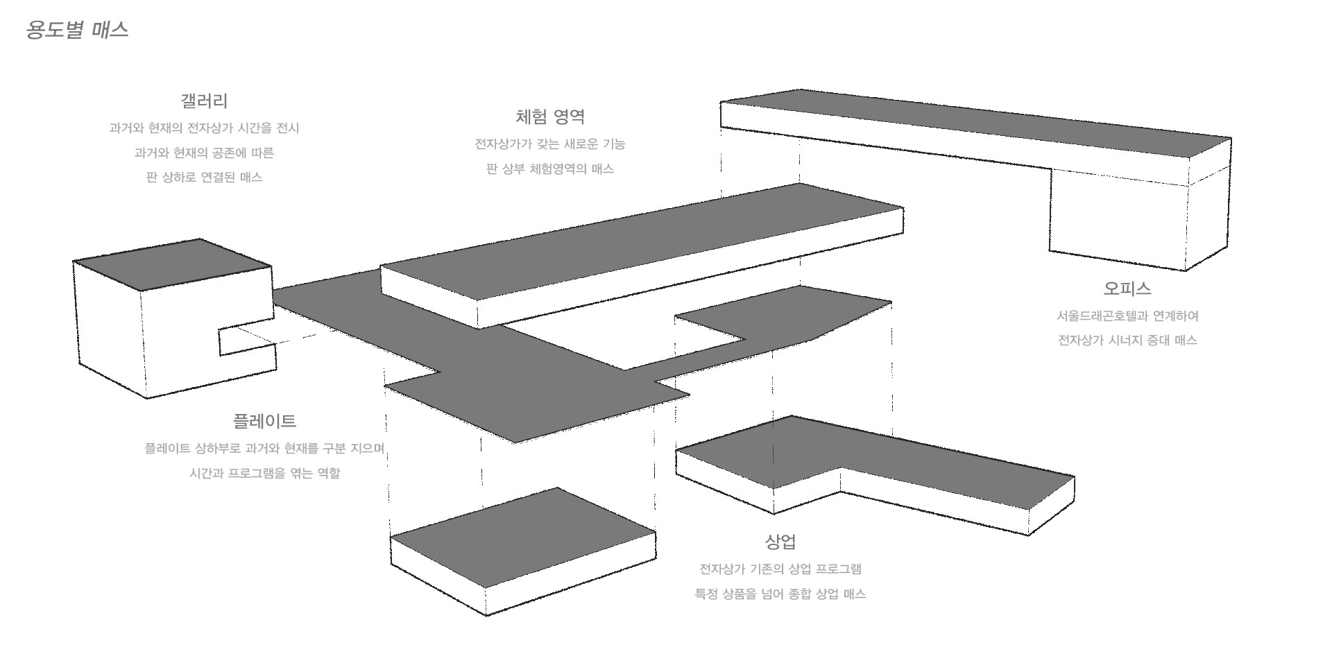 이러한 도시와 시간의 흐름을 부드럽게 연결하고 기존의 오프라인 판매시설을 탈바꿈하여 오프라인만 가질 수 있는 기존과 다른 특성을 가진 새로운 공간 제안이 필요하였다.