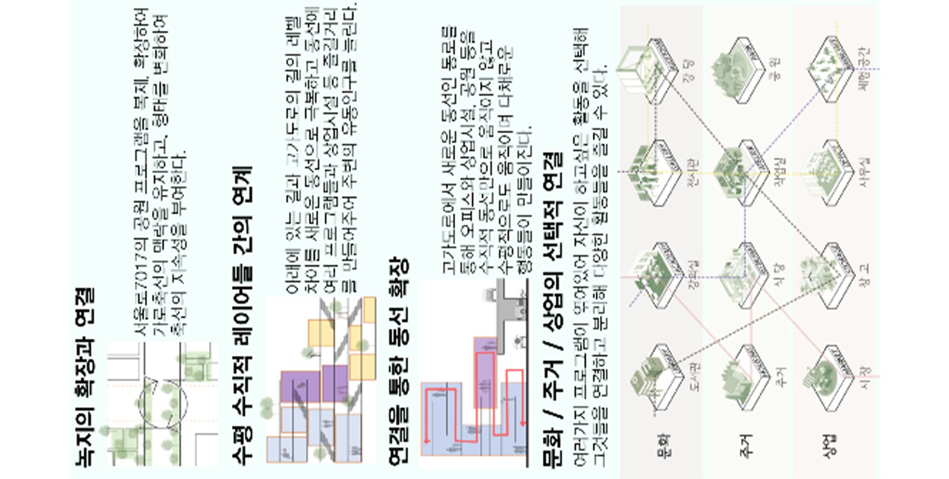 서울로7017은 현대시대 두 가지의 전혀 다른 시간의 축선을 연결하여 디자인으로 승화시킨다.