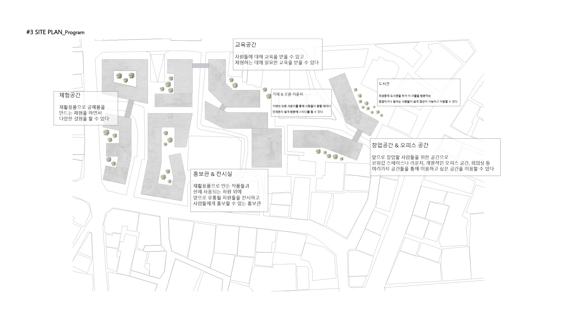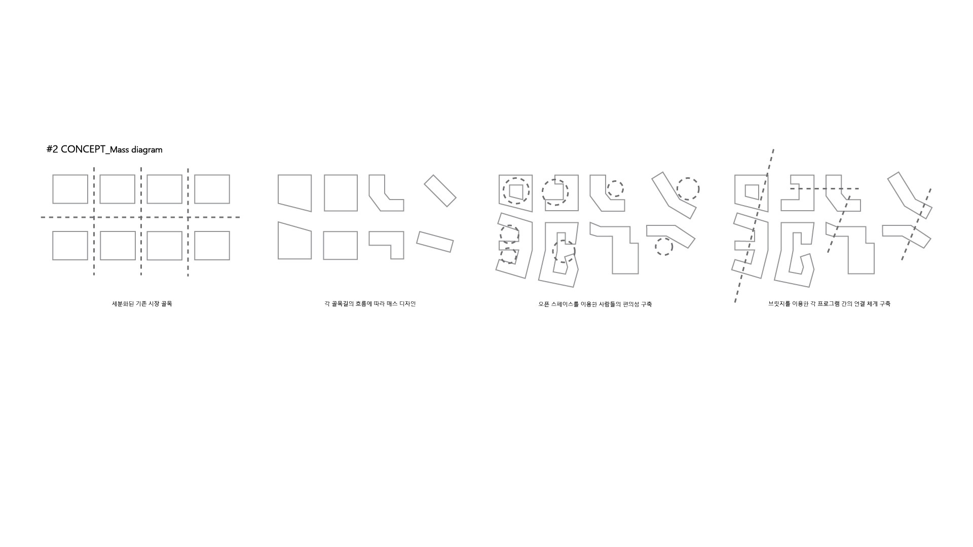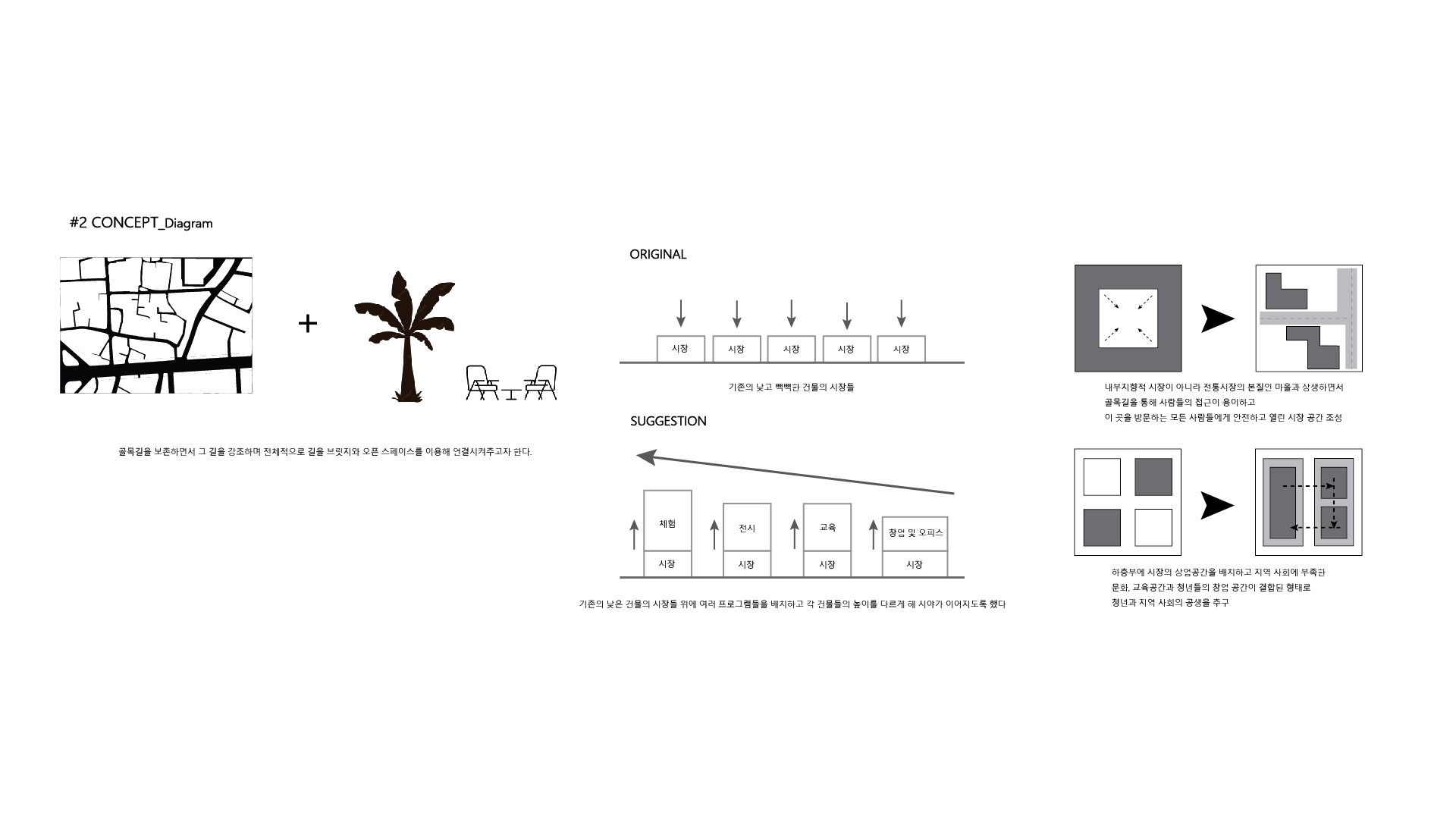 앞으로의 시장에 대해 과거로 돌아가서 오늘날의 시장을 다시 바라보는 시각이 필요하다. 현재 시장은 도심 속에 위치하는데도 불구하고 낮과 밤의 사용성에 있어서 문제가 제기되며 과거 자유롭고 가변적으로 움직이던 시장의 향수를 가져와 다방면으로 사용이 가능하고, 지속 가능한 시장의 형태가 필요로 하고 이를 넘어 모두가 이용하는 녹지를 이용한 fun place를 제안한다.