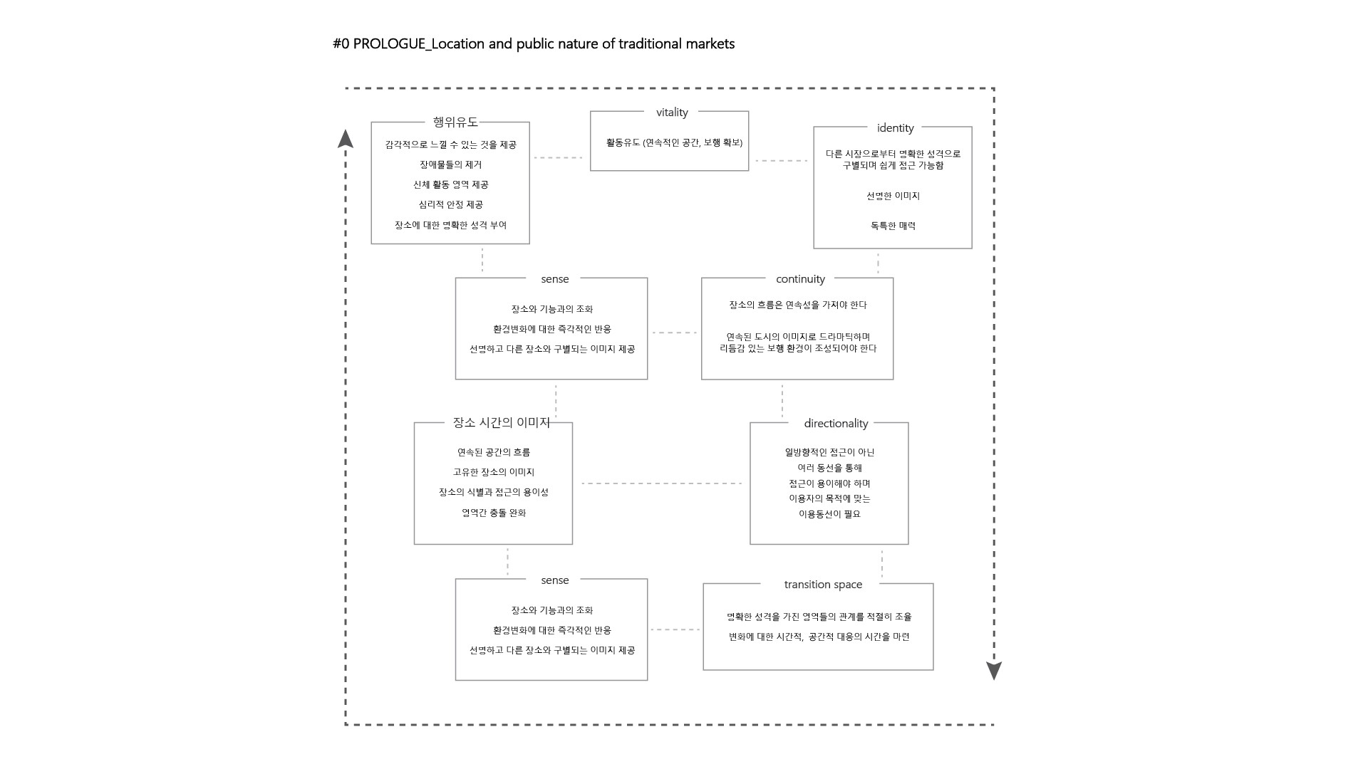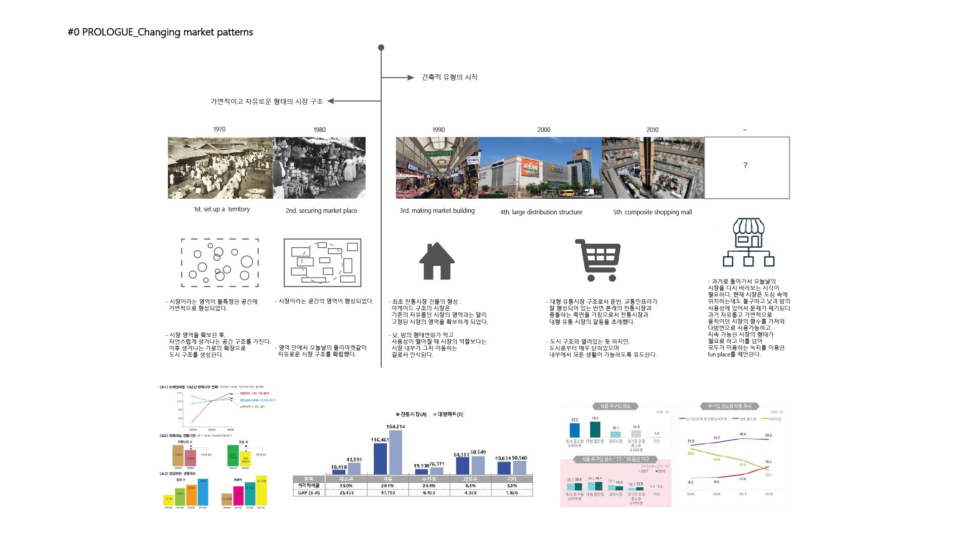 1970년대에 시장이라는 영역이 불특정한 공간에 가변적으로 형성되었다. 시장 영역을 확보한 후, 자연스럽게 생겨나는 공간구조를 가졌고 이후 생겨나는 가로의 확장으로 도시 구조를 생성했다. 1980년대에는 시장이라는 공간의 영역이 형성되었고 영역 안에서 오늘날의 플리마켓같이 자유로운 시장 구조를 확립했다. 1990년대부터는 건축적 유행이 시작되면서 최초의 전통시장 건물이 형성되었다. 아케이드 구조의 시장은 기존의 자유롭던 시장의 영역과는 달리 고정된 시장의 영역을 확보하게 되었다. 하지만 낮과 밤의 형태변화가 적고 사용성이 떨어질 때 시장의 역할보다는 시장 내부가 그저 이동하는 길로서 인식되었다. 2000년대부터 2010년대 사이에는 대형 유통시장 구조로서 운반과 교통인프라가 잘 형성되어 있는 반면 본래의 전통시장과 충돌하는 측면을 가짐으로서 전통시장과 대형 유통 시장의 갈등을 초래했다. 이러한 시장의 형태는 도시 구조와 열려 있는 듯 하지만, 도시로부터 매우 닫혀있으며 내부에서 모든 생활이 가능하도록 유도했다.