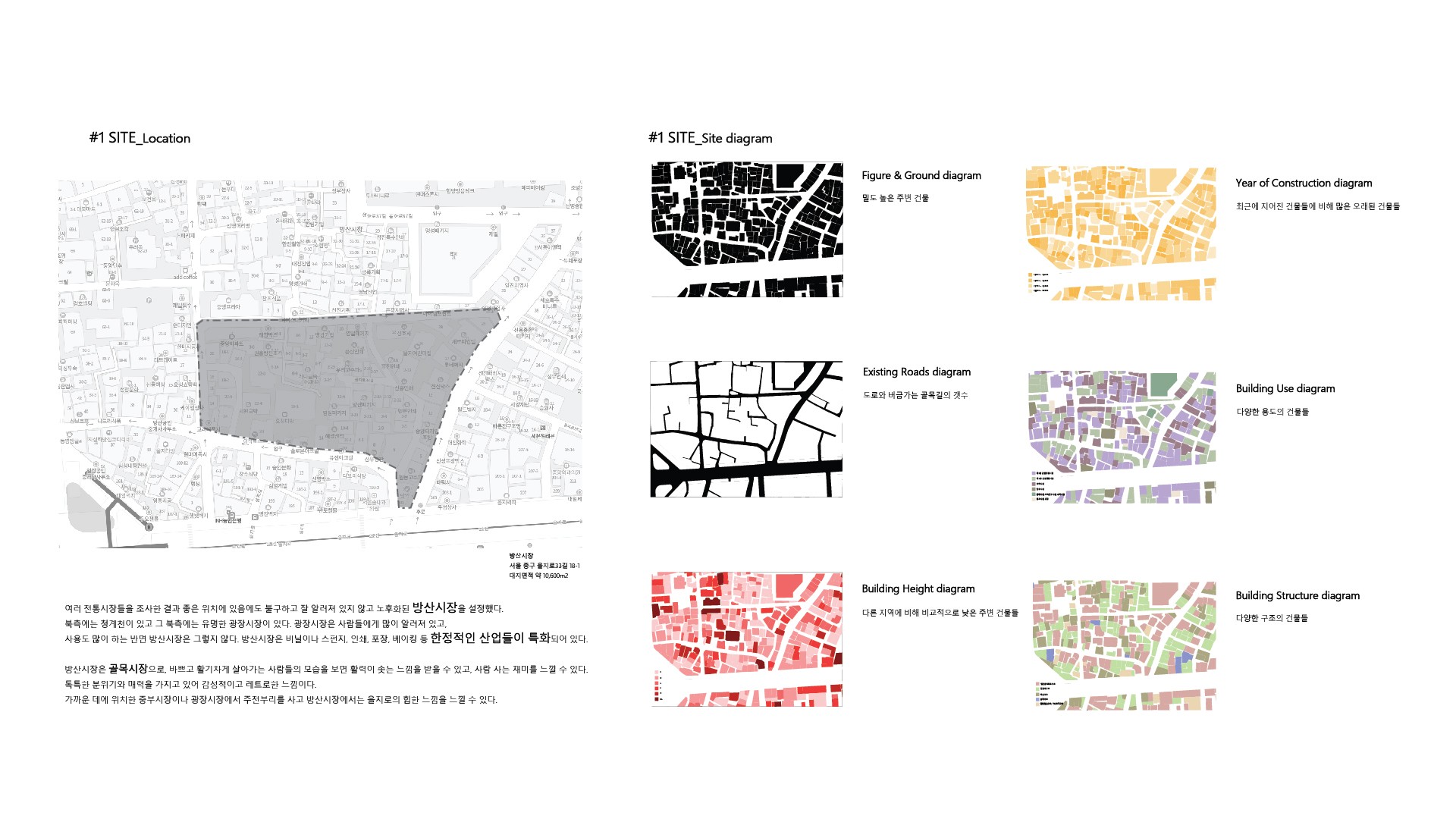 여러 전통시장들을 조사한 결과 좋은 위치에 있음에도 불구하고 잘 알려져 있지 않고 노후화된 방산시장을 설정했다. 북측에는 청계천이 있고 그 북측에는 유명한 광장시장이 있다. 광장시장은 사람들에게 많이 알려져 있고, 사용도 많이 하는 반면 방산시장은 그렇지 않다. 방산시장은 비닐이나 스펀지, 인쇄, 포장, 베이킹 등 한정적인 산업들이 특화되어 있다. 방산시장은 골목시장으로, 바쁘고 활기차게 살아가는 사람들의 모습을 보면 활력이 솟는 느낌을 받을 수 있고, 사람 사는 재미를 느낄 수 있다. 독특한 분위기와 매력을 가지고 있어 감성적이고 레트로한 느낌이다. 가까운 데에 위치한 중부시장이나 광장시장에서 주전부리를 사고 방산시장에서는 을지로의 힙한 느낌을 느낄 수 있다.