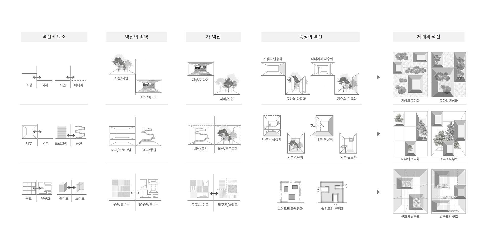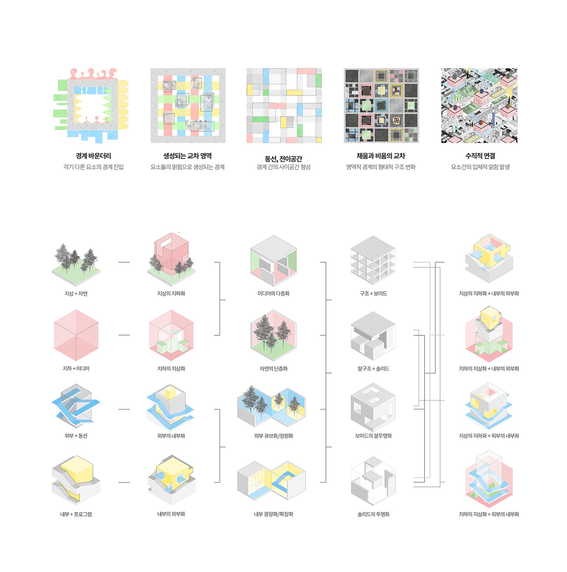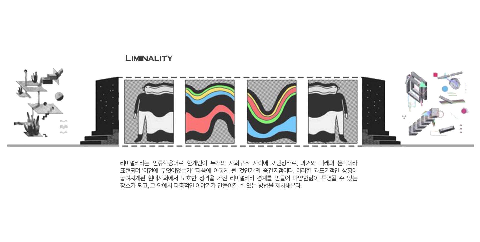 유니버셜의 닫힌 공간에 치중되어 있었다면 모호한 성격을 가진 리미널리티 경계를 만들어 그 안에서 우리는 다층적인 이야기가 만들어질 수 있는 방법을 제시해 봤다. 경계의 모호성을 만들기 위해서 생각했던 것은 ‘반전된 체계의 얽힘’으로 단순히 체계들을 얽히게 하는 것이 아니라 반전된 체계들을 통해 예상치 못한 다양한 영역을 마주하게 되고 각각의 기존 구조를 해체하고 탈피하면서 다층적으로 새롭게 재구성 될 수 있는 경계를 만들고자 한다.