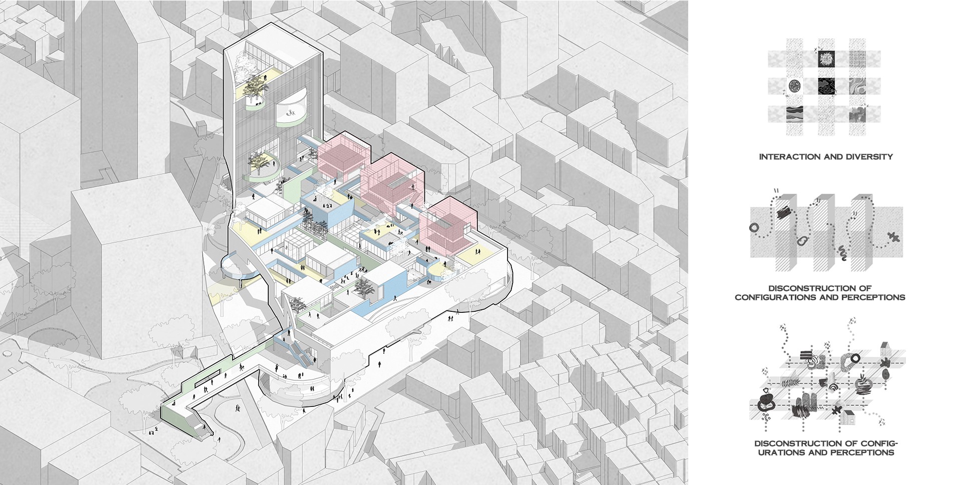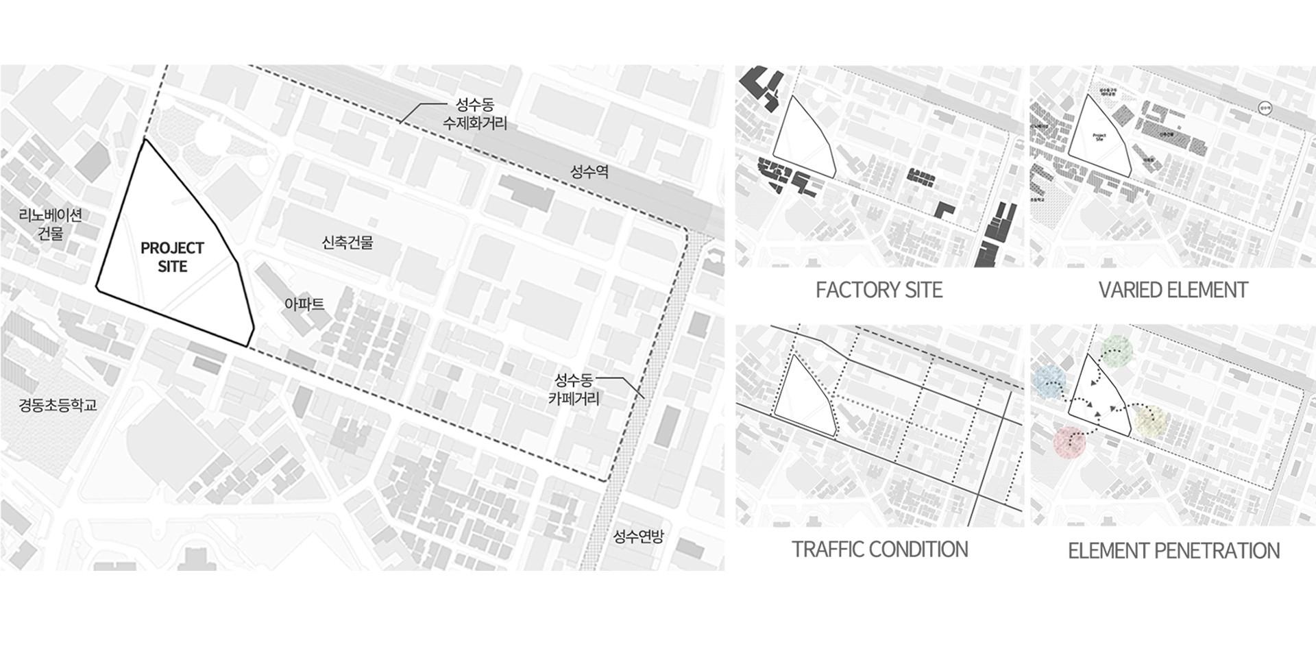 다양한 성격의 건물들이 복합적으로 분포되어있는 성수 연무장길 일대는 기존의 정체성을 탈피하고 다양한정체성들이 서로서로 침투되어 새롭게 얽힐 수 있는 경계로서 다중심적인 관계를 형성 할 수 있는 가능성의 장소인 성수연무장길을 대상지로 선정하였다. 다양한 객체가 능동적으로 상호침투하도록 지속적인 접속을 이끌어내는 경계를 마련하고, 그 위에 다양한 프로그램을 중첩적으로 담도록 대지를 새롭게 조직하는 다층적 공간을 제시한다. 이러한 모호한 경계를 통해 우리의 초연결은 우리가 사는 세계처럼 다양한 정체성을 가진 다양한 차원들이 스스로 무한한 콘텐츠를 생산 유통하며 새로운 이야기를 생성하는 능동적인 도시 공동체 네트워크를 구축할 것이다.