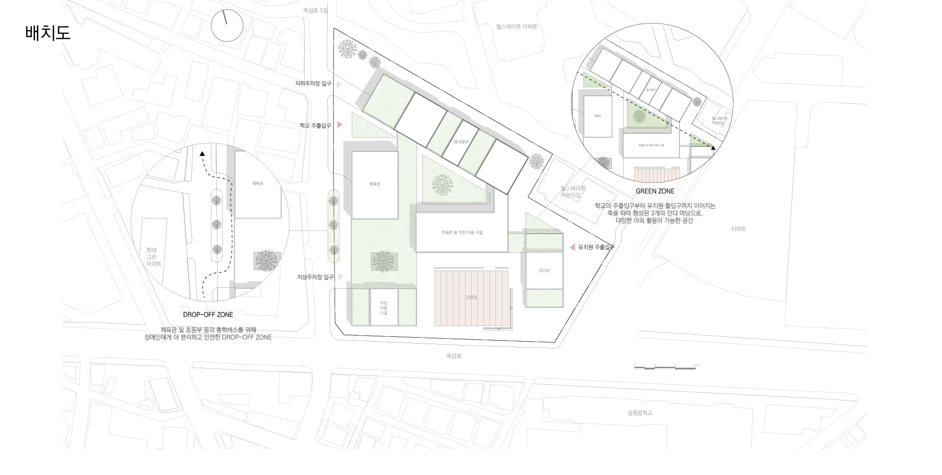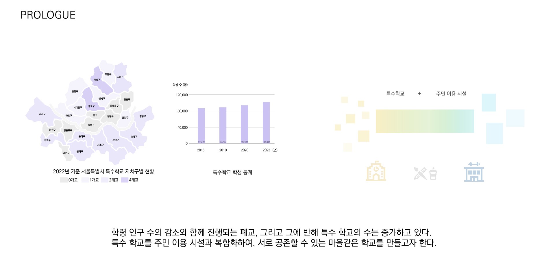 버려지는 학교를 특수 학교로 재탄생 시킴으로써, 특수 학교 학생들의 사회화와 더불어 학교를 교육하는 공간으로만 한정짓는 것이 아닌, 지역 주민들 모두가 함께 이용할 수 있는 공간으로 만들고자 했다.