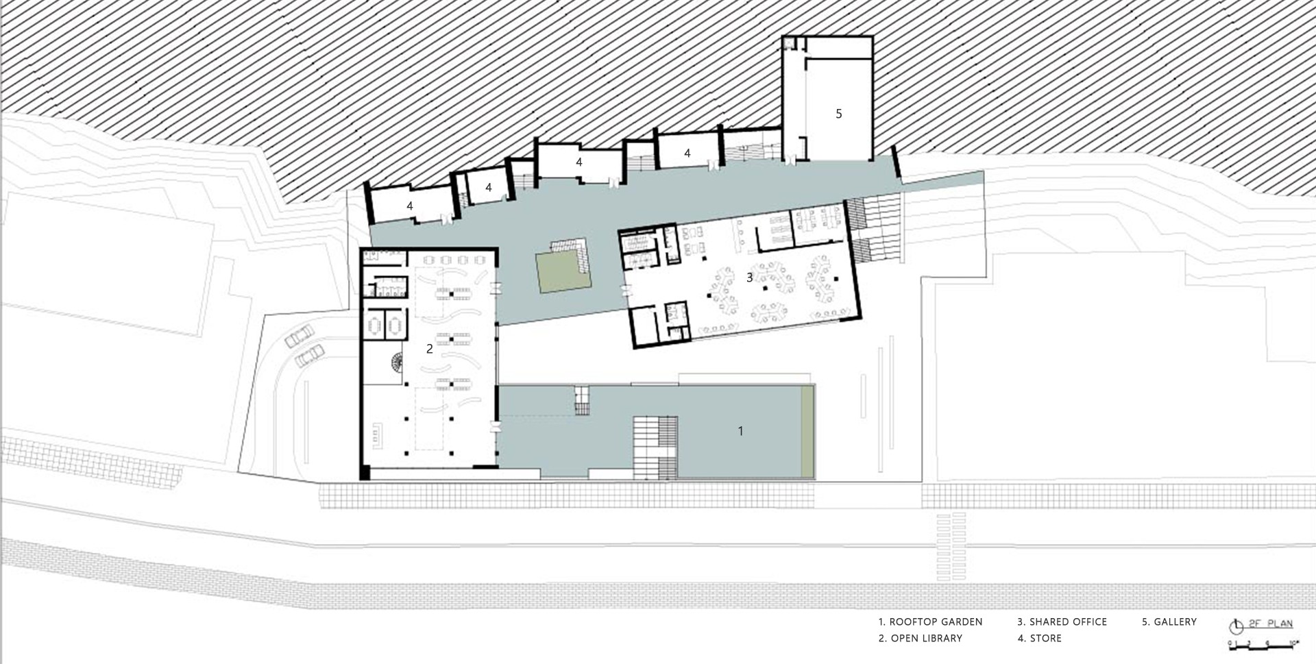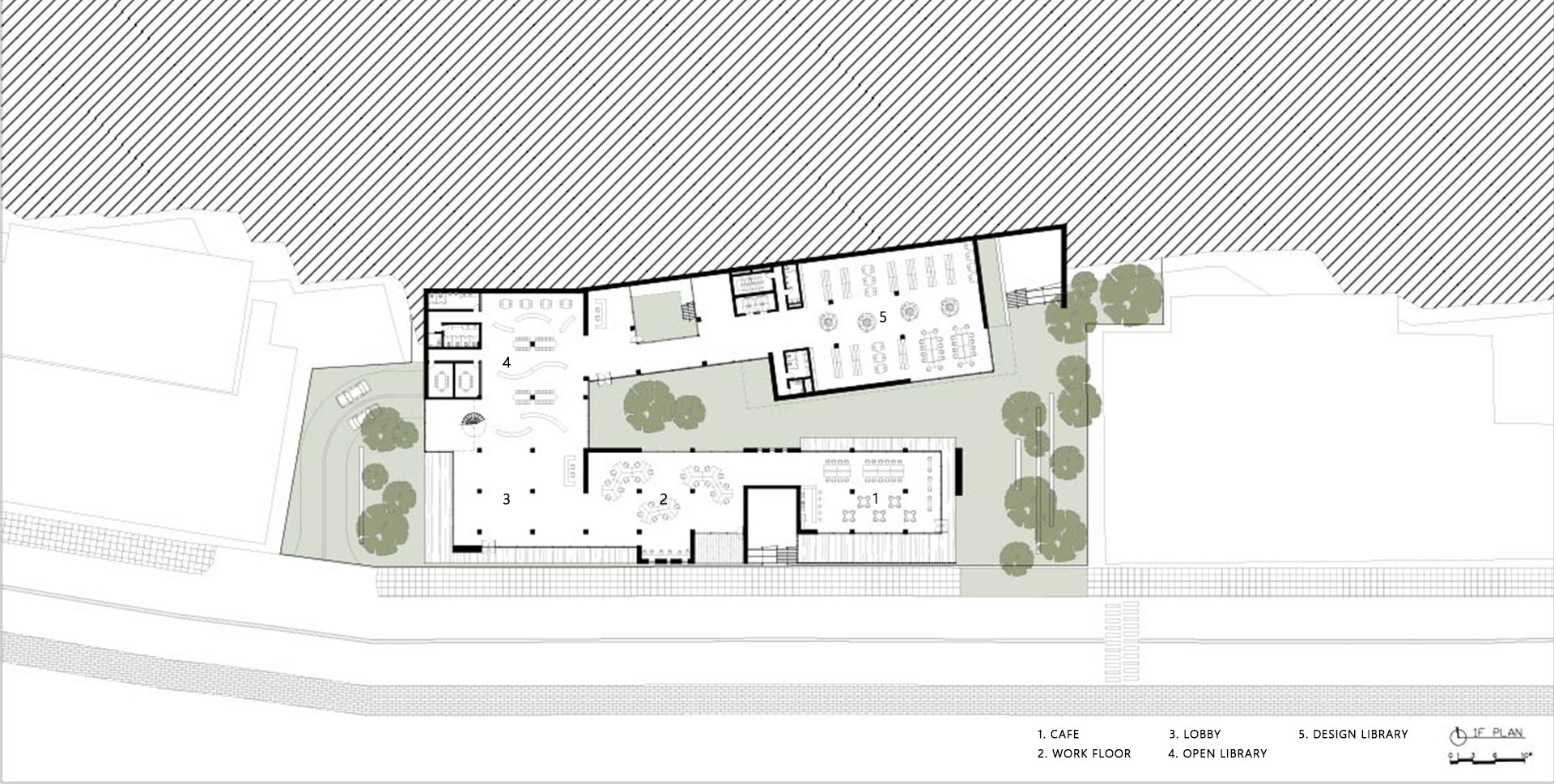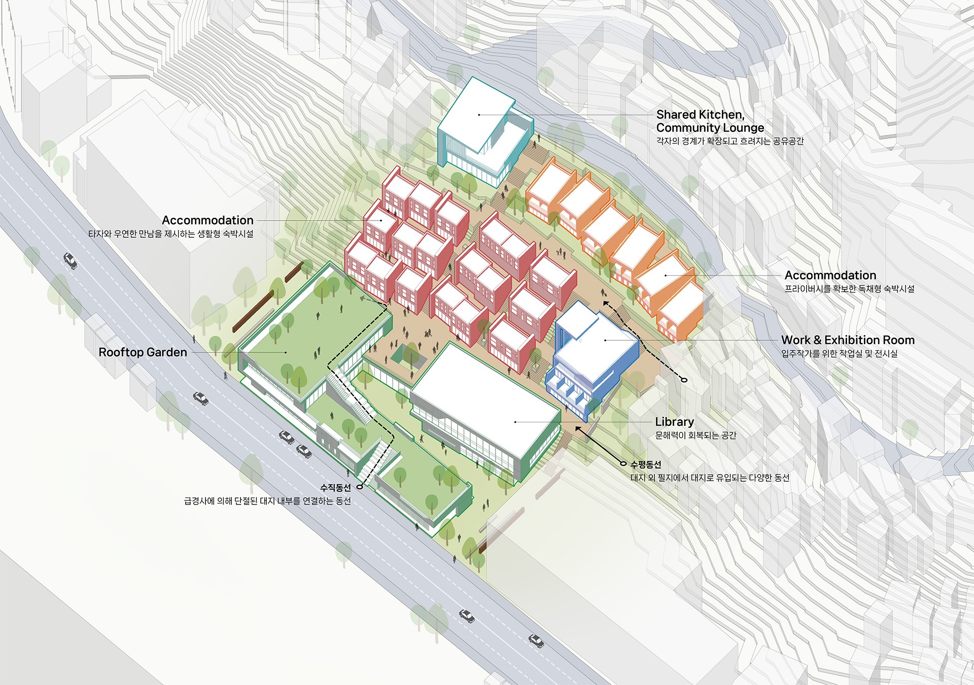 워케이션 센터에서 가장 핵심적인 프로그램은 도서관과 숙박 시설이다. 현재의 디지털 노마드를 이전 세대보다 많이 아는 최초의 세대라고 부르기도 한다. 교과서나 책으로 읽거나 어른들에게 지식을 전수받기 이전에 영유아 때부터 넘쳐나는 정보와 검색에 익숙해져 새롭게 무엇을 배우고 깨닫는 과정 자체가 생략되기 때문이다. 이러한 정보성때문에 책을 읽지 않고 필기조차 익숙하지 않게 되는 과도한 기술 의존성의 폐해가 나타날 수 있다는 문제도 제기되지만 한편으로는 많은 정보가 기정사실이라면 정보를 어떻게 이해하고 판별할 것인가 하는 문해력(literacy)이 또 다른 가치로서 중요해지는 시대가 되었다. 비단 문해력이 정보 해독력만을 의미하는 것이 아니다. 문해력은 맥락을 파악하는 능력이며 타인의 의도를 읽는 능력이다. 타인의 의도를 읽는 것은 타자에 대한 이해로 이어진다. 타자에 대한 이해가 없는 사회는 단절되고 만다. 현대 사회에서 문해력은 더 이상 개인의 문제가 아니라 공동체의 필수적 역량이다. 공공도서관은 문해력을 회복할 수 있는 공간이자 어린이, 청년, 성인, 노인이 모두 함께 어울릴 수 있는 공동체 공간으로 타인과 스치고 마주치며 다른 삶의 면면을 곁눈질로 보는 곳이기도 하다. 공공도서관의 공공성의 핵심은 무차별성에 있다. ‘모두’에는 제한이 없어야 한다. 여행 온 사람일지라도 도서관을 이용할 수 있어야 한다. 따라서 숙박시설과 도서관이 결합된 형태의 워케이션 센터라면 외부인의 도서관 이용이 극대화됨으로 인해 도서관의 공공성이 실현될 것이고 타자와의 우연한 만남이 극대화될 것이다.