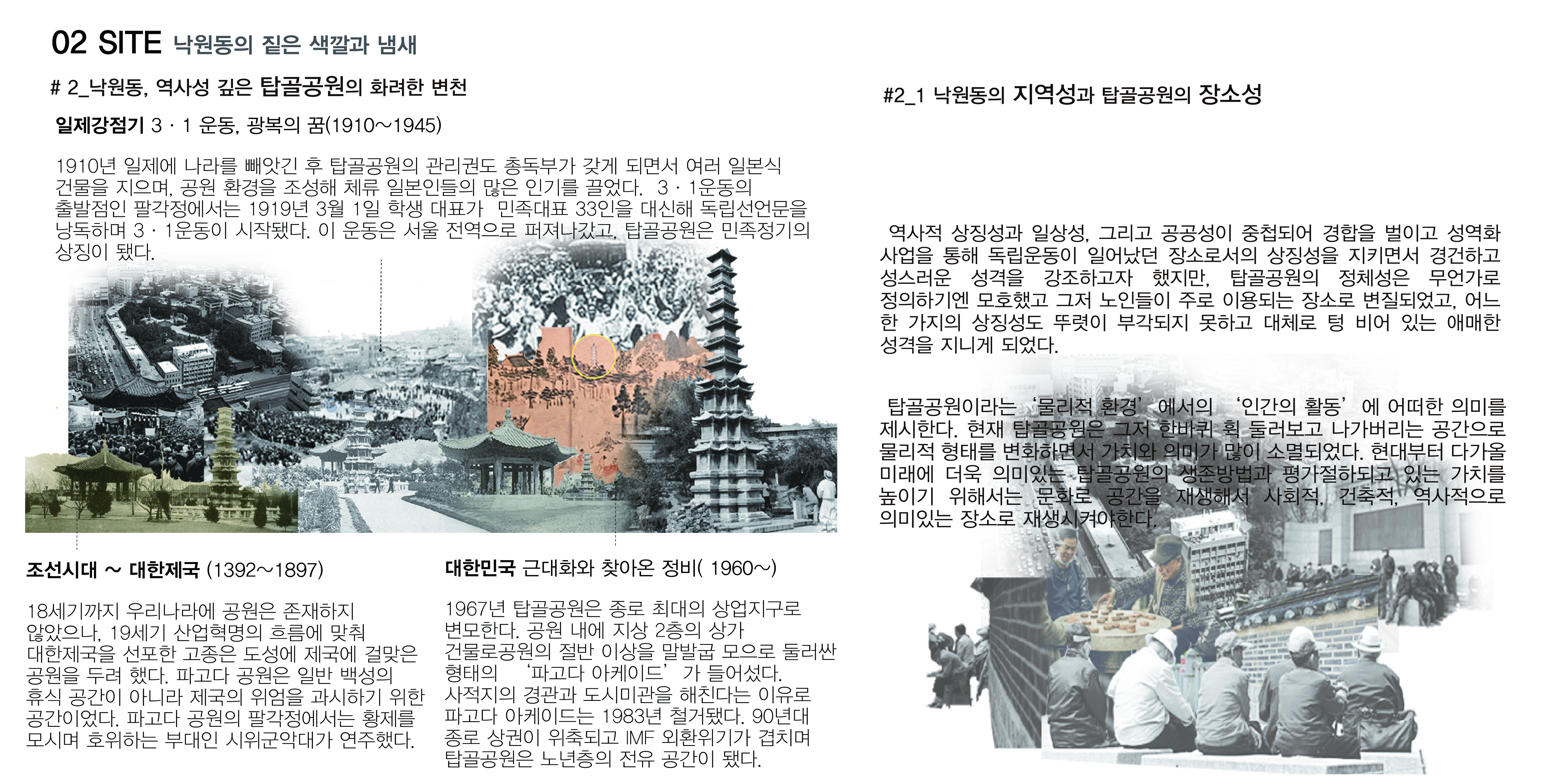 현대부터 다가올 미래에 더욱 의미있는 탑골공원의 생존방법과 평가절하되고 있는 가치를 높이기 위해서는 문화로 공간을 재해석해서