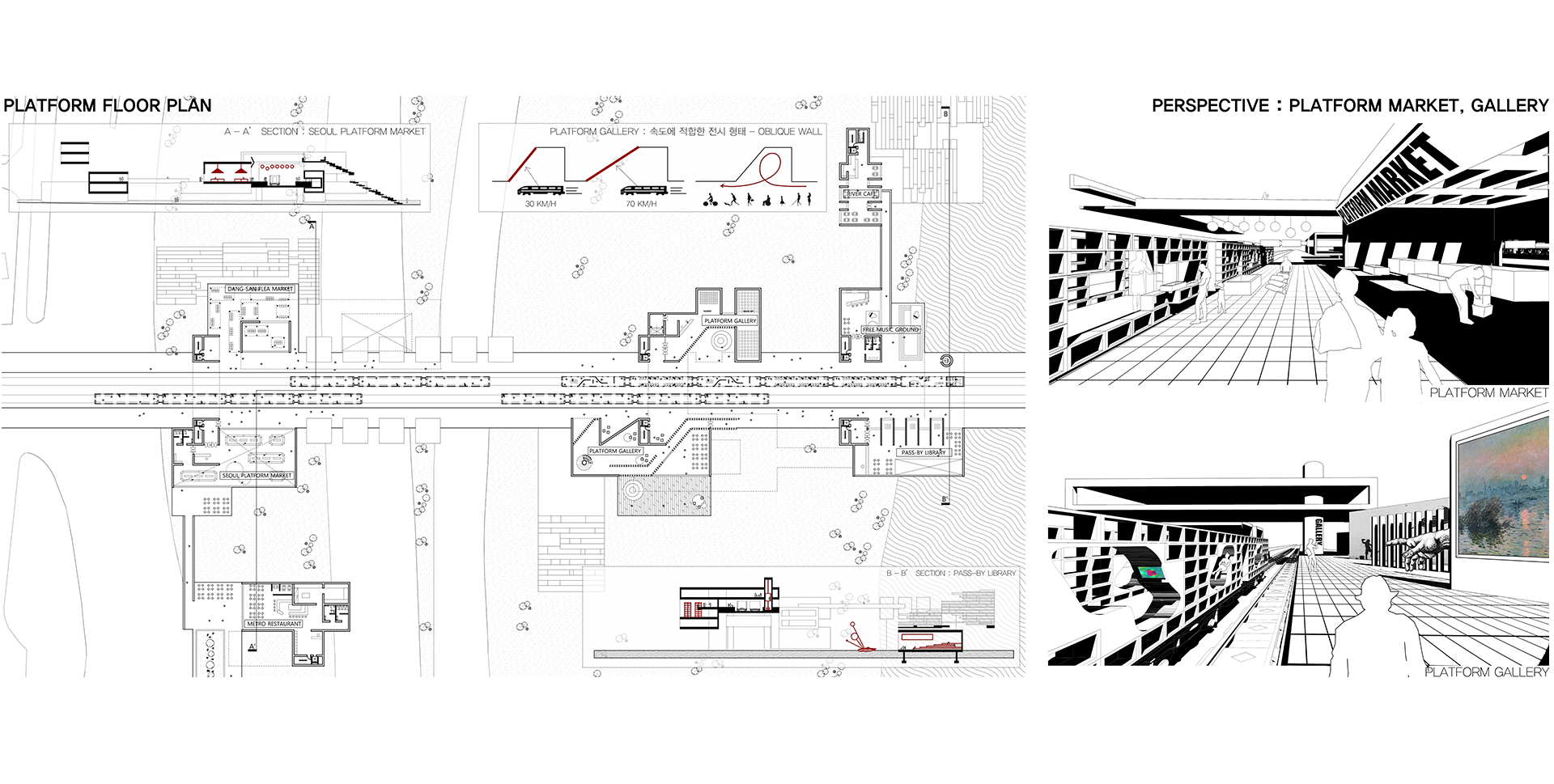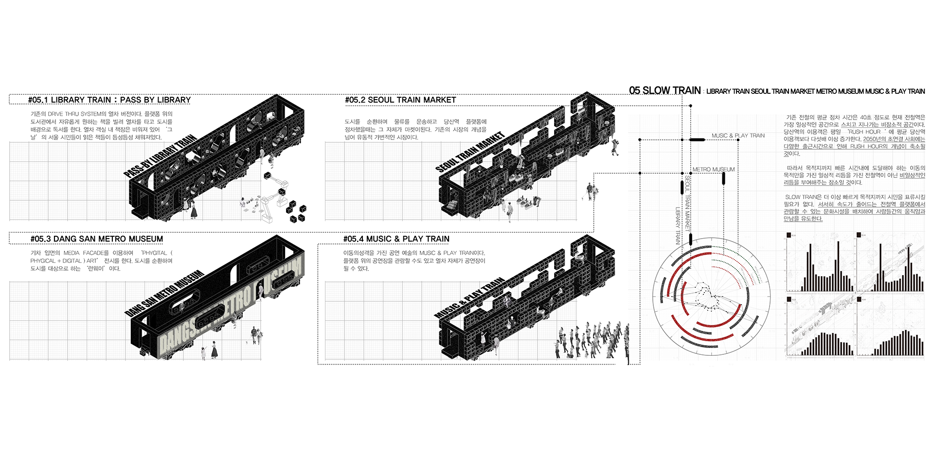 2050년 서울에는 현재 도심내의 ‘가로’의 공간 형태가 도로중심이 아닌 철로 중심으로 형성될 것이다. 기존의 전철역은 티켓이 필요한 플랫폼으로 인해 도시와 공간적으로 분리되어 있다. 하지만 초지능 사회인 2050년에는 티켓부스, 개찰구가 사라진 외부와 적극적으로 관계하는 전철역이 될 것이다(TAGLESS SYSTEM). 따라서 철도는 지역의 관문이자, 연결하는 노드에 국한되는 것이 아닌 다양한 주체 간의 교감과 공감이 이루어지는 장 이된다.