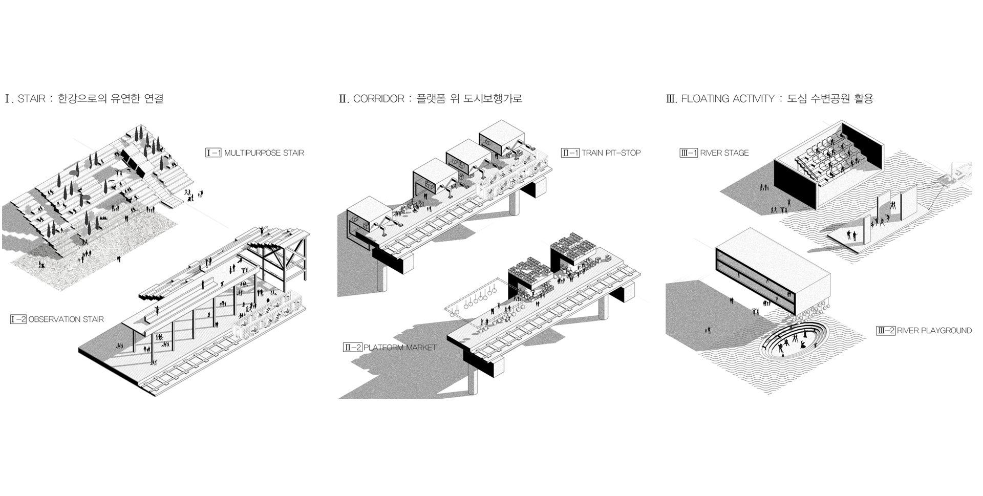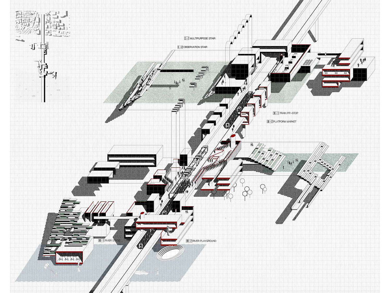 흐름의 중첩점이 가진 잠재력을 이용해 기존의 남아있는 인프라스트럭처를 이용하여 도시의 사회적 낭비와 단절을 해결할 수 있다. - INFRATECTURE (INFRA + ARCHITECTURE)