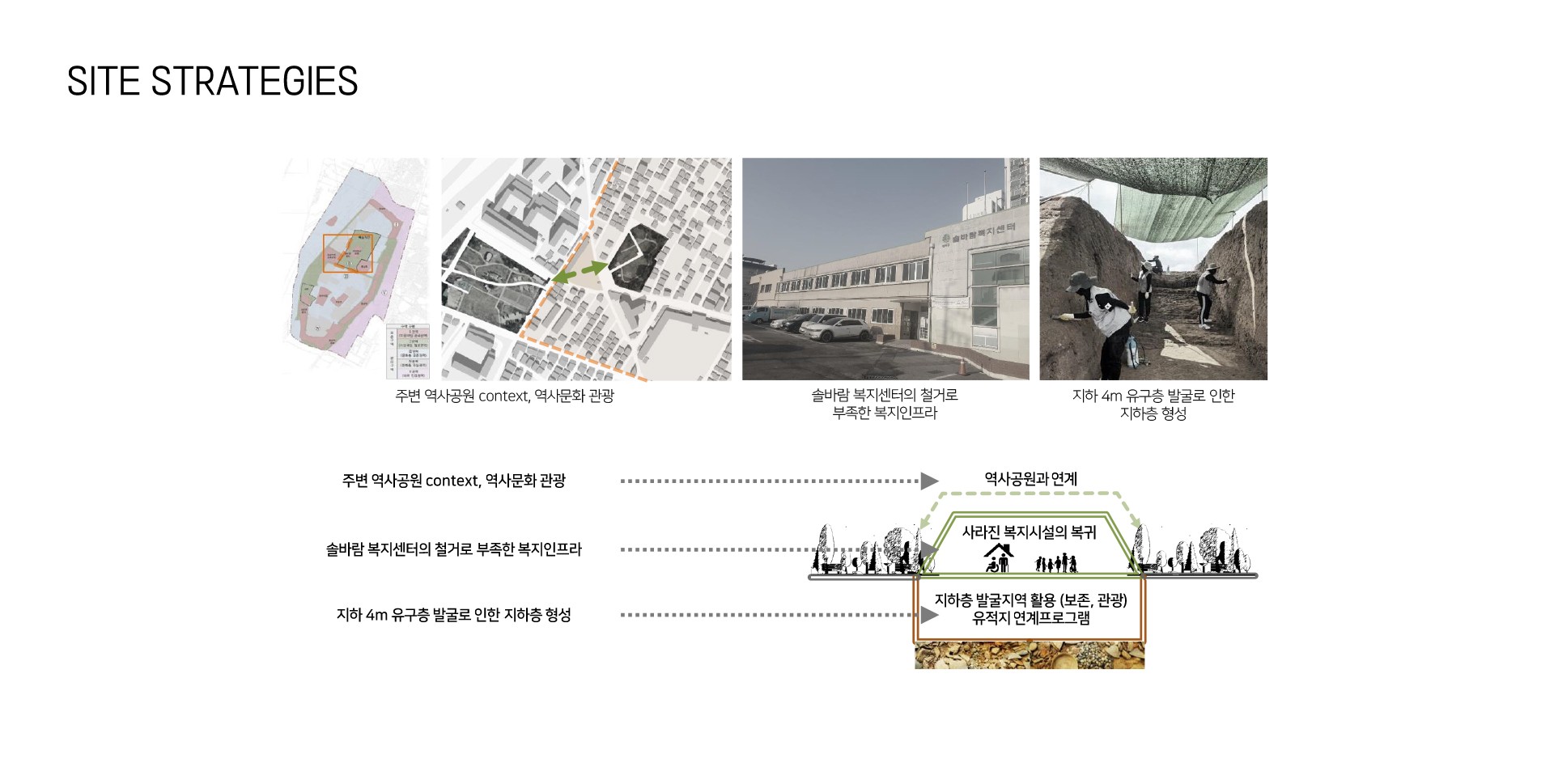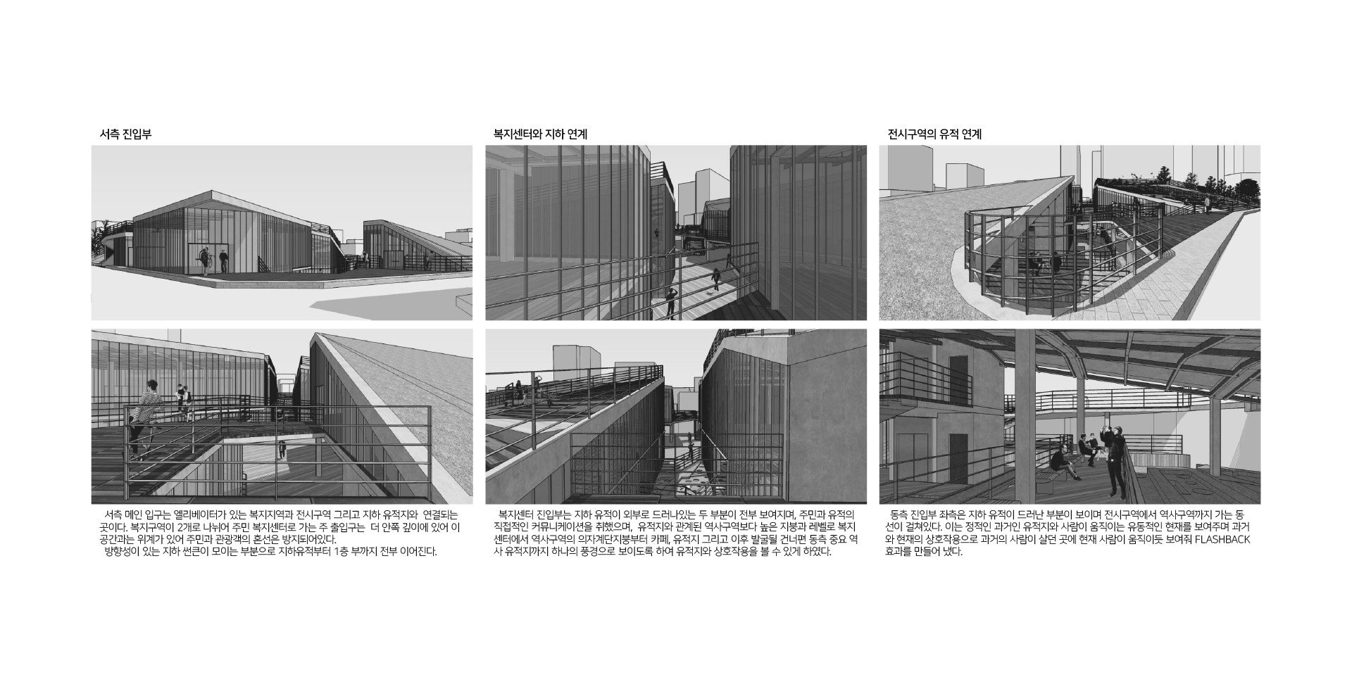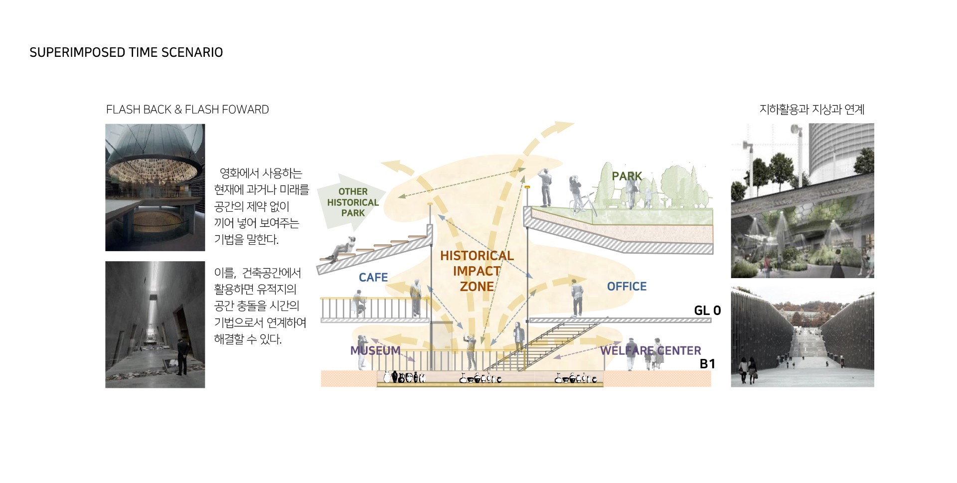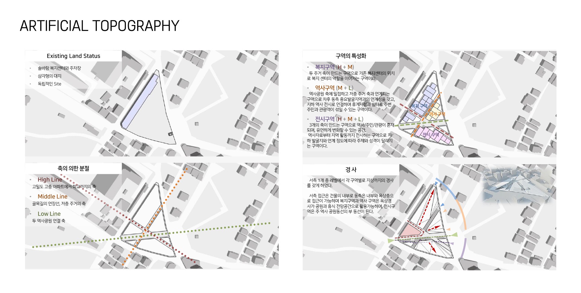 그래서 유적지와 현재의 유적지가 관계를 맺는(Topology)을 이용해 유적지와 현재의 지역사회를 잇는 비어있는 공간을 구성하였다. 주변의 다른 유적지를 직접적으로 잇는 공간과 지역사회의 골목길은 관계를 맺는 공간이 될 수 있는 만큼 빈공간으로 구성하고 이 공간에서 지역사회와 유적지가 거리, 실내외여부 거리, 시각적 물리적 연결을 이 빈공간에서 이루면서 과거와 현재의 행위가 맺어지고 이둘이 단절된 공간에서는 힘든 현재의 지역사회가 있고, 거기에 관입된 과거도 스며들어 미래를 위한 영감이나 예측(FlashBack/Flashfoward)은 물론 본래의 역사공원역할도 가능한 공간을 만들어가고자 한다.