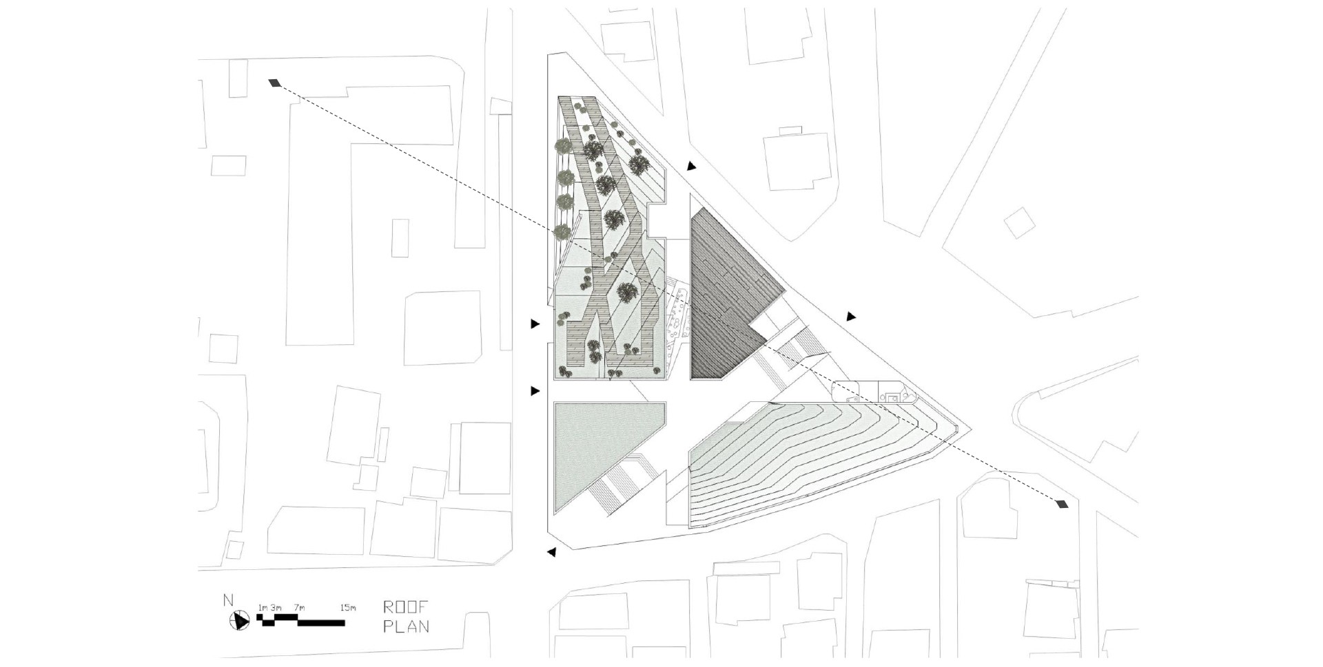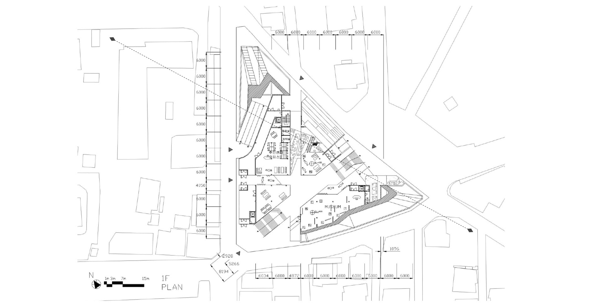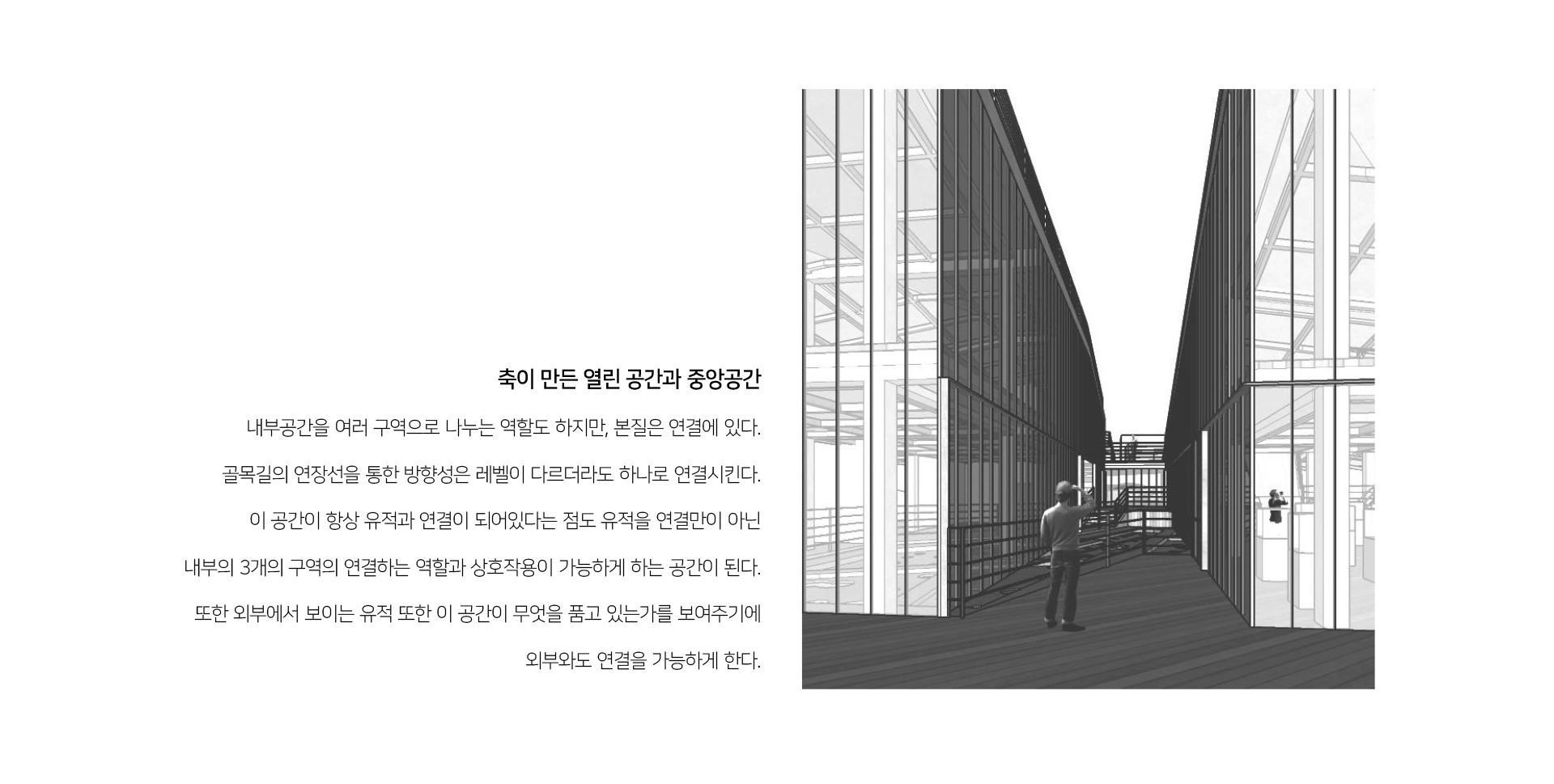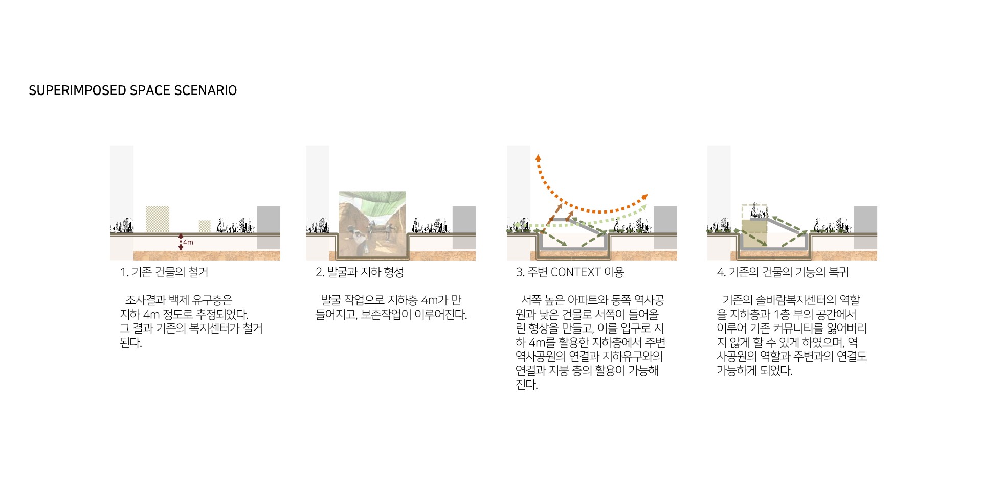 그래서 유적지와 현재의 유적지가 관계를 맺는(Topology)을 이용해 유적지와 현재의 지역사회를 잇는 비어있는 공간을 구성하였다. 주변의 다른 유적지를 직접적으로 잇는 공간과 지역사회의 골목길은 관계를 맺는 공간이 될 수 있는 만큼 빈공간으로 구성하고 이 공간에서 지역사회와 유적지가 거리, 실내외여부 거리, 시각적 물리적 연결을 이 빈공간에서 이루면서 과거와 현재의 행위가 맺어지고 이둘이 단절된 공간에서는 힘든 현재의 지역사회가 있고, 거기에 관입된 과거도 스며들어 미래를 위한 영감이나 예측(FlashBack/Flashfoward)은 물론 본래의 역사공원역할도 가능한 공간을 만들어가고자 한다.