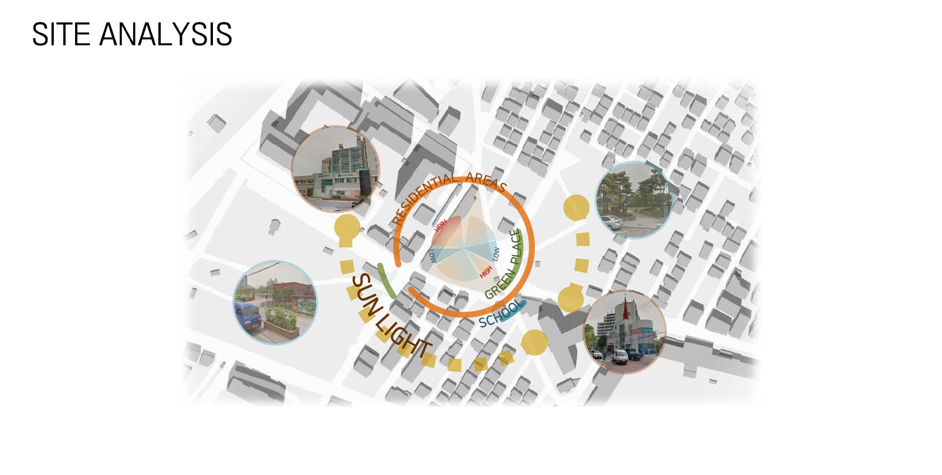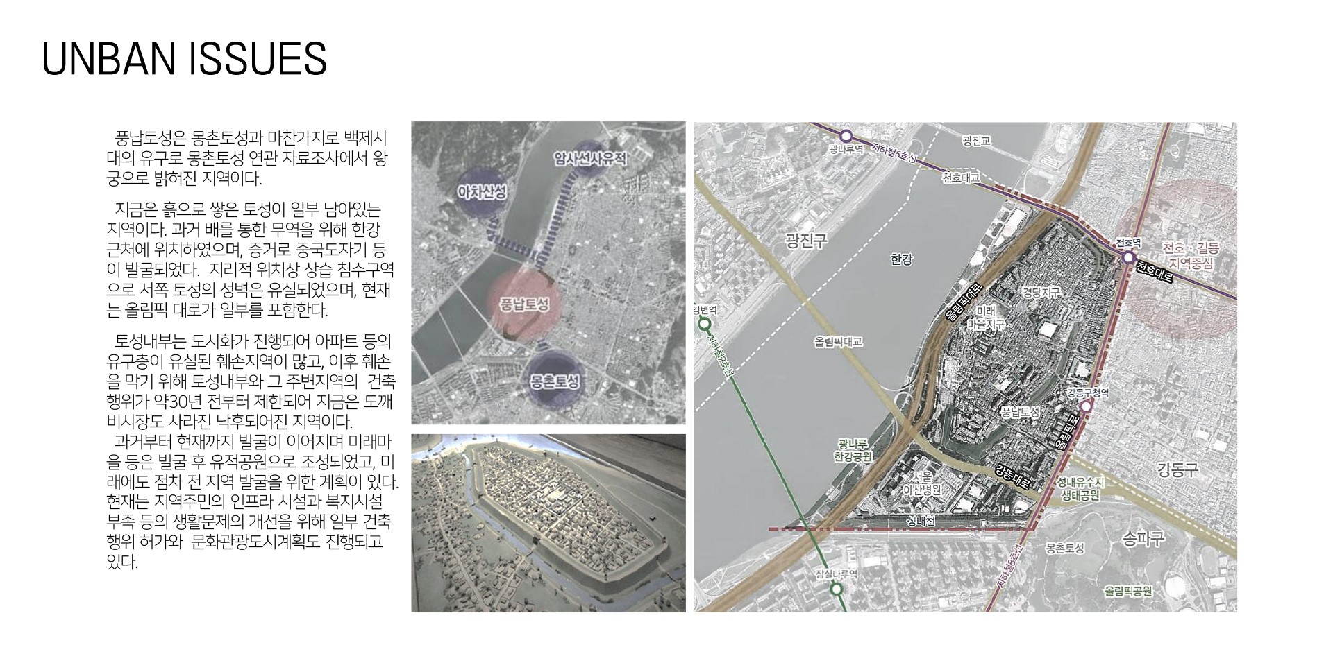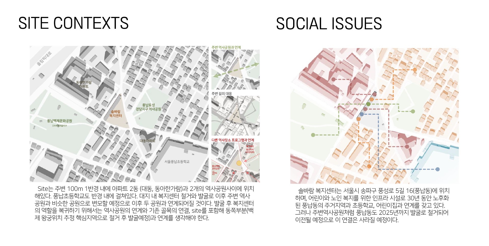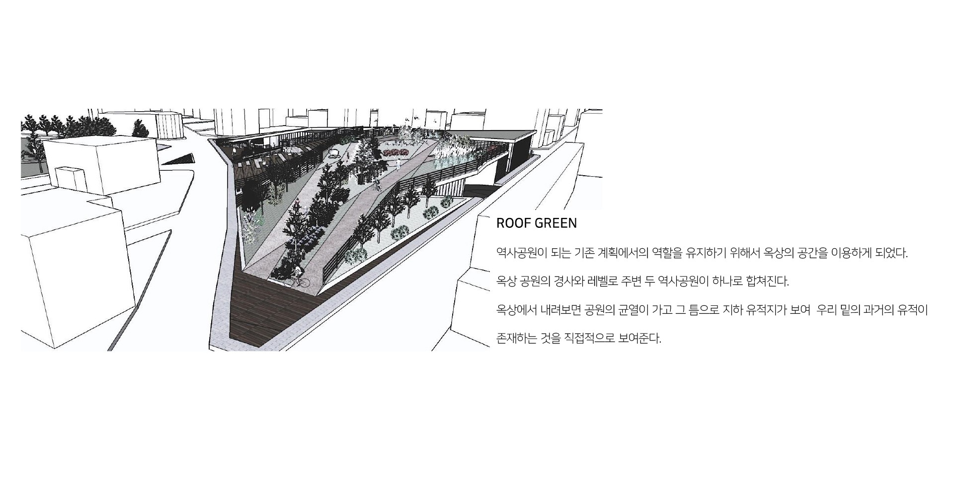 빈공간보다 그곳에서의 활동을 중요하게 생각해온 우리의 역사처럼 여러 행위가 일어나는 점에서 유적지 공원을 조성하는 것은 안좋은 생각이 아니기에 이 공원에 현재의 지역사회의 행위가 섞여 관계를 맺는 공원(Park)을 생각하였다.